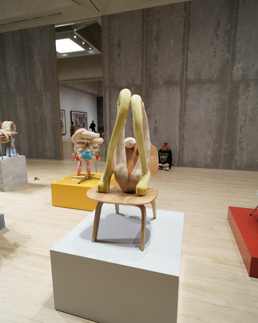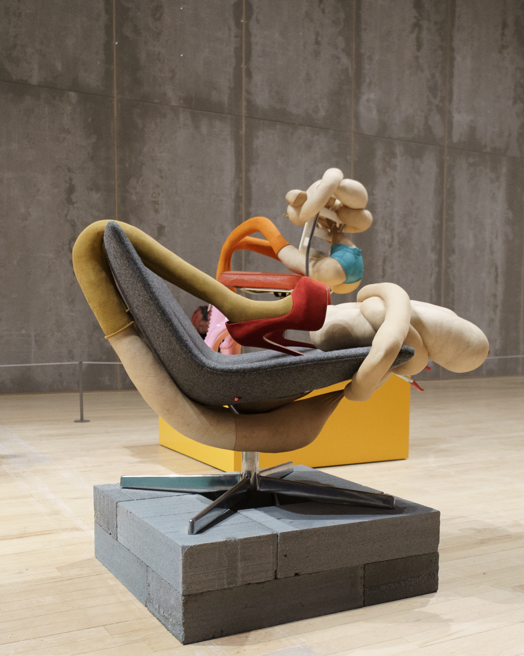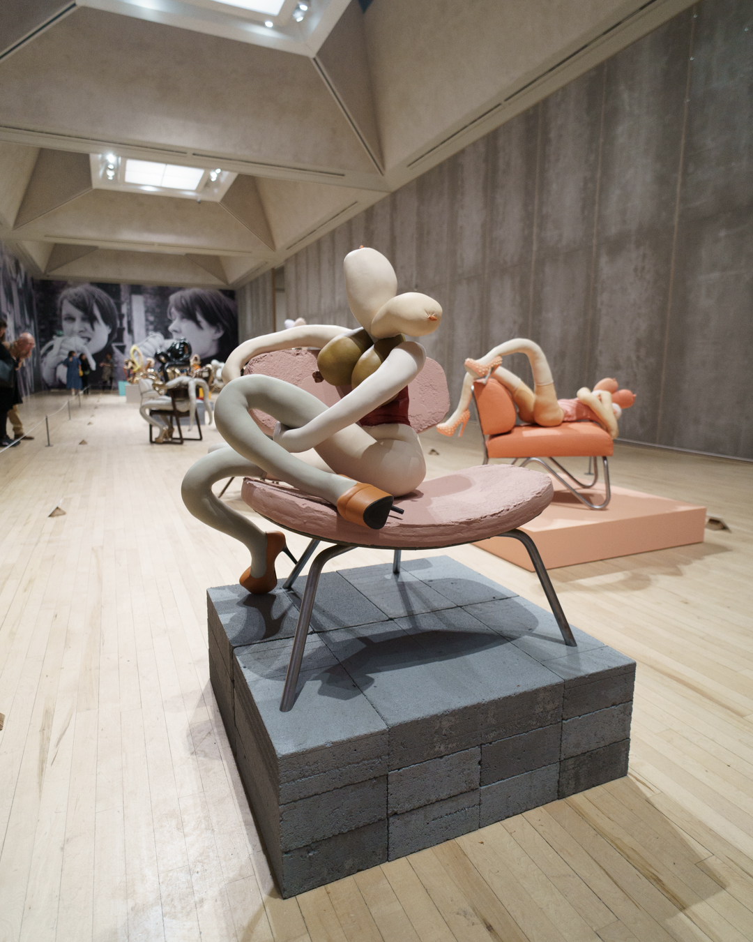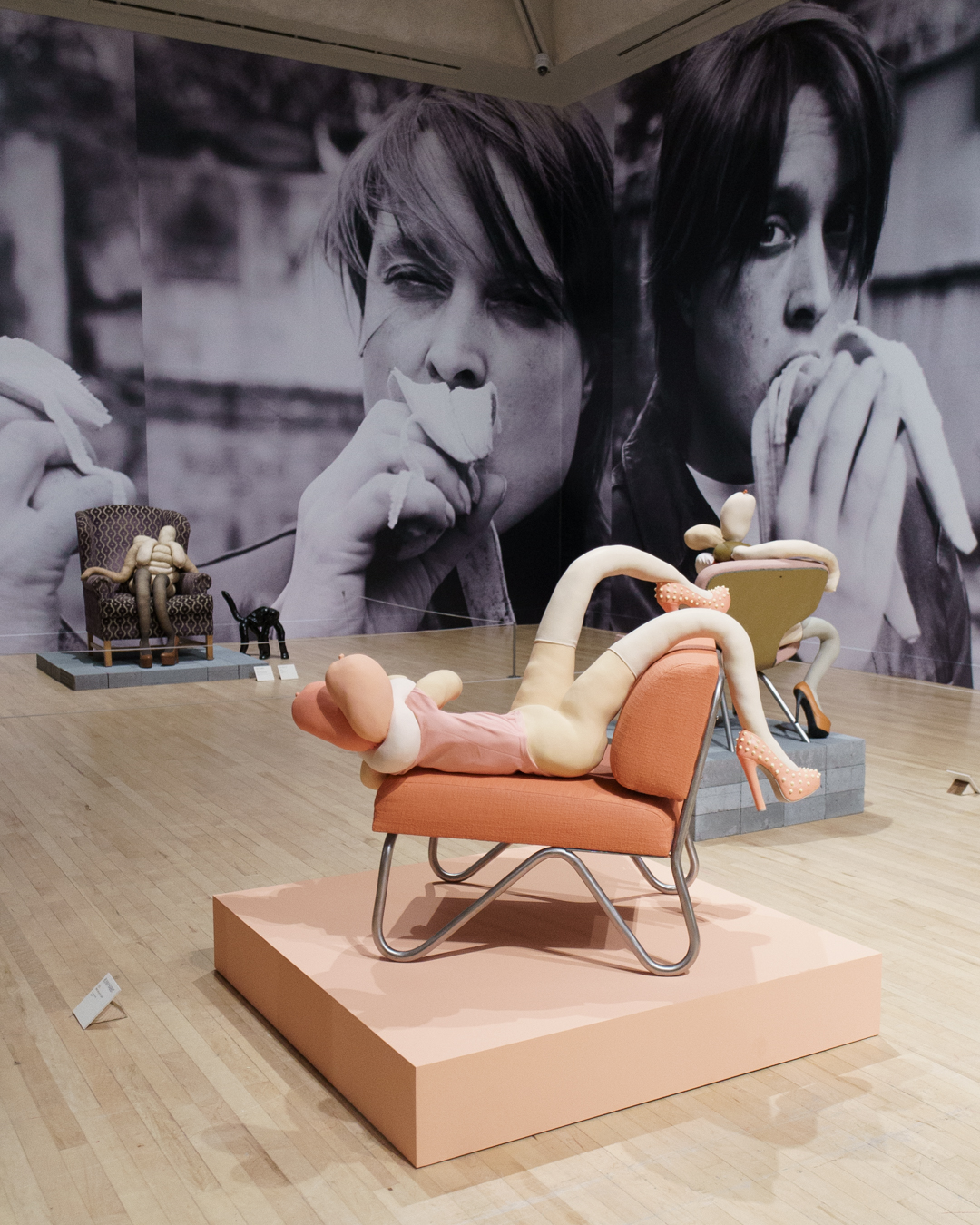 Lucas gives them a reason to be contemplated as visual objects, through placing them on plinths, while also using said chairs as pedestals for her iconic Bunnies. A long room presents them like a catwalk; the male gaze is strong here. Humanoid creations made of stuffed tights and stockings, her Bunnies are fascinating in their wide range of body language. Many of them feature crossed arms and small statures, suggesting vulnerability and frustration. Others are more open and sexually-overt.