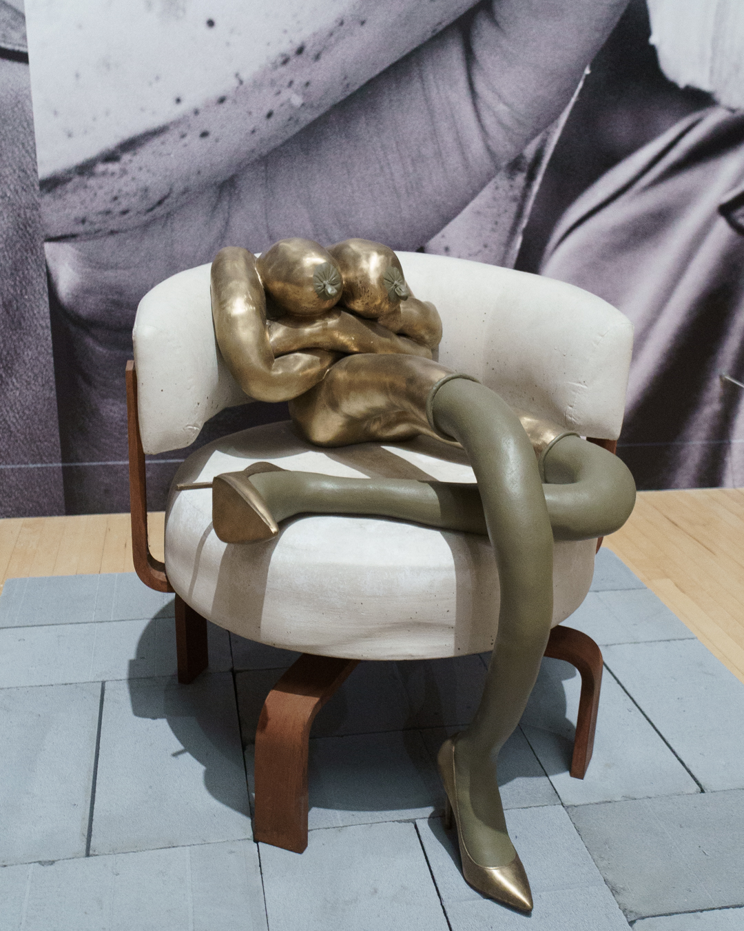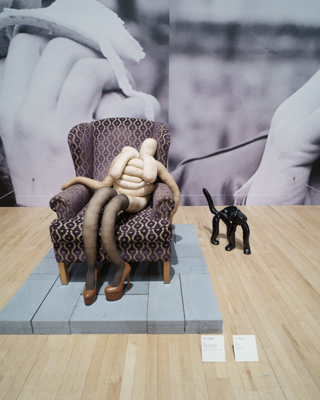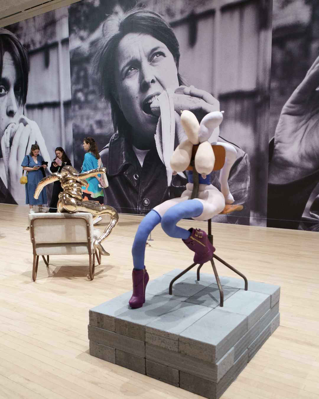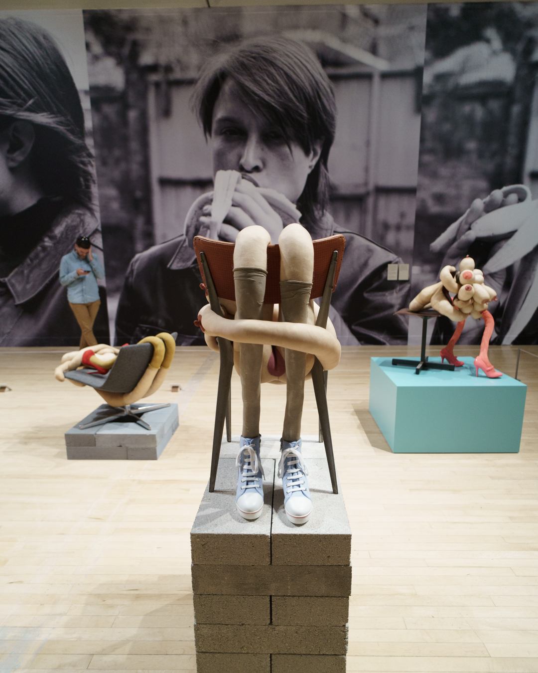 Lucas gives them a reason to be contemplated as visual objects, through placing them on plinths, while also using said chairs as pedestals for her iconic Bunnies. A long room presents them like a catwalk; the male gaze is strong here. Humanoid creations made of stuffed tights and stockings, her Bunnies are fascinating in their wide range of body language. Many of them feature crossed arms and small statures, suggesting vulnerability and frustration. Others are more open and sexually-overt.