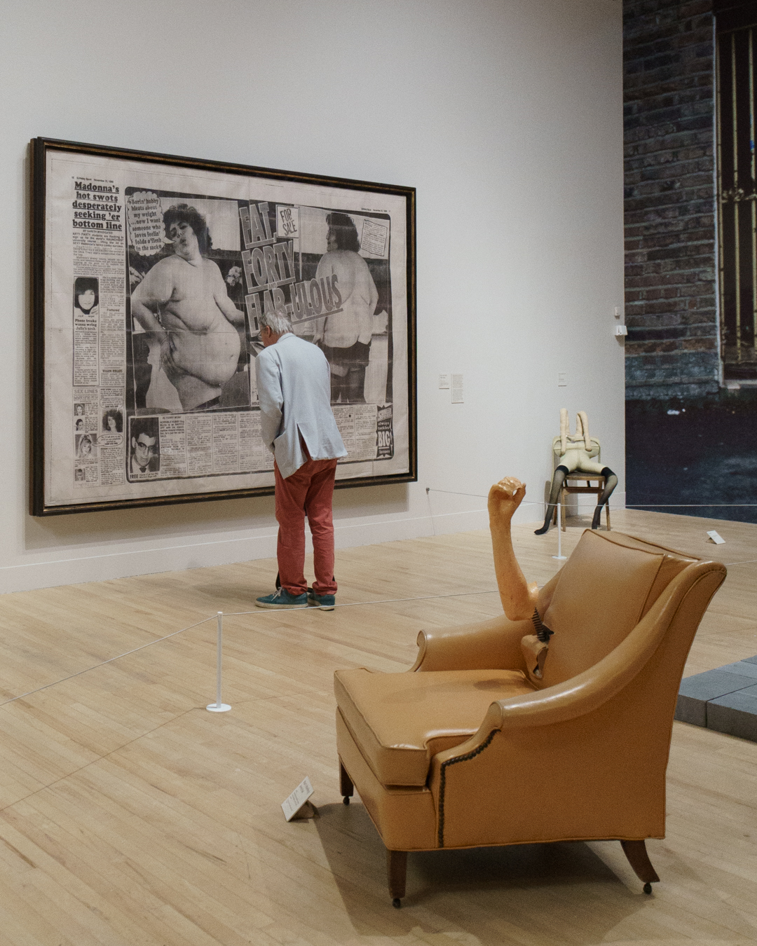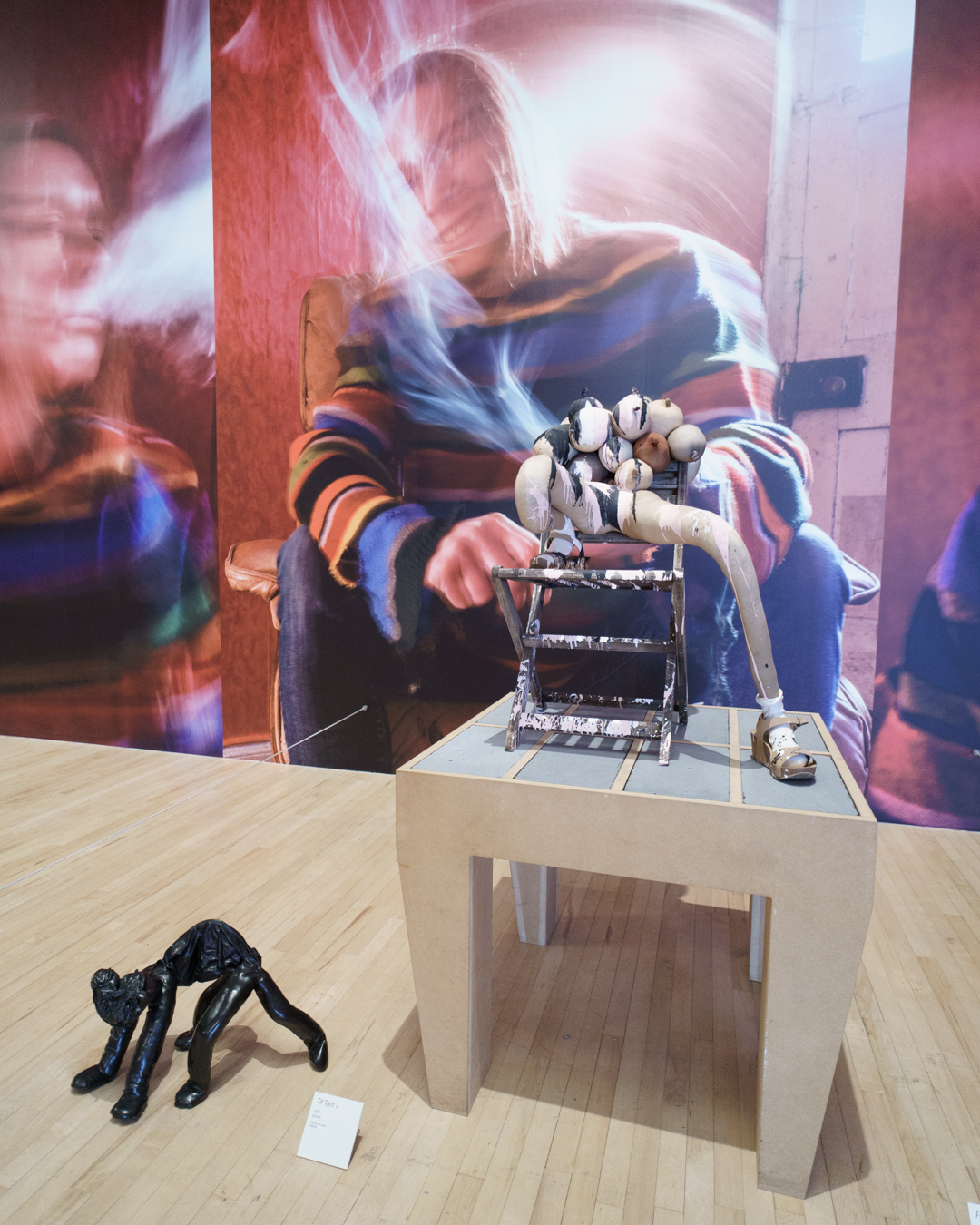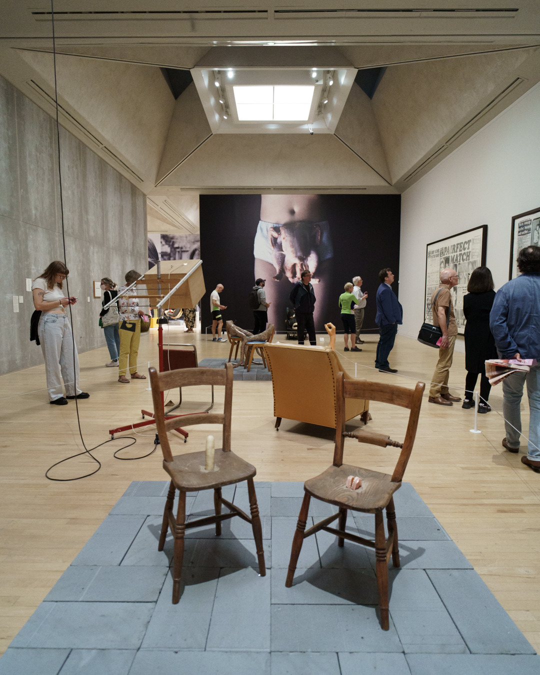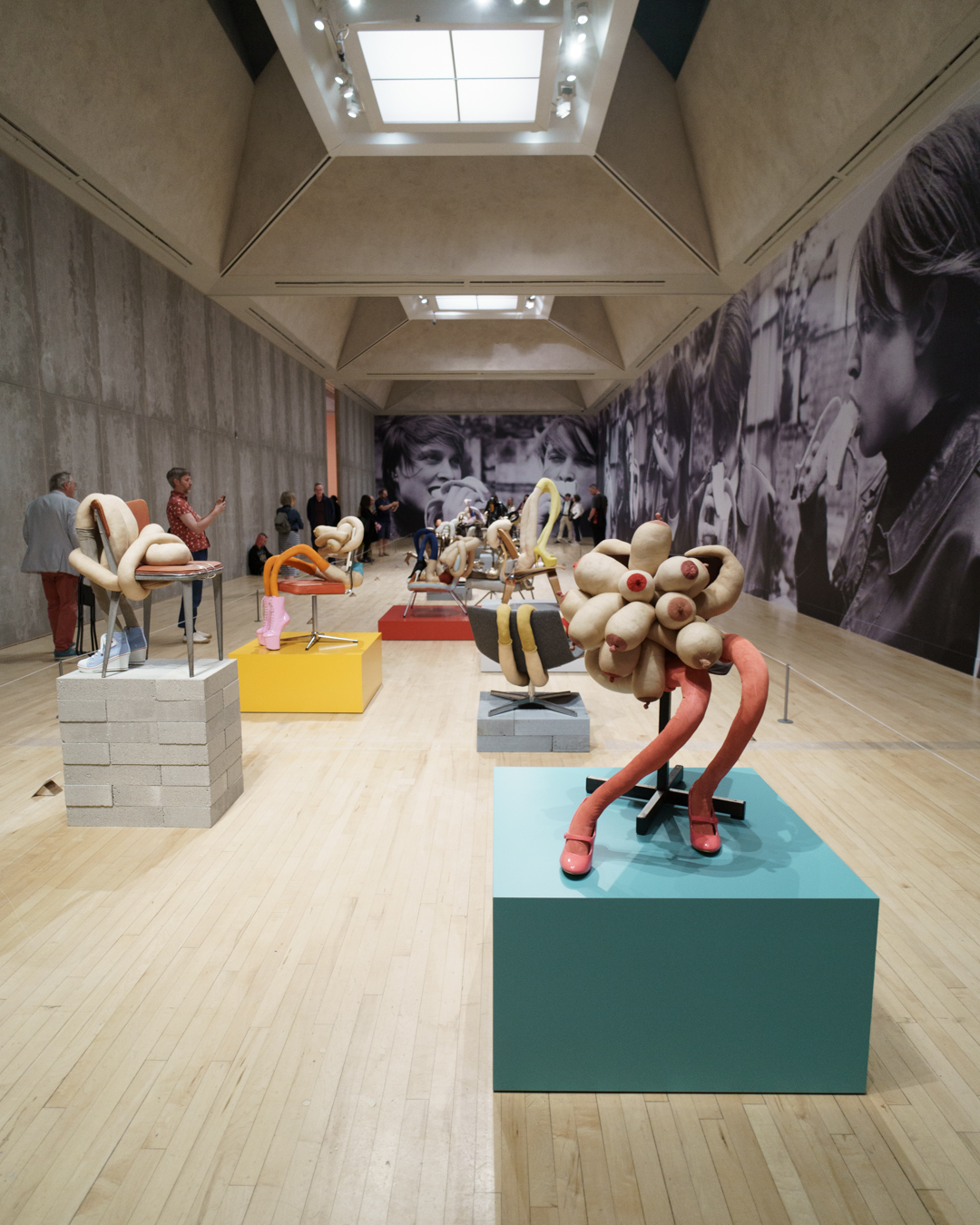 Lucas gives them a reason to be contemplated as visual objects, through placing them on plinths, while also using said chairs as pedestals for her iconic Bunnies. A long room presents them like a catwalk; the male gaze is strong here. Humanoid creations made of stuffed tights and stockings, her Bunnies are fascinating in their wide range of body language. Many of them feature crossed arms and small statures, suggesting vulnerability and frustration. Others are more open and sexually-overt.