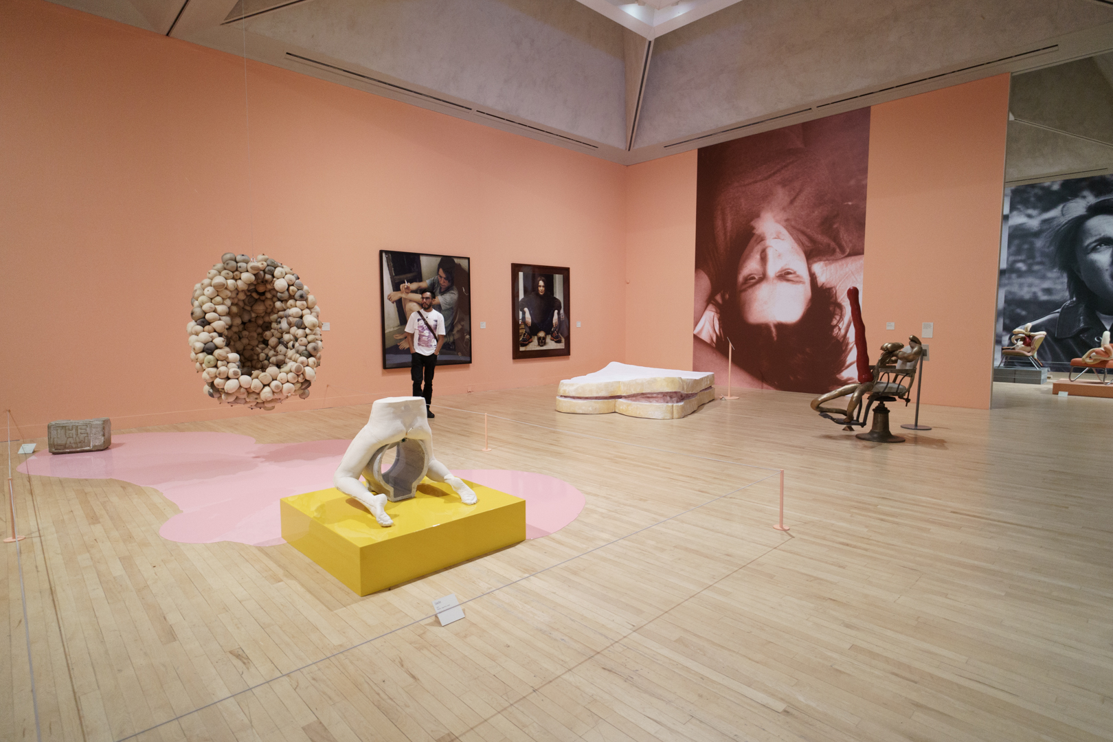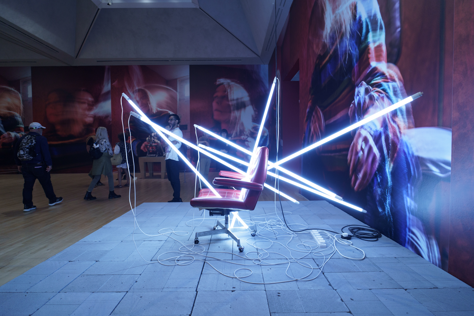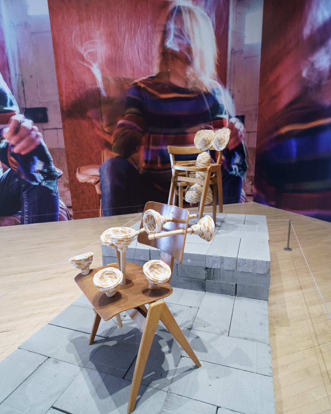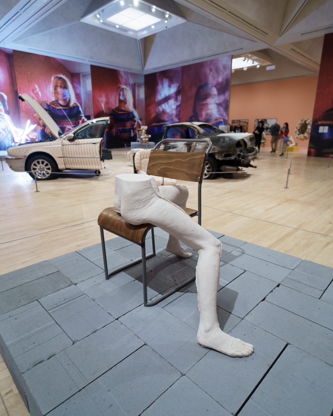 Lucas gives them a reason to be contemplated as visual objects, through placing them on plinths, while also using said chairs as pedestals for her iconic Bunnies. A long room presents them like a catwalk; the male gaze is strong here. Humanoid creations made of stuffed tights and stockings, her Bunnies are fascinating in their wide range of body language. Many of them feature crossed arms and small statures, suggesting vulnerability and frustration. Others are more open and sexually-overt.