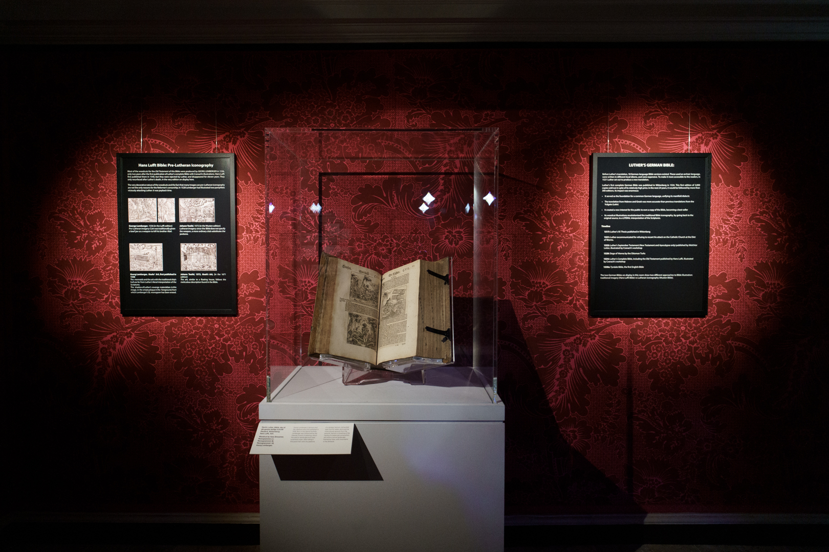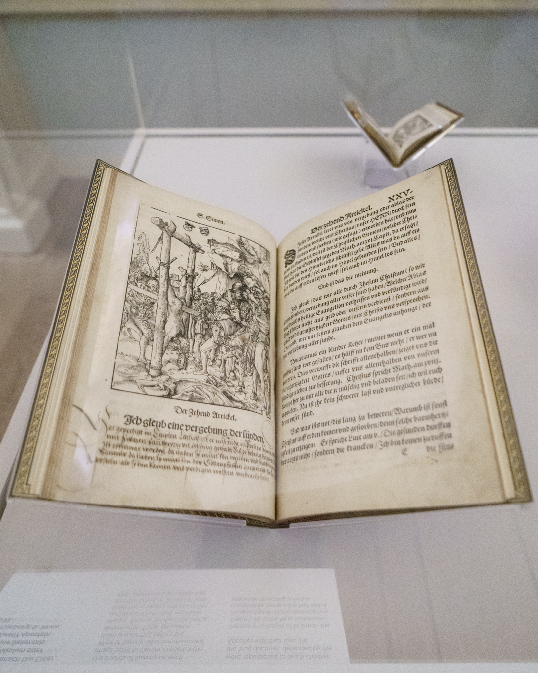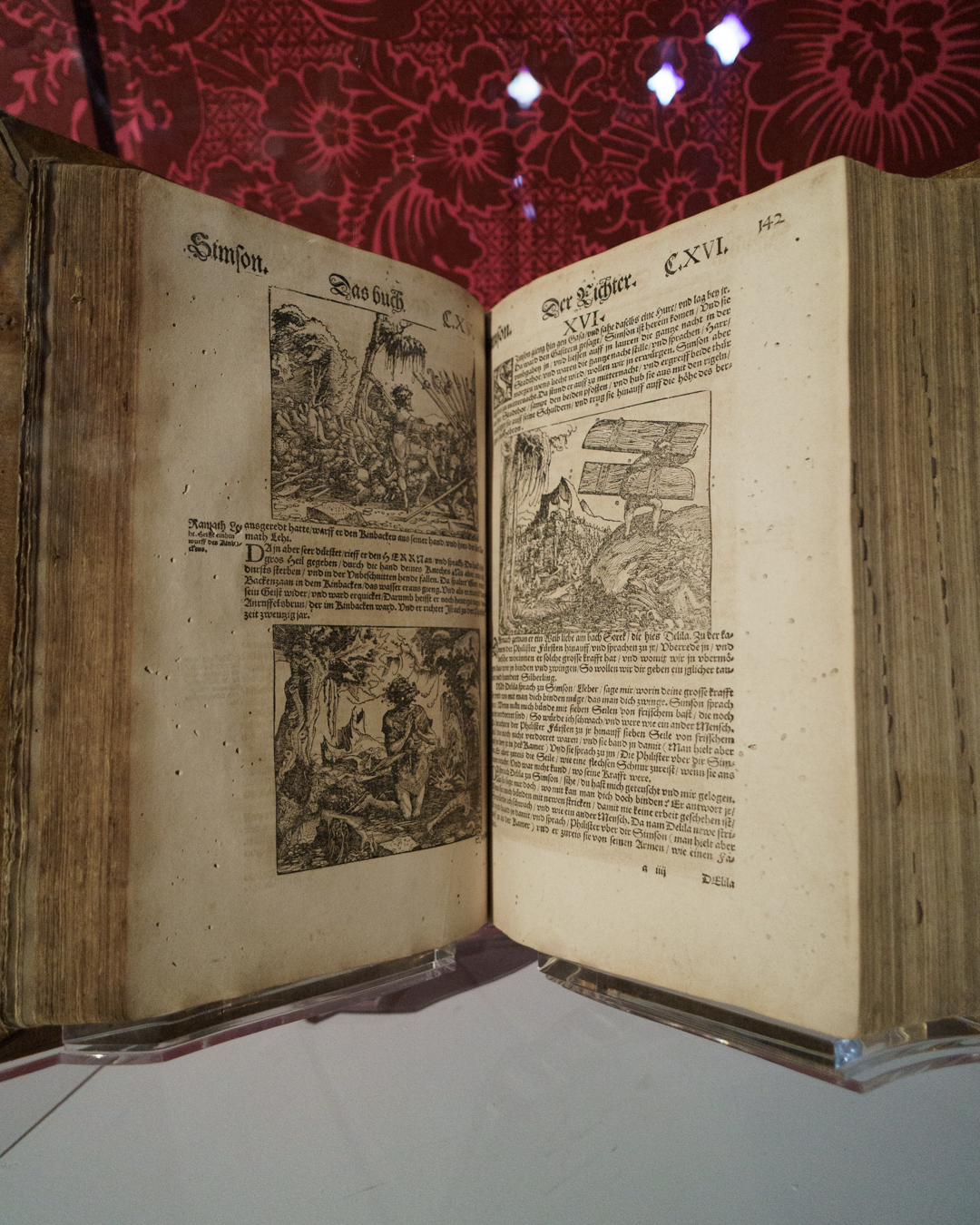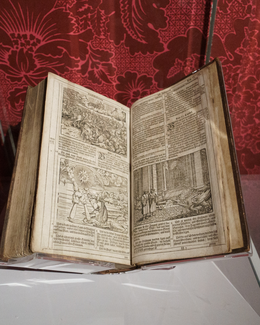 Downstairs, a smaller display examines how Martin Luther’s Bible radically departed from conventional treatments by offering a more accurate and accessible translation of the Old and New Testaments easily read by the German masses, and providing illustrations that were more faithful to their literal descriptions. The New Testament was first published in 1522 and the complete Bible with Apocrypha in 1534.