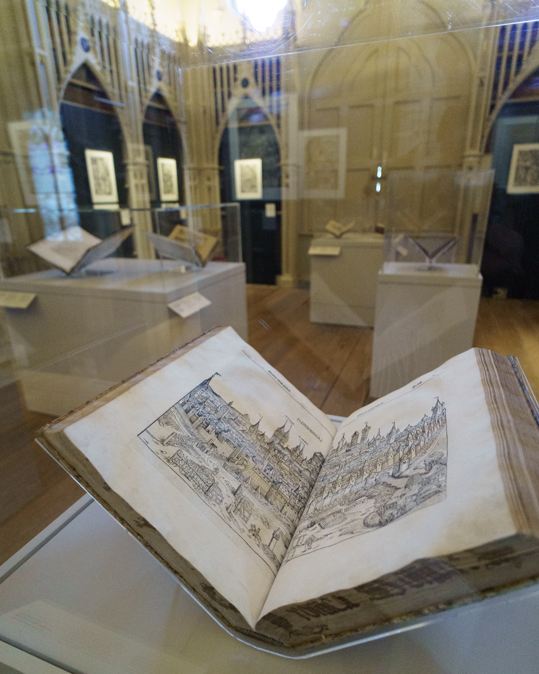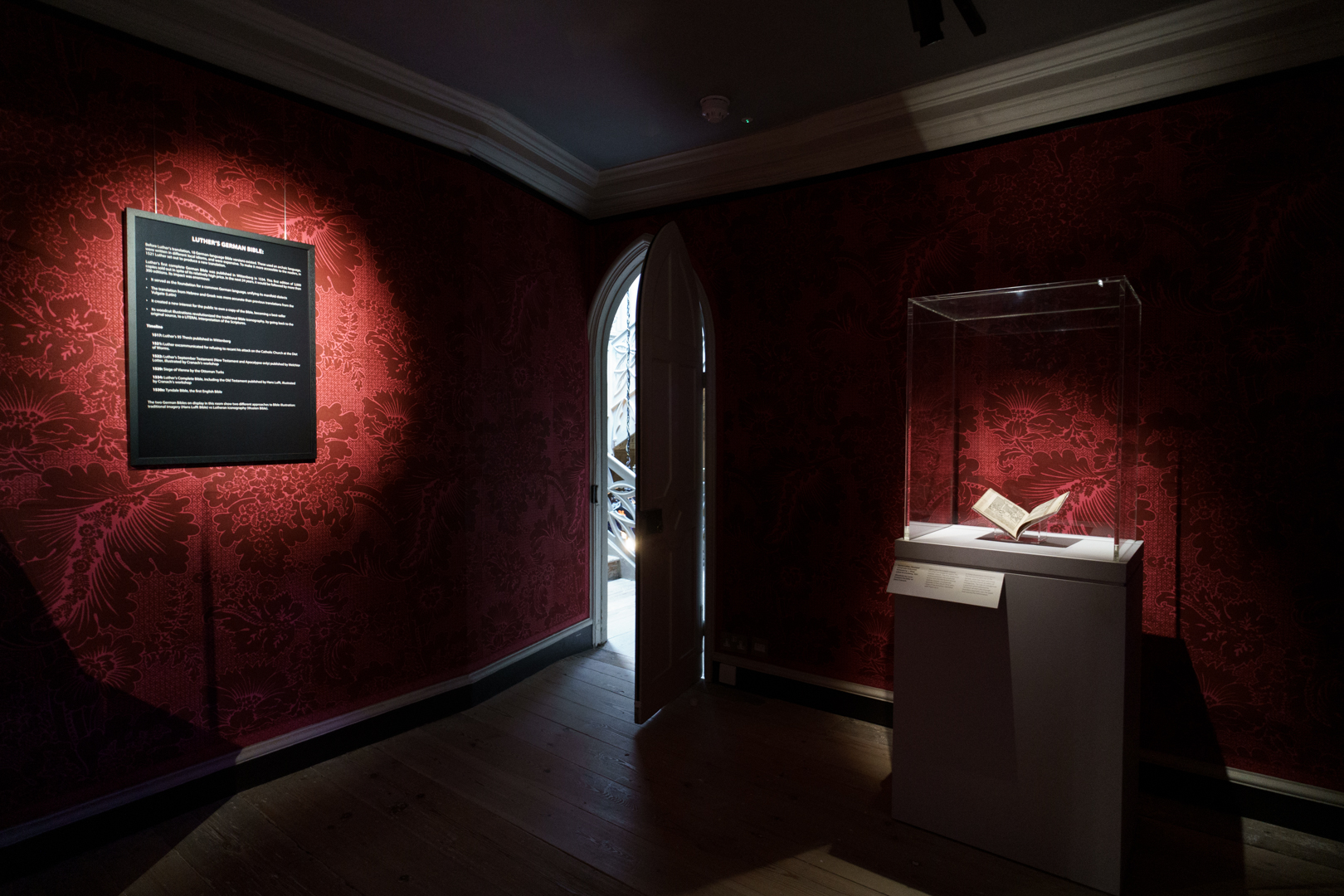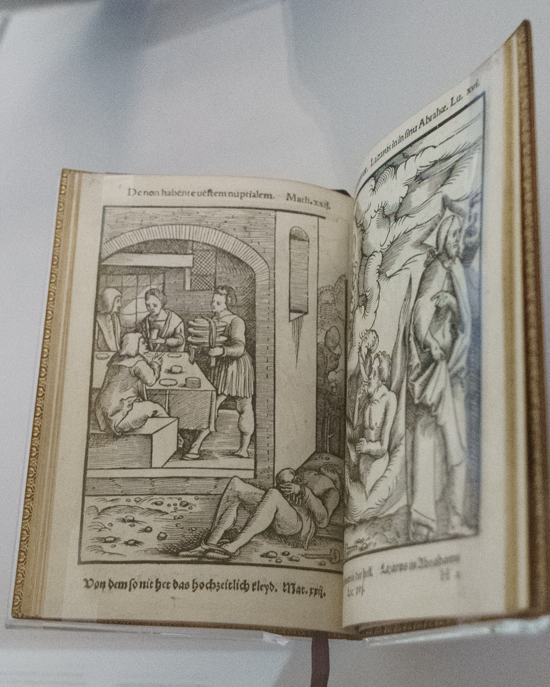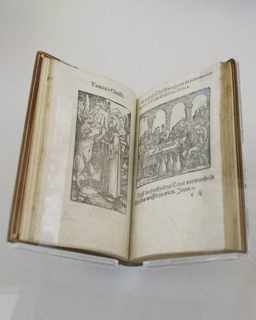 Downstairs, a smaller display examines how Martin Luther’s Bible radically departed from conventional treatments by offering a more accurate and accessible translation of the Old and New Testaments easily read by the German masses, and providing illustrations that were more faithful to their literal descriptions. The New Testament was first published in 1522 and the complete Bible with Apocrypha in 1534.