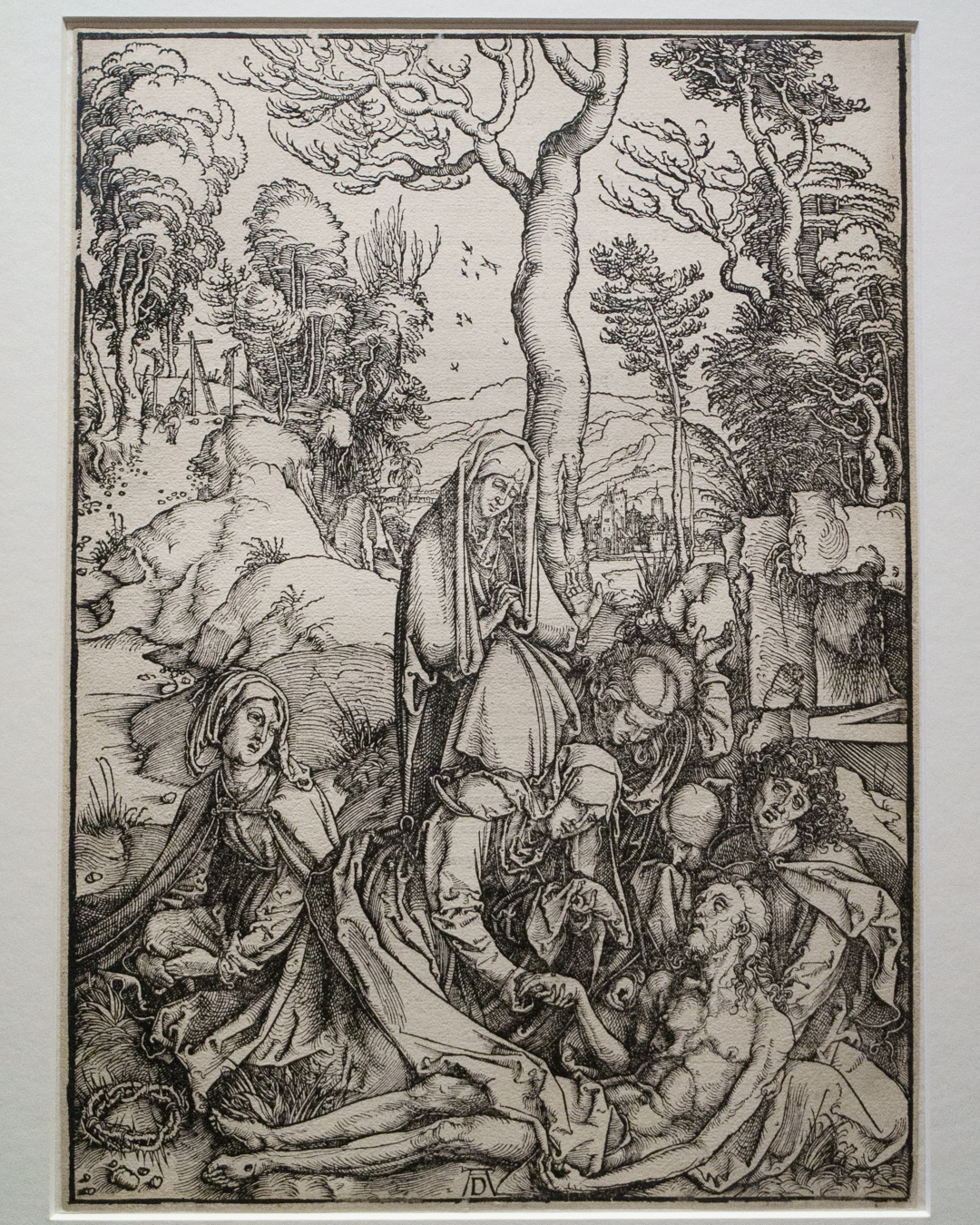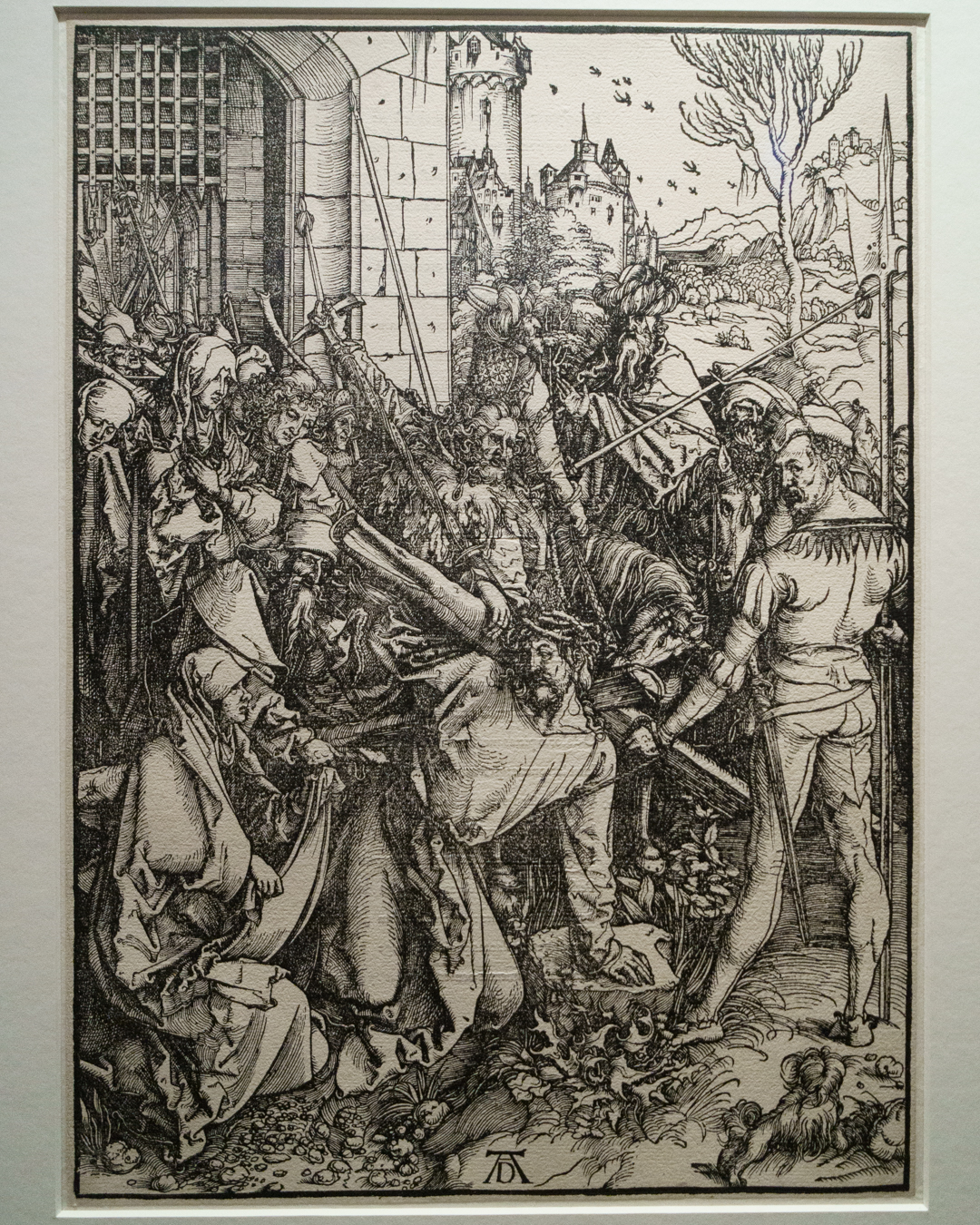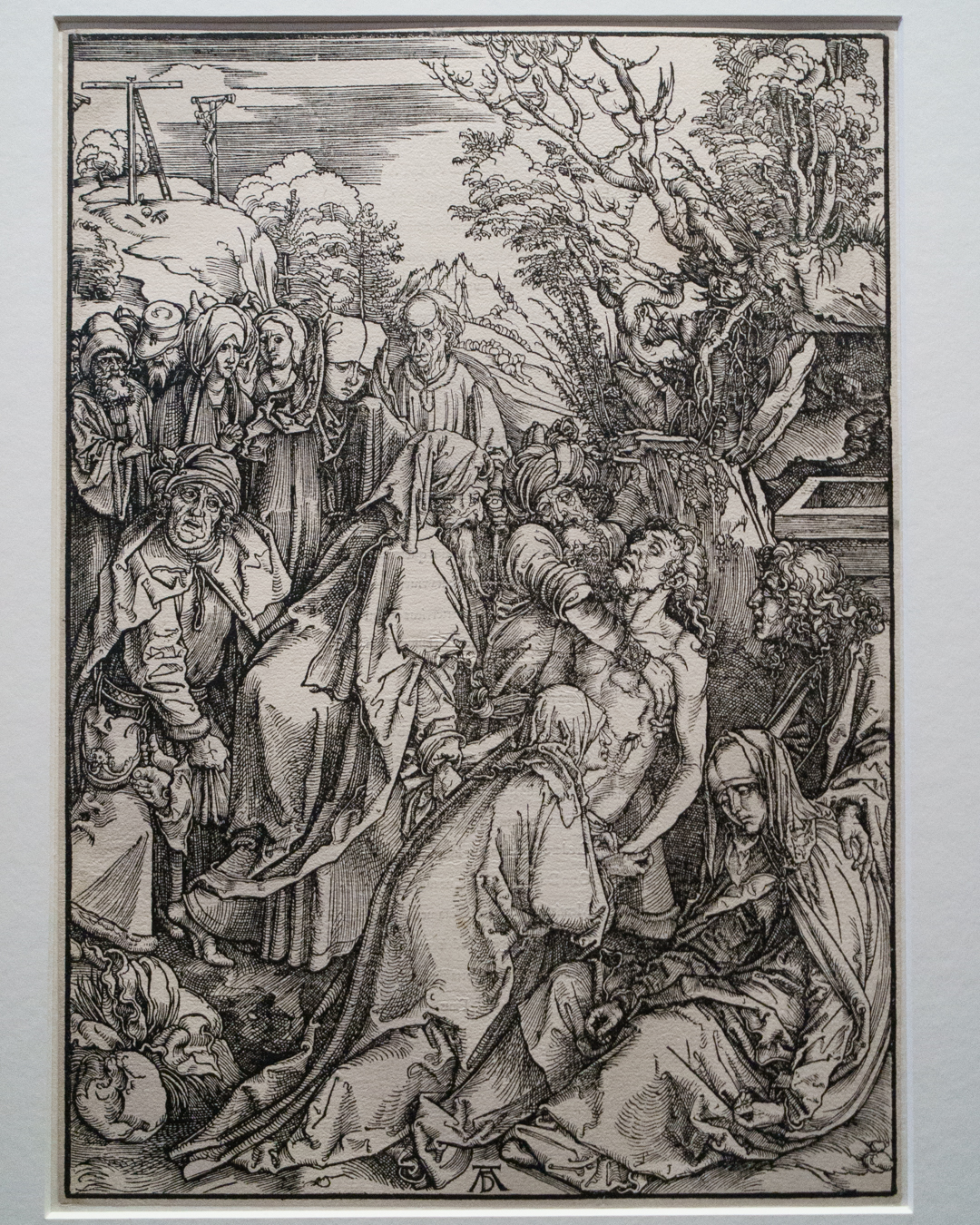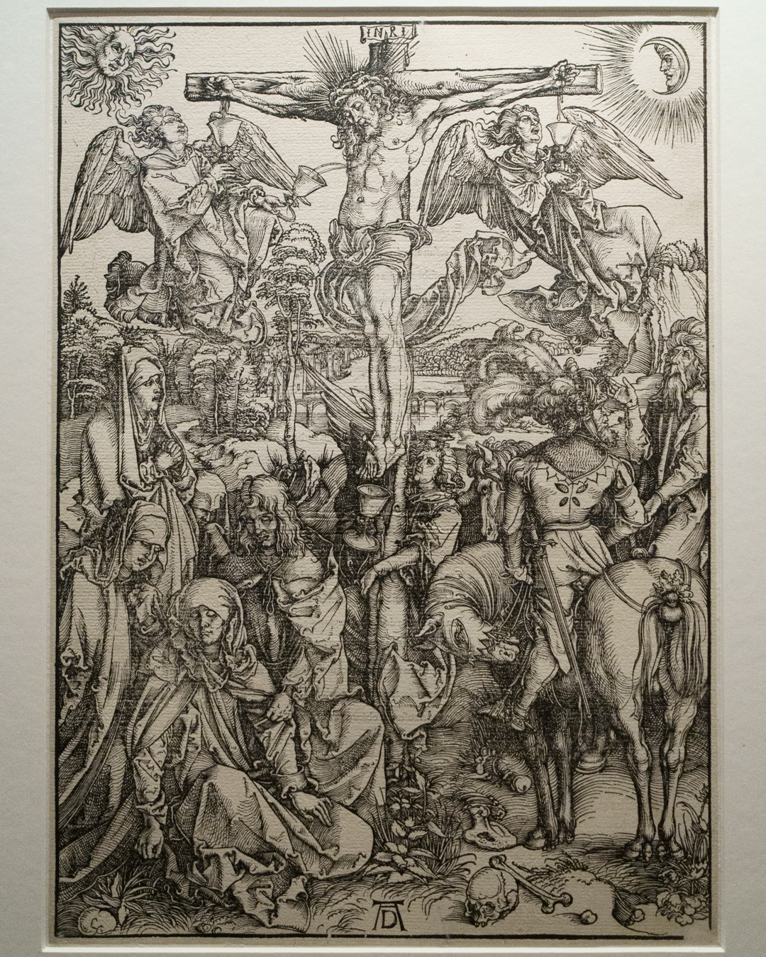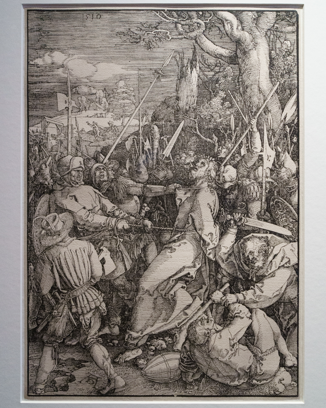 A complete set of the Great Passion (or Large Passion) reveals how Dürer drastically transitioned from homely Germanic forms to newfound Italian ones; parts of the series were completed before and after his second trip to Italy (1505-07). He also began to test his woodcarving skills by employing cross-hatching.