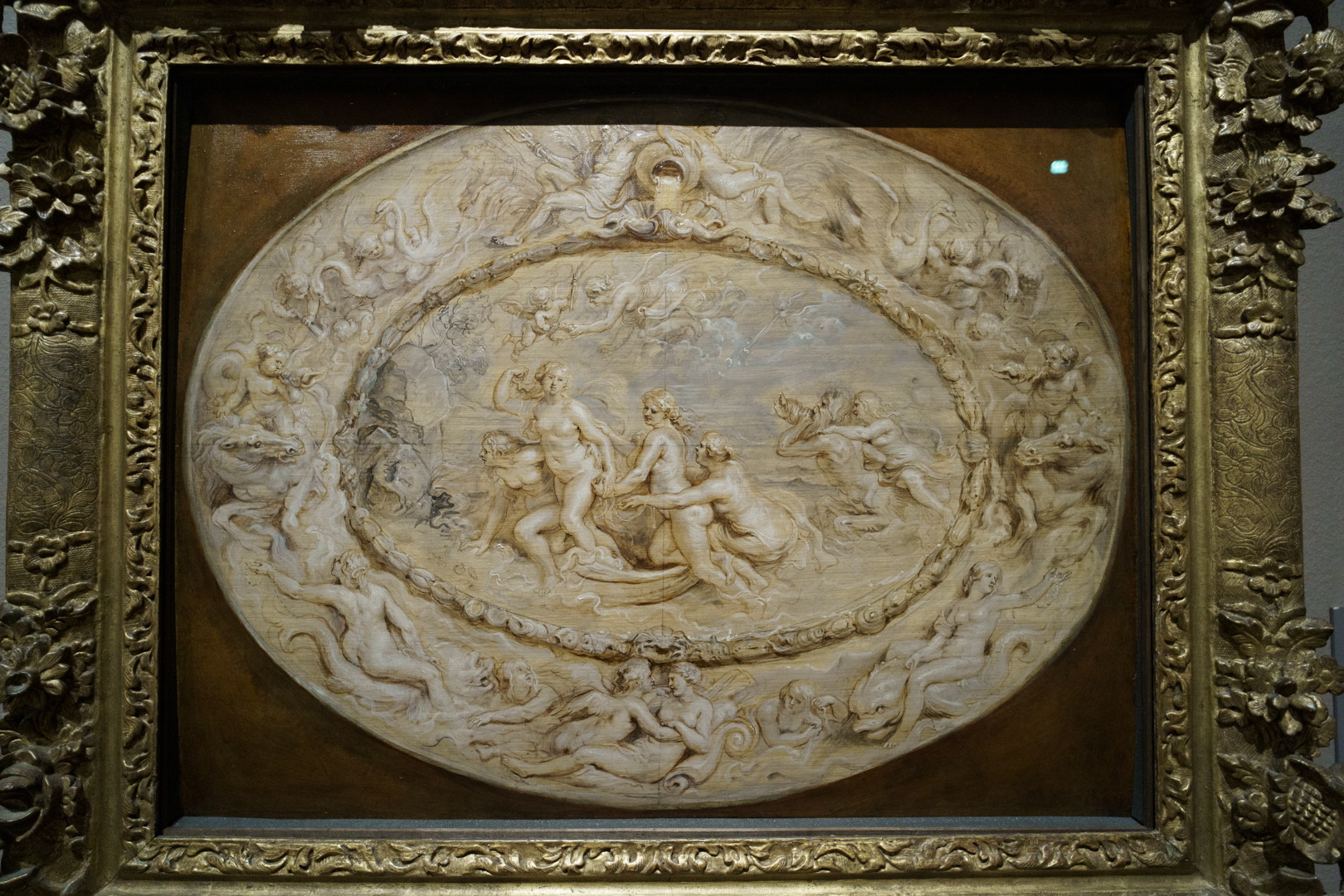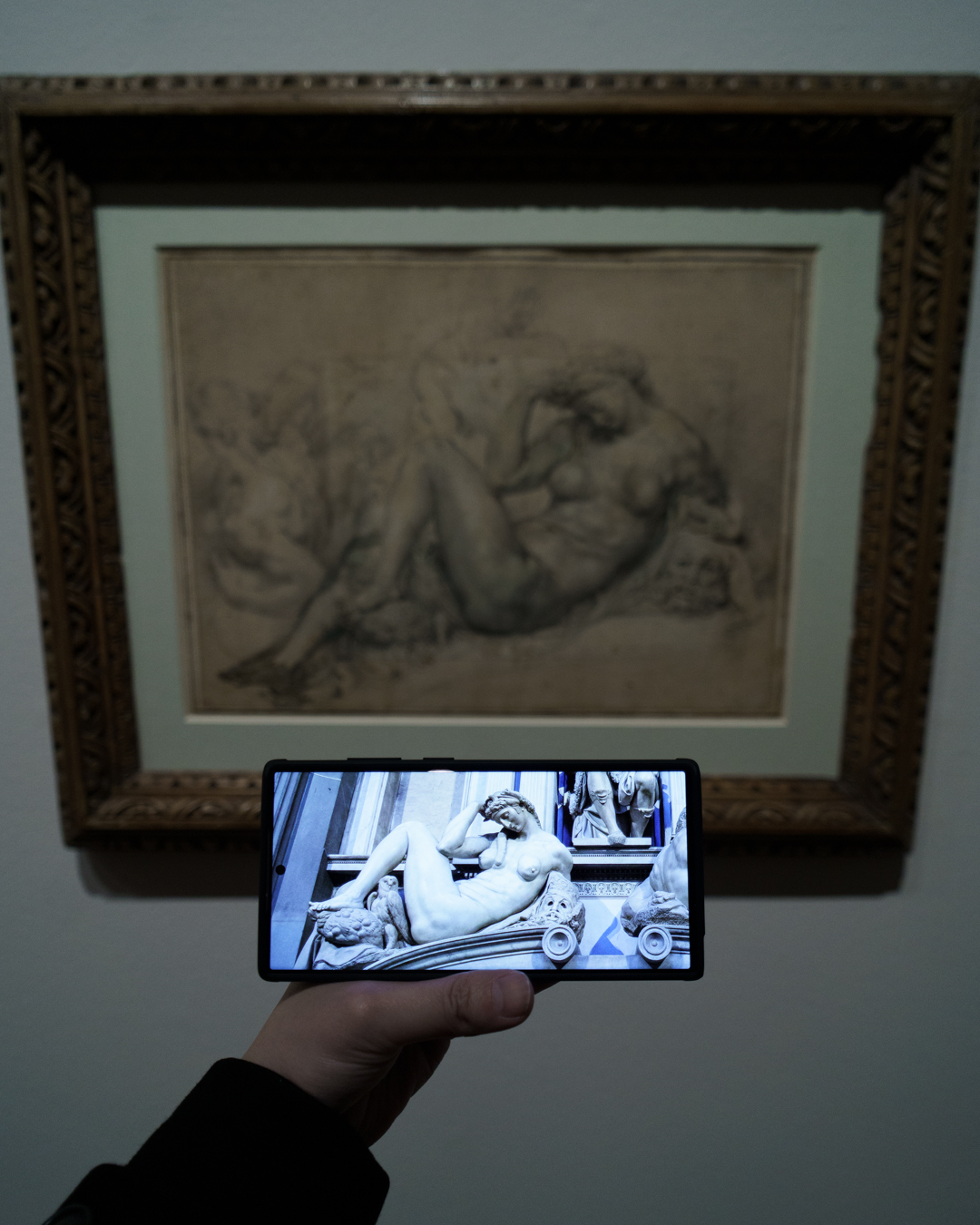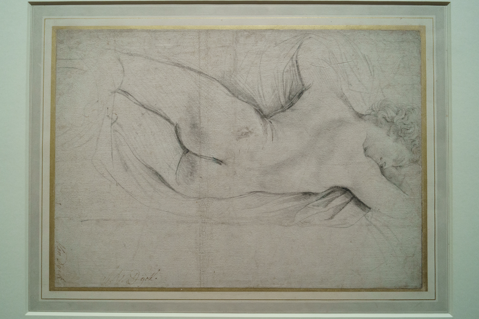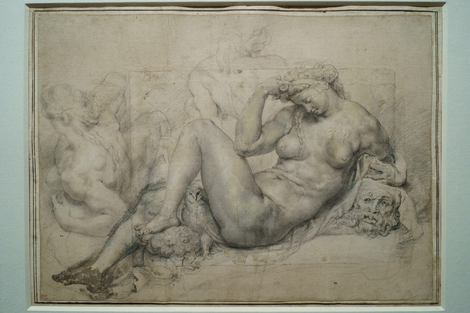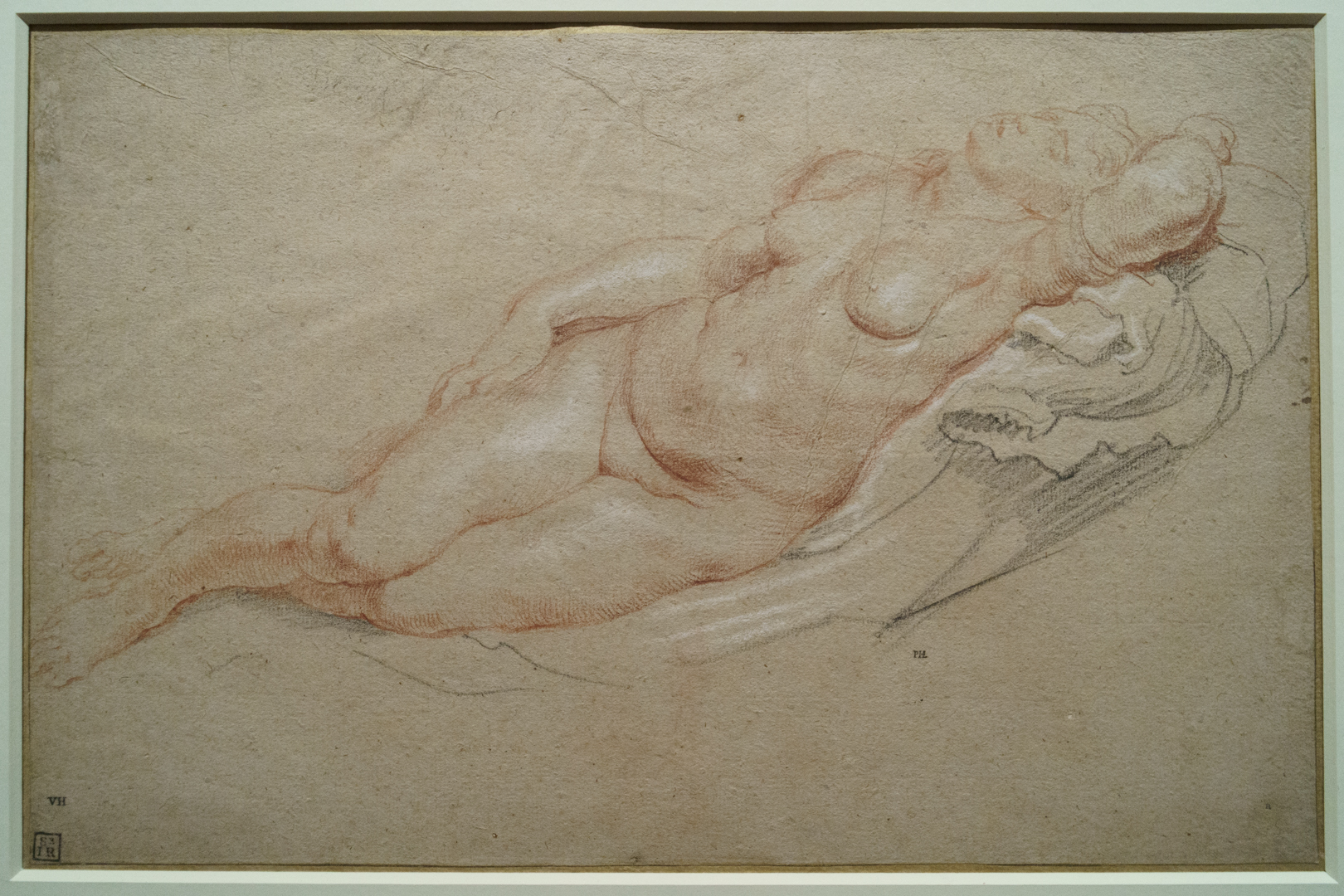 Another drawing, the best in the show, is a copy of Michelangelo’s Night from the Medici Chapels’ New Sacristy, with additions exploring different viewpoints (mimicking the Crouching Venus installation). The left hand of the original sculpture cannot in fact be seen from the front, so this was an addition Rubens made himself. Yet, Michelangelo himself also modelled his own ideals after the antique.