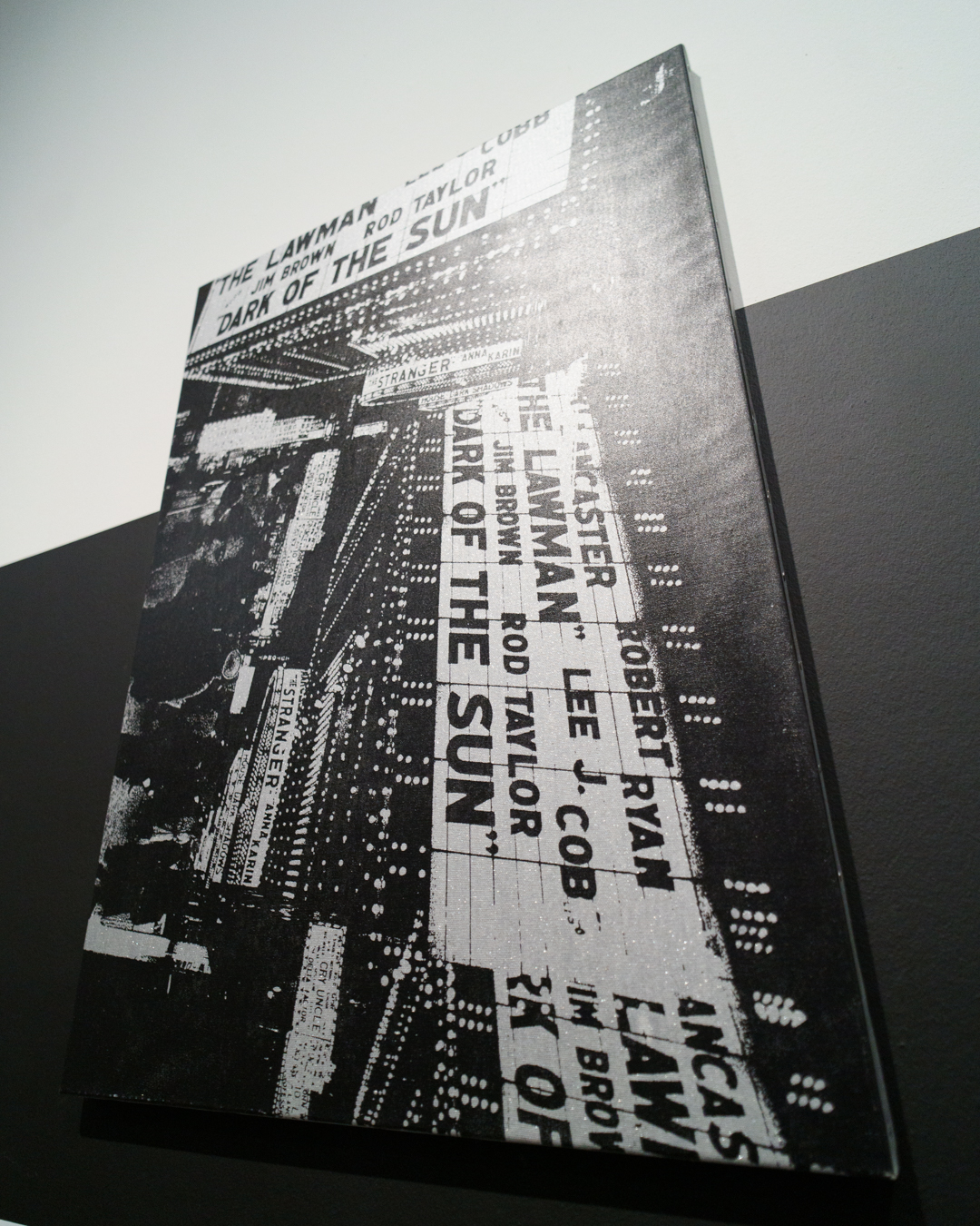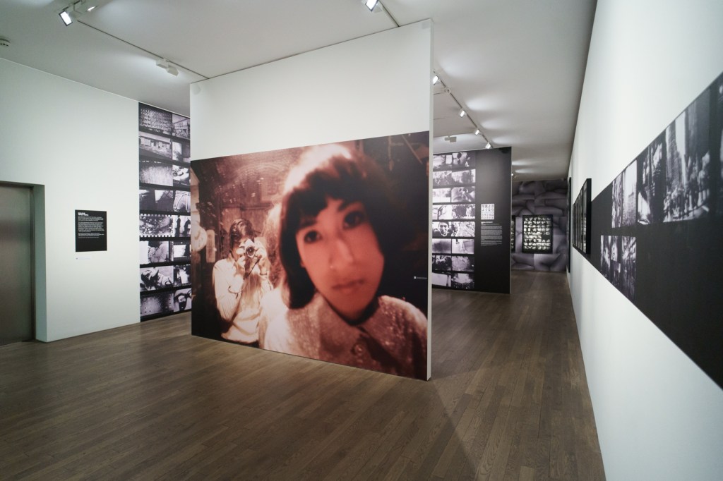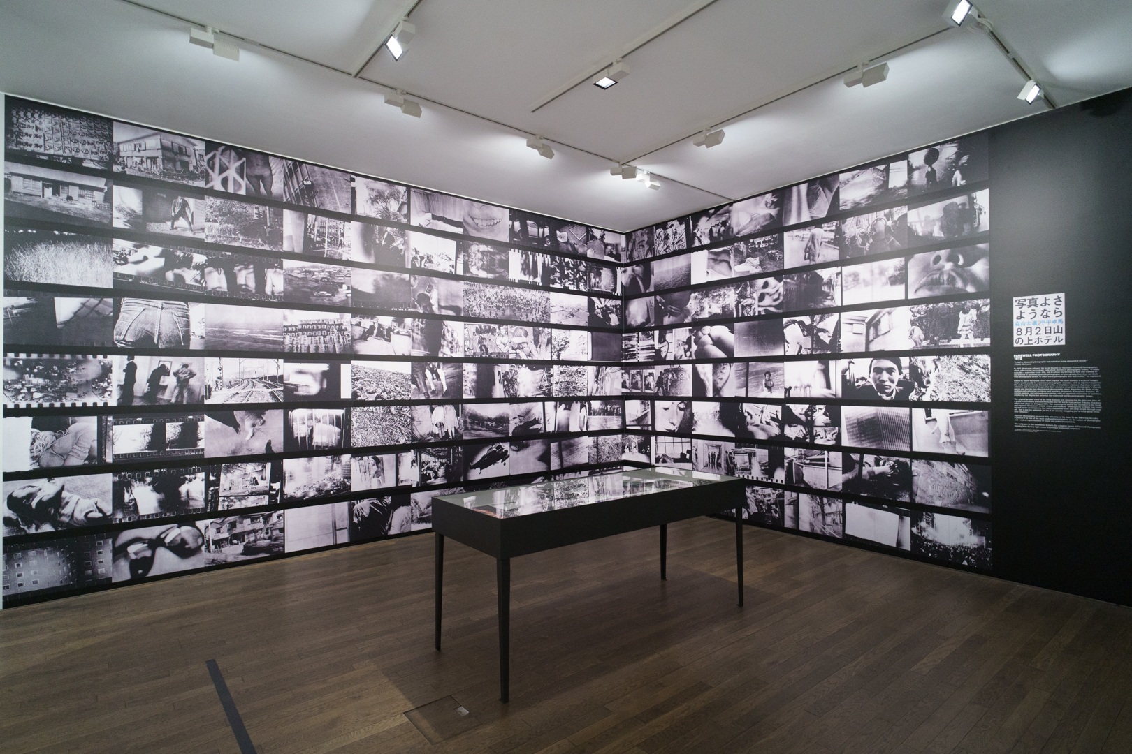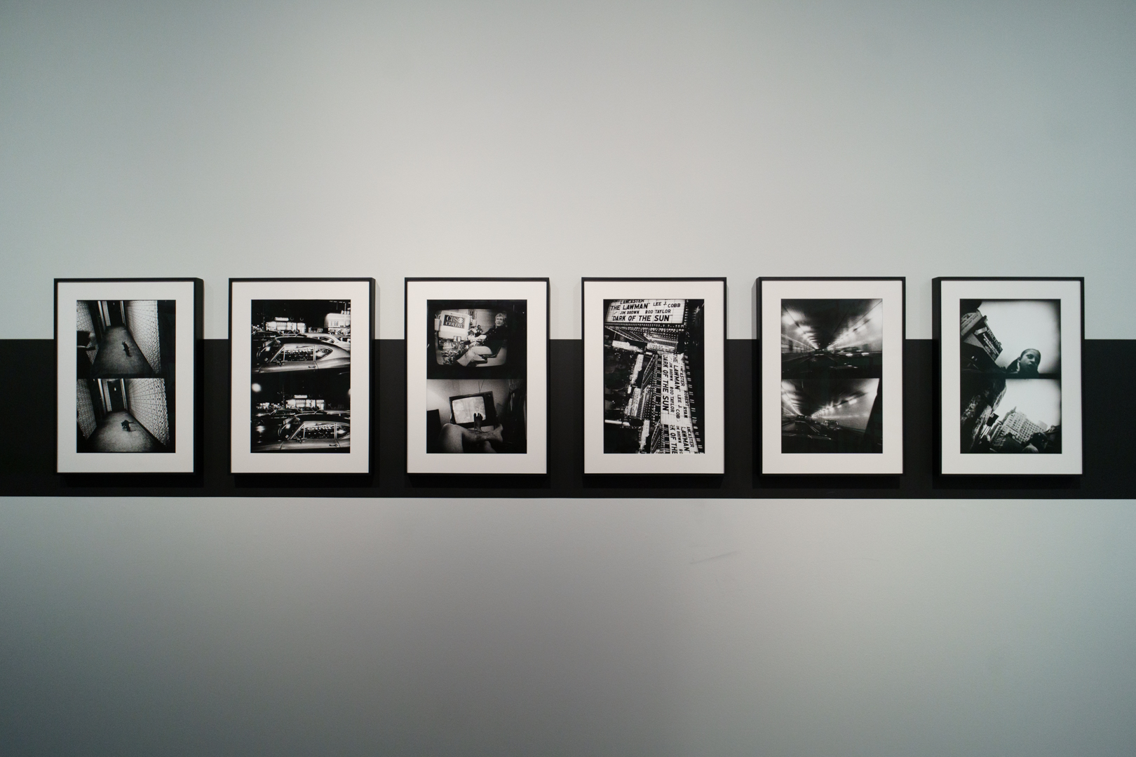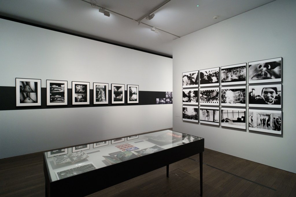 The exhibition’s mix of framed images and reproductions printed onto its walls may frustrate some people. However, this solution allows for some very creative installations that both drive the narrative and offer more examples of Moriyama’s work to be seen. The presentation of Farewell Photography (1972) is one example of this, where the book’s entire layout has been reproduced floor-to-ceiling across two walls. In the preceding year, he visited New York – home to his idols William Klein and Andy Warhol – carrying a half-frame camera, where two separate images would occupy the space of a single negative. This technical limitation allowed Moriyama to experiment with image pairings akin to those on a publication spread.