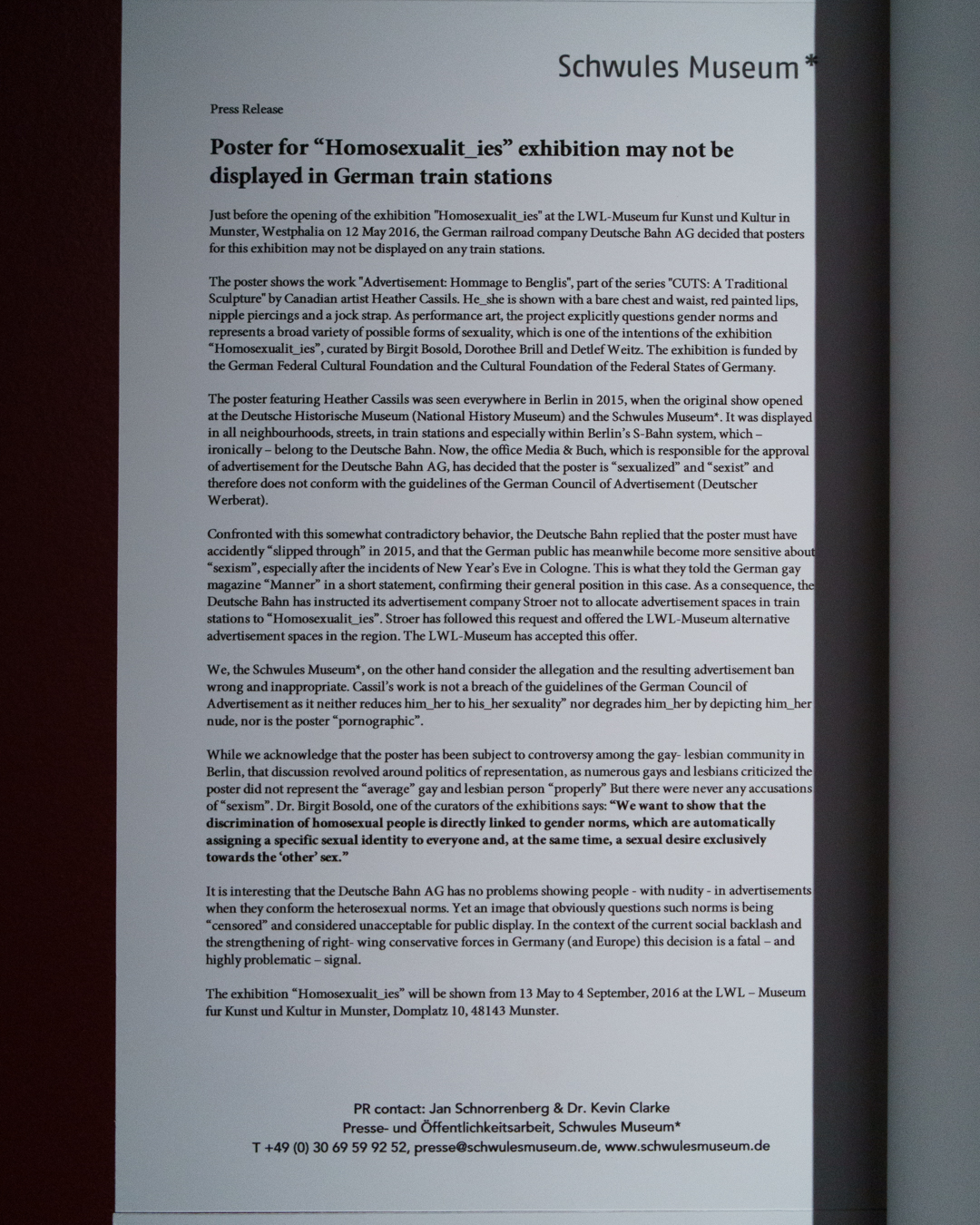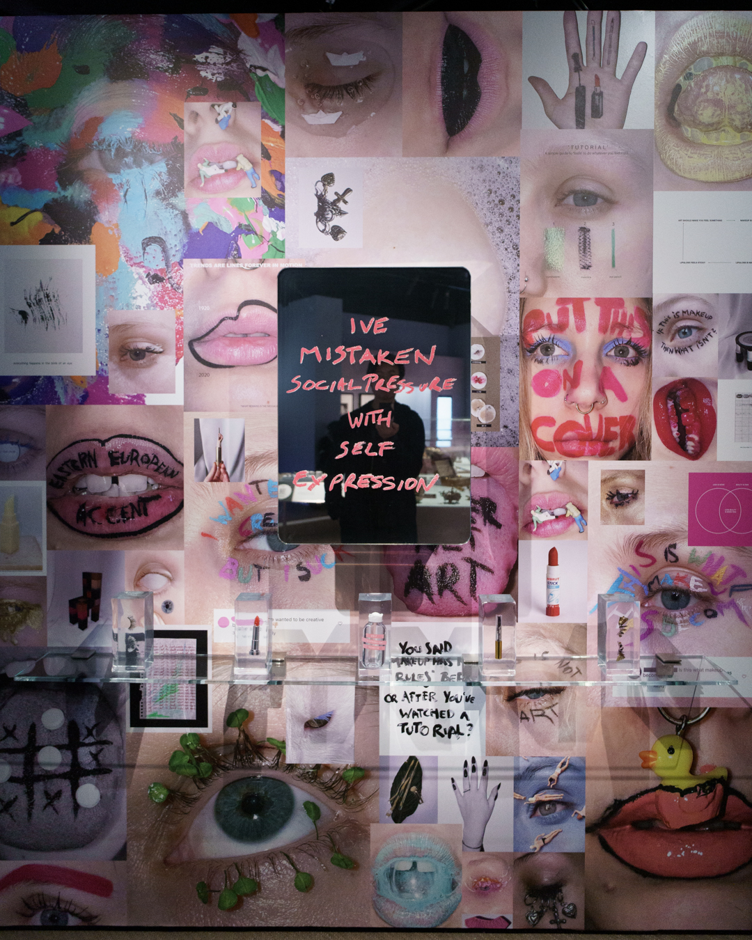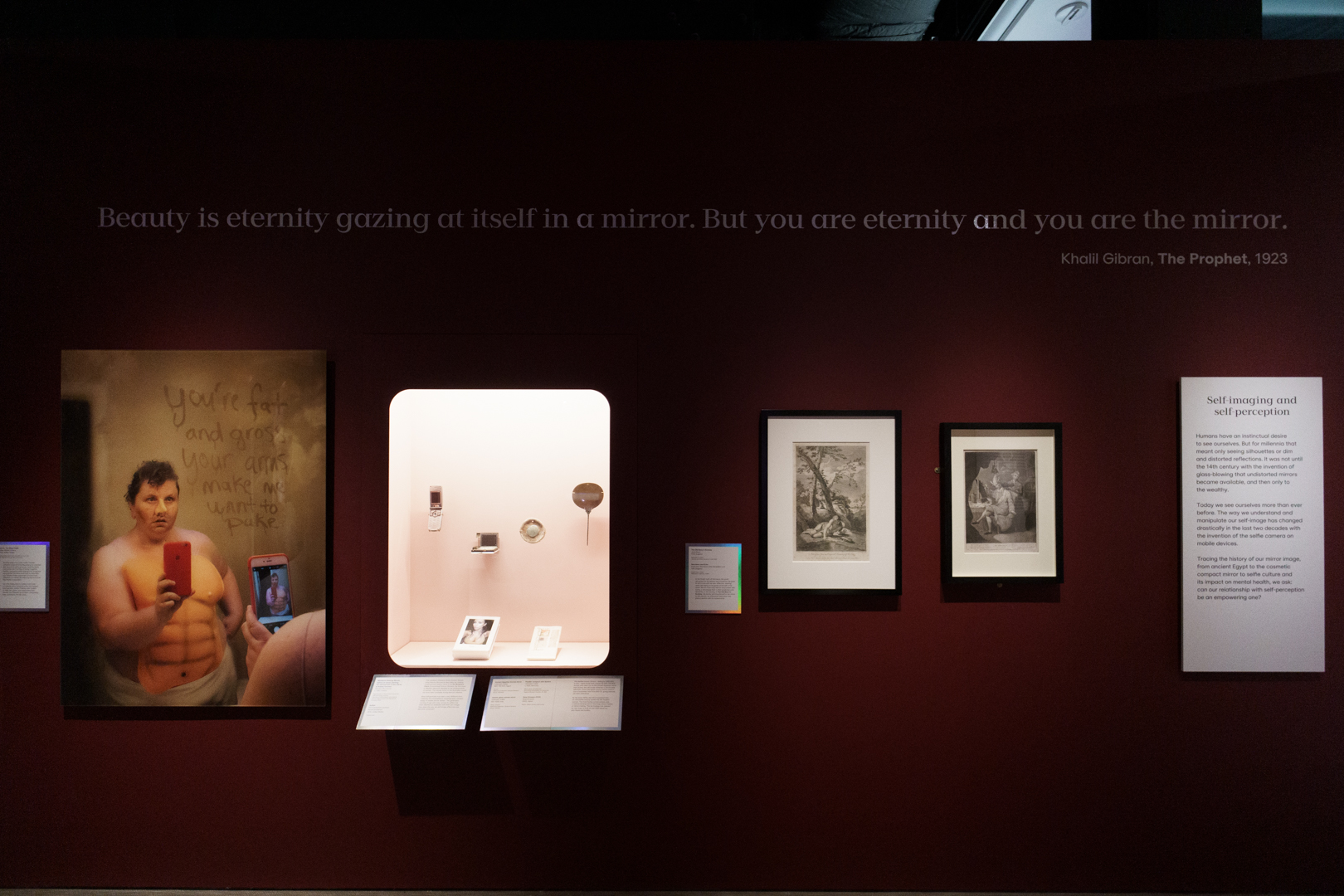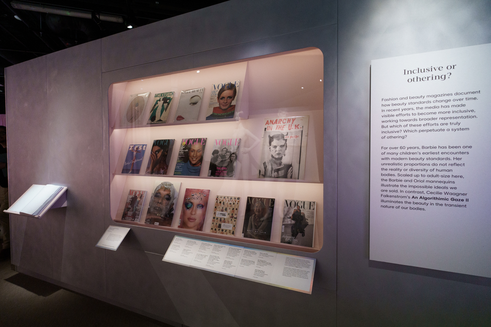 Censorship appears quite early too in the form of a controversial German exhibition poster featuring trans artist Cassils in 2016. In the contemporary sections, issues of identity and racial representation are tied up with consumerism in the beauty industry; a wall of Vogue magazines featuring diverse individuals is even accompanied by a Braille edition. A small section on mirrors eloquently sums up our self-obsessed vanity from Narcissus to the mirror selfie.