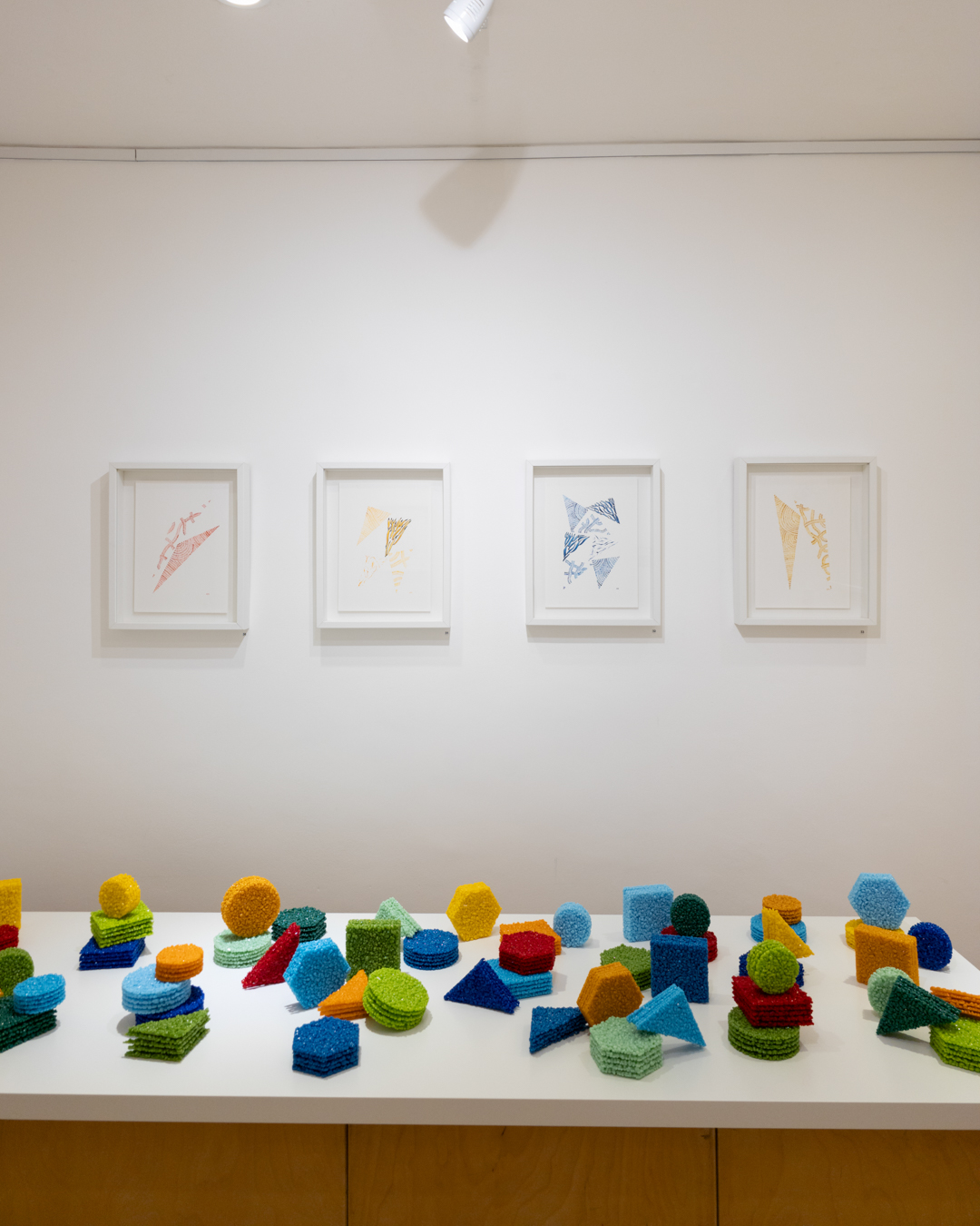 The back room is where the fun begins, filled with brightly coloured creations from her Play series that resemble flapjacks and Rice Krispies than glass. The accessible tactility of her sculptures is not lost on her; it’s a real challenge to rewire one’s brain into not wanting to pick one up and eat it. An assortment of works on paper accompany these, some serving as the basis for her Relief Glass Drawing pieces, which appear like mystical tablets from a lost civilisation.