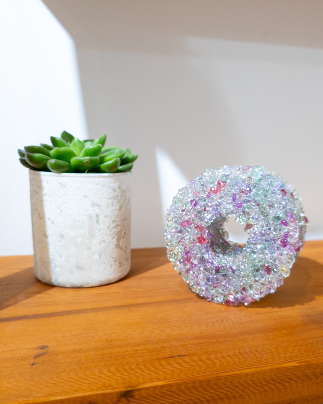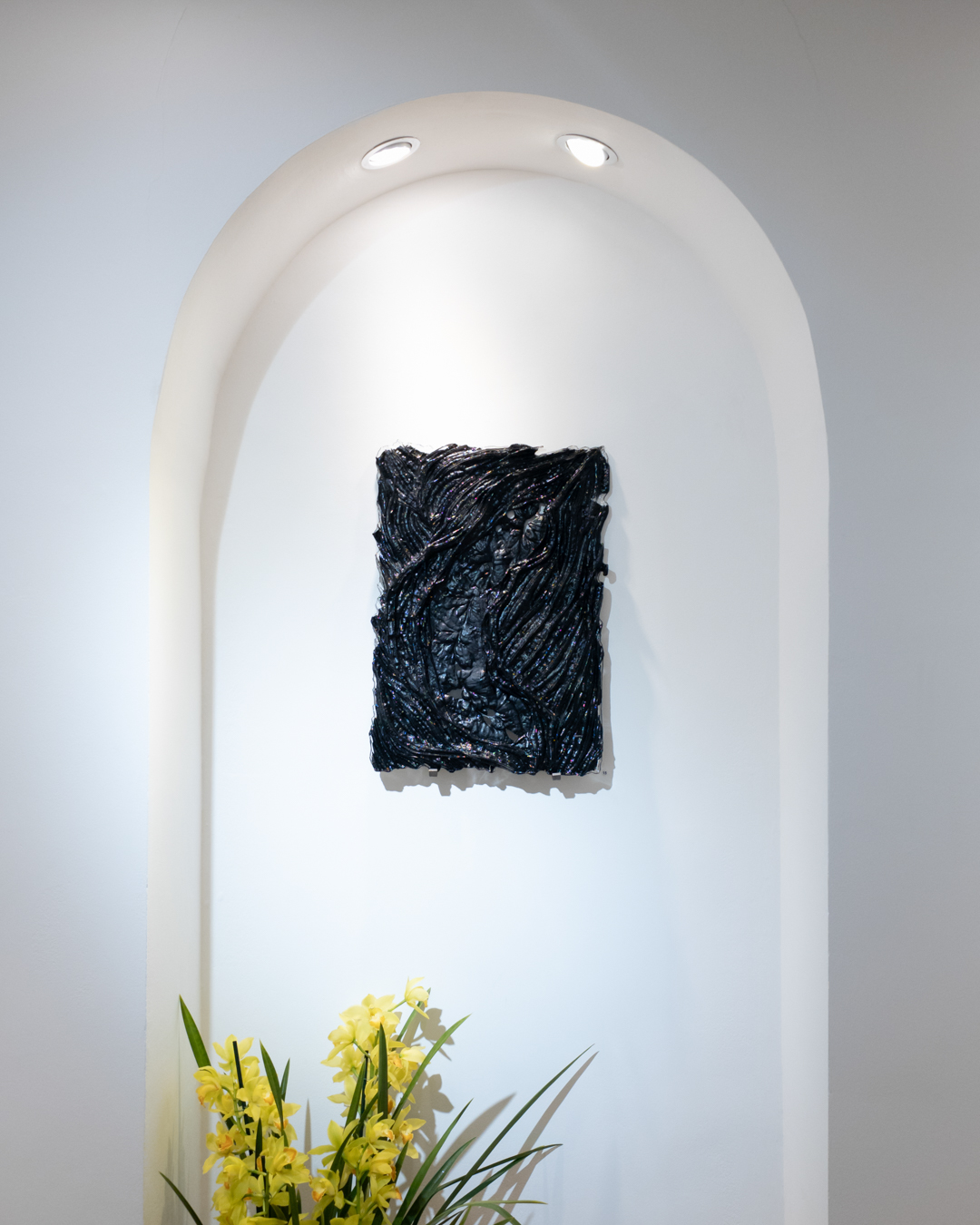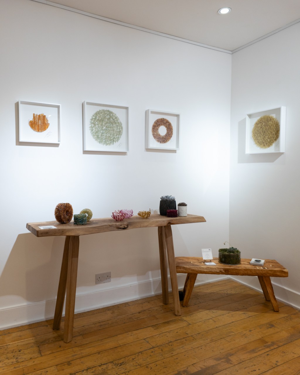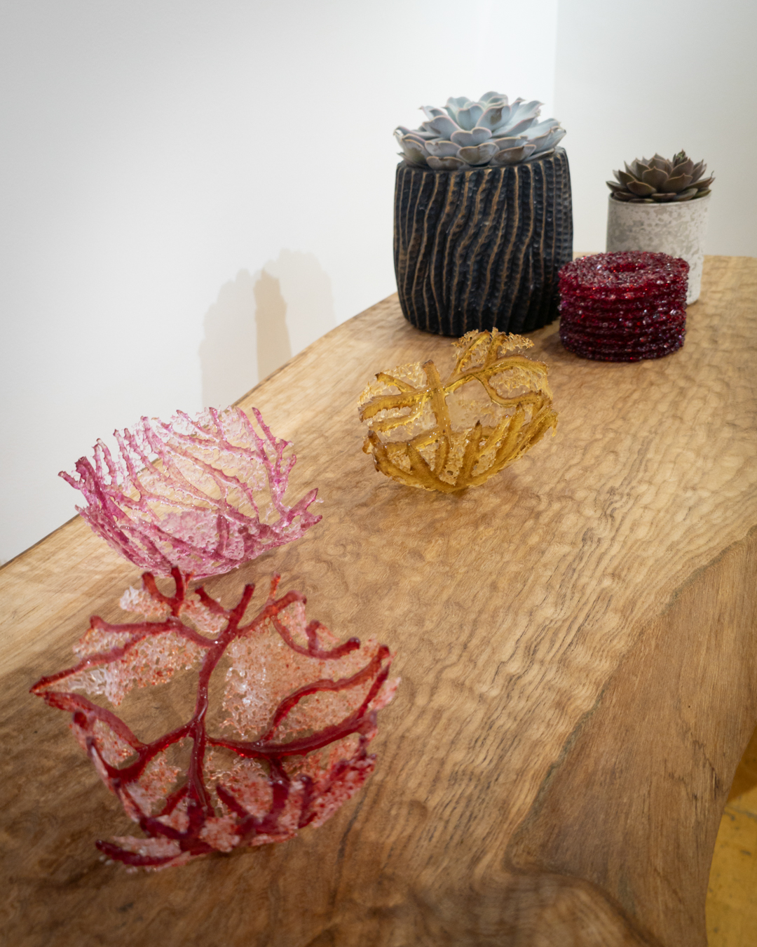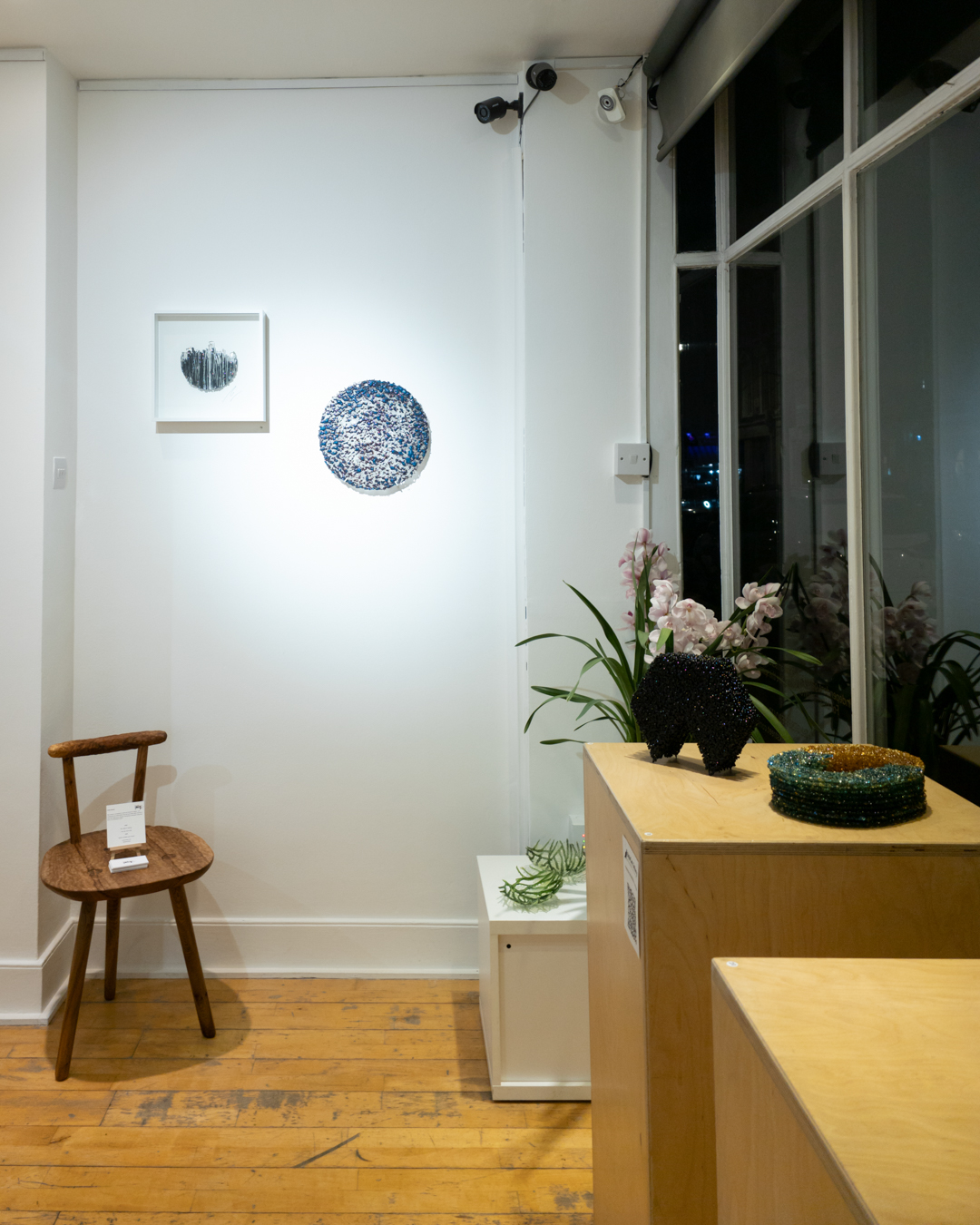 Kira’s solo show with BobCat Gallery is a cosy presentation of beautiful glass sculptures styled in a homely interior filled with plants and furniture carved by Julian Emsley (@julianemsley). The contrast of textures really enhances the gravitas of some of Kira’s layered pieces, particularly the ominous Superposition Black Hexagon which stands precariously on four ‘legs’.