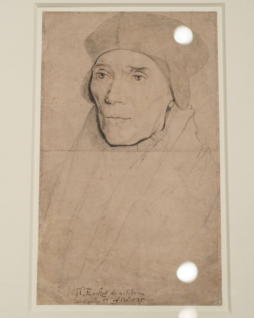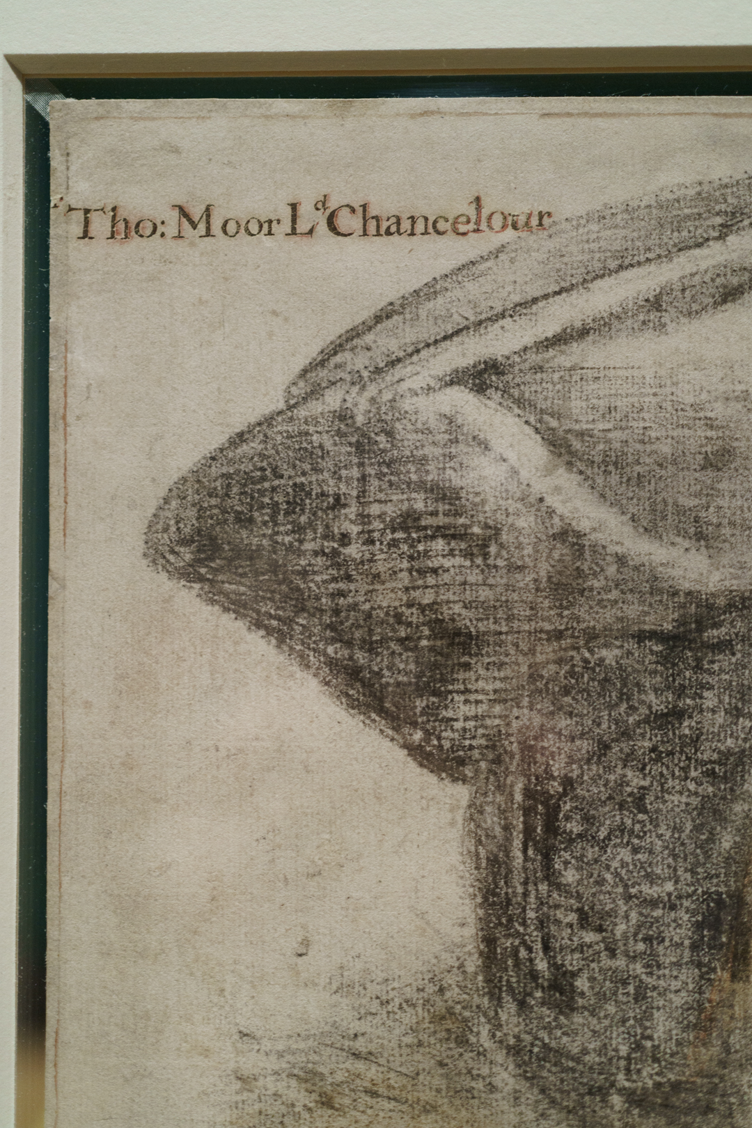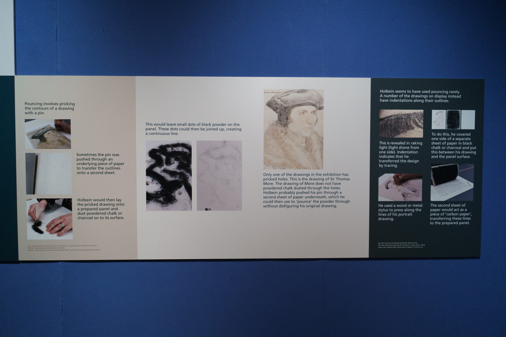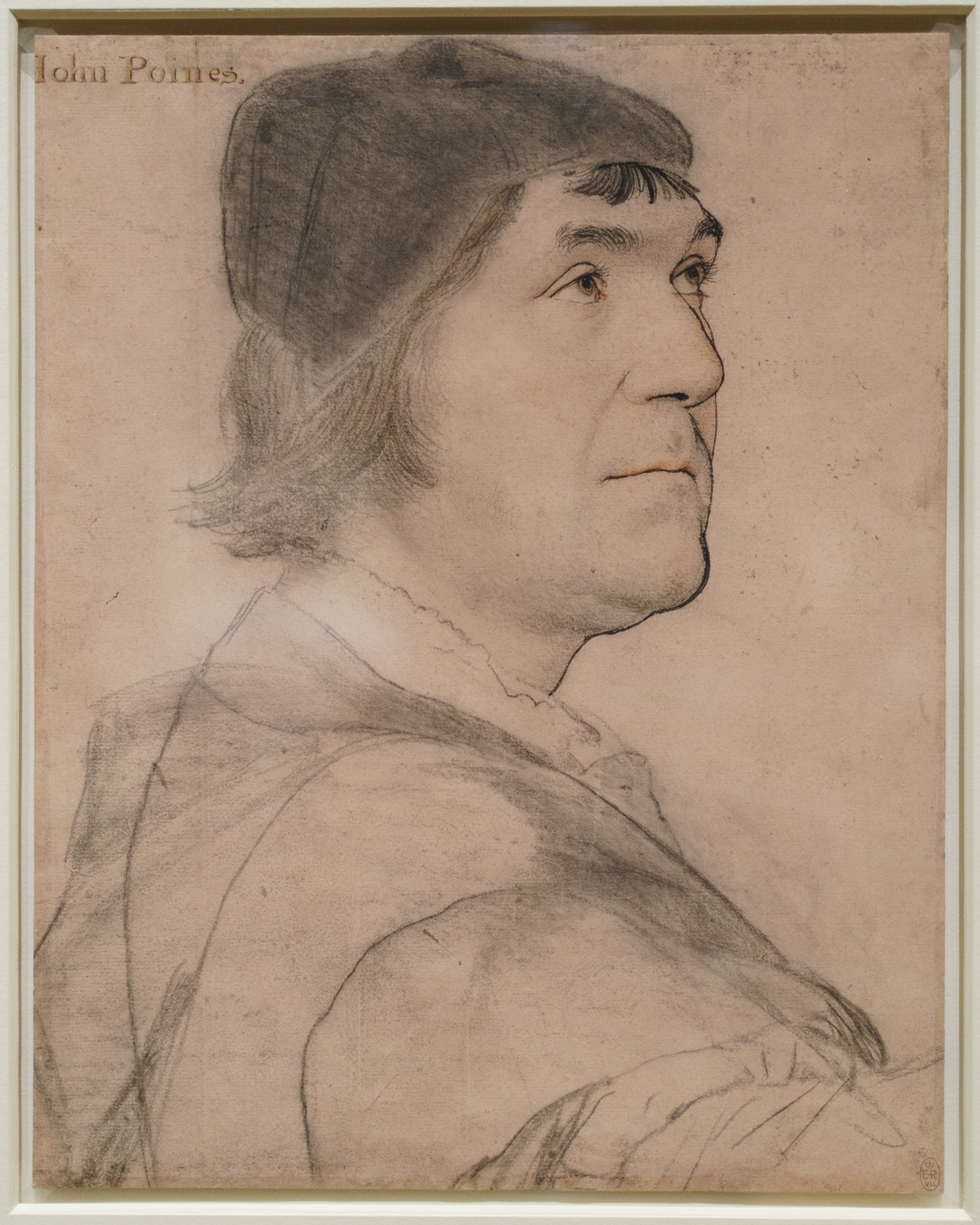 An unexpected bonus for visitors, I think, was the pricked drawing for More’s famous portrait in the Frick Collection. This was used to create extra cartoons that would actually be used for transferring the composition to the oak panel. The Royal Collection doesn’t borrow works for their exhibitions, so it was a shame the timeliness of the US institution’s present renovations and recent lending opportunities couldn’t allow for a reunion. The same is true of the reduced copy of the lost Whitehall Mural, for which the National Portrait Gallery holds a surviving cartoon fragment.