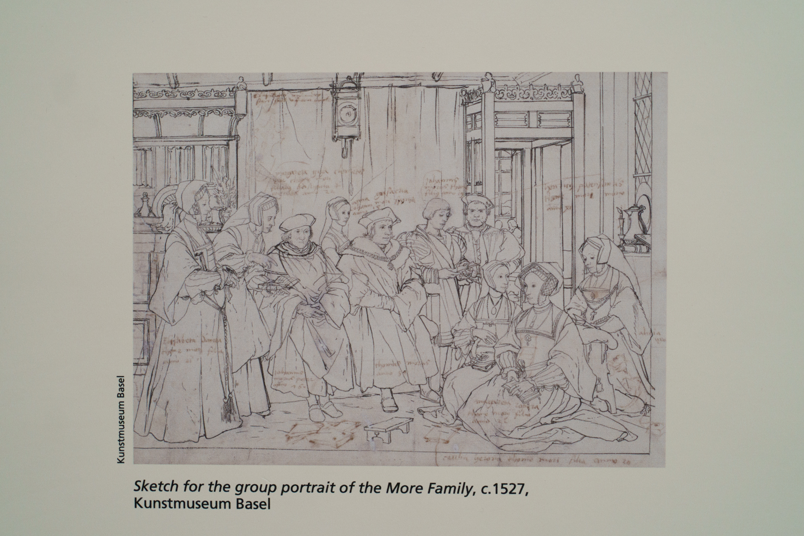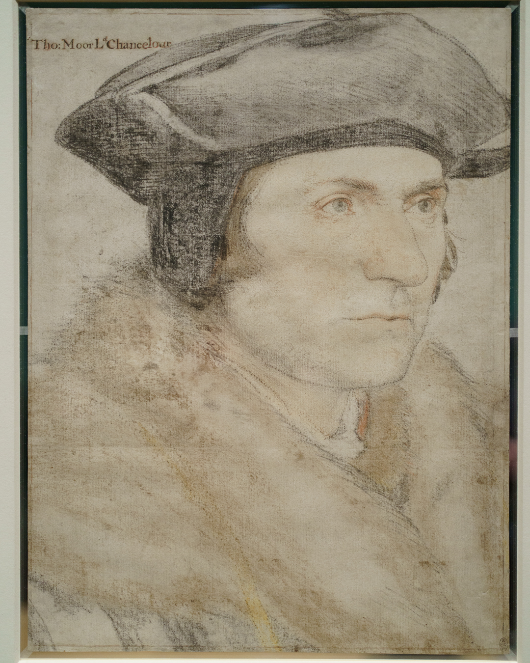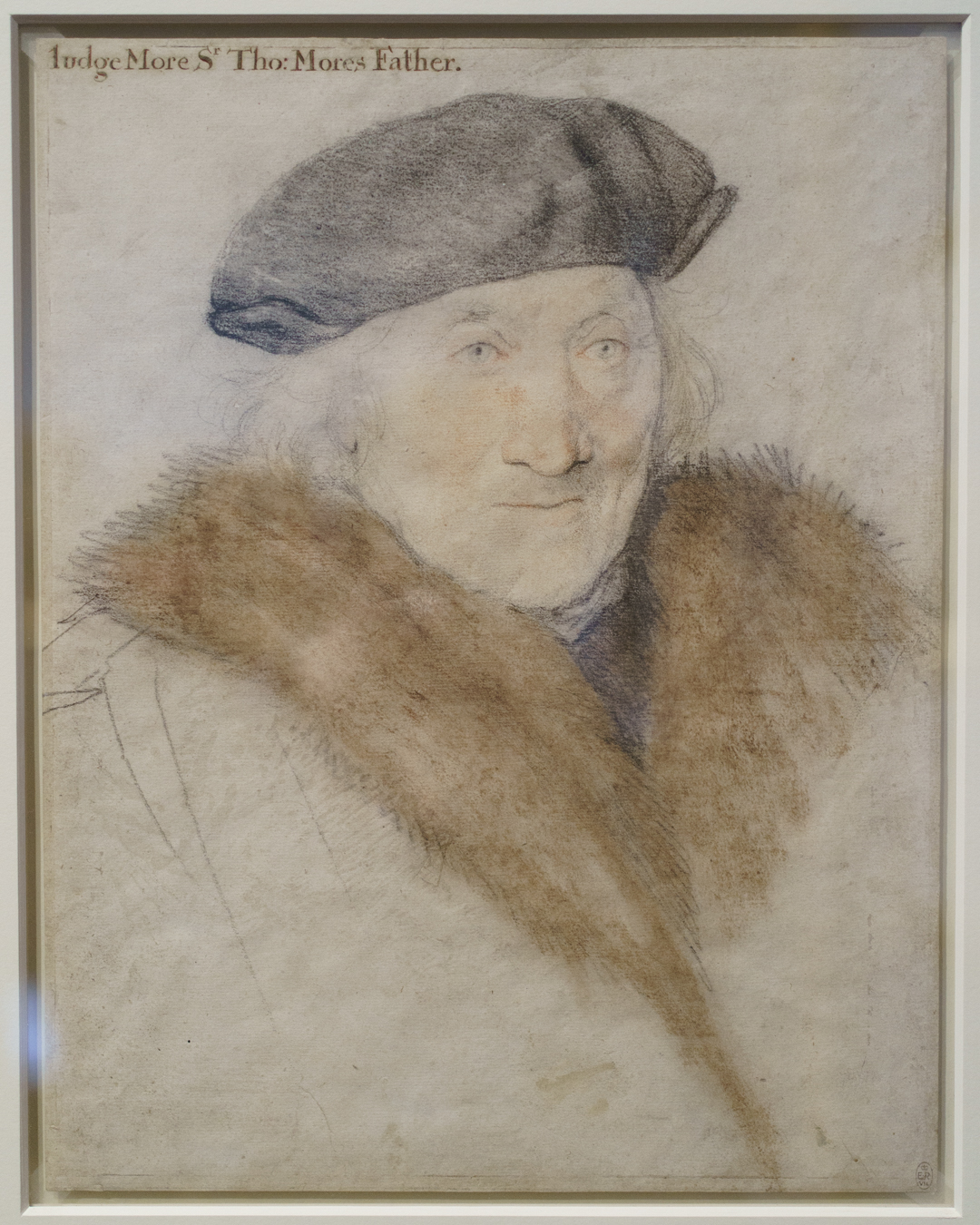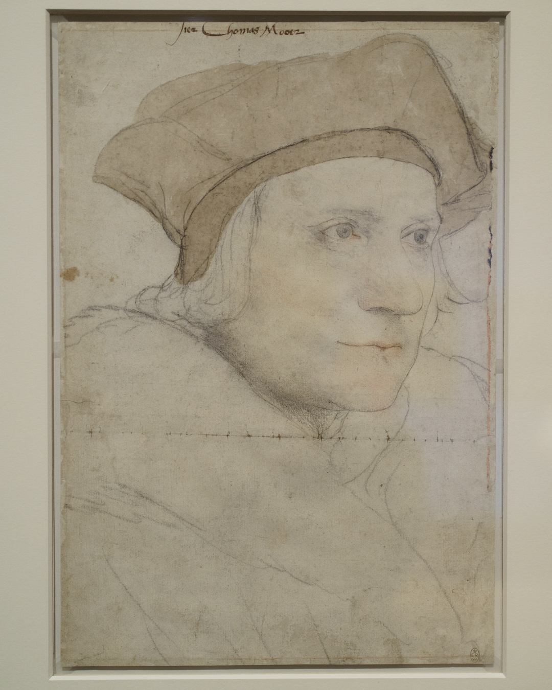An unexpected bonus for visitors, I think, was the pricked drawing for More’s famous portrait in the Frick Collection. This was used to create extra cartoons that would actually be used for transferring the composition to the oak panel. The Royal Collection doesn’t borrow works for their exhibitions, so it was a shame the timeliness of the US institution’s present renovations and recent lending opportunities couldn’t allow for a reunion. The same is true of the reduced copy of the lost Whitehall Mural, for which the National Portrait Gallery holds a surviving cartoon fragment.