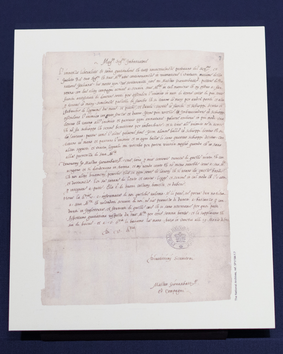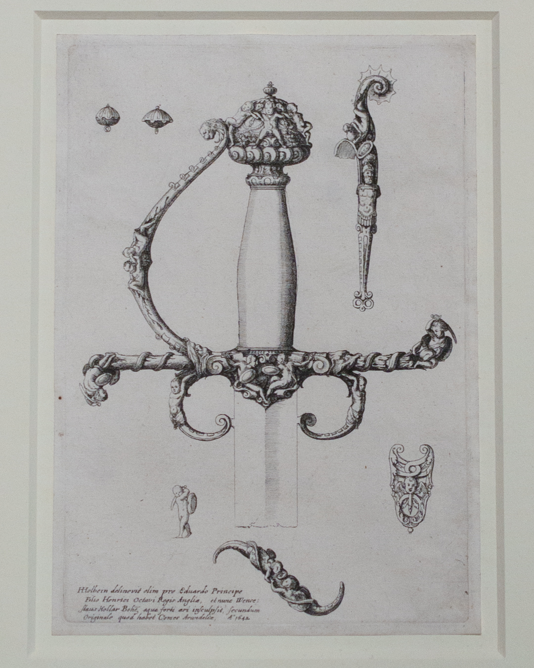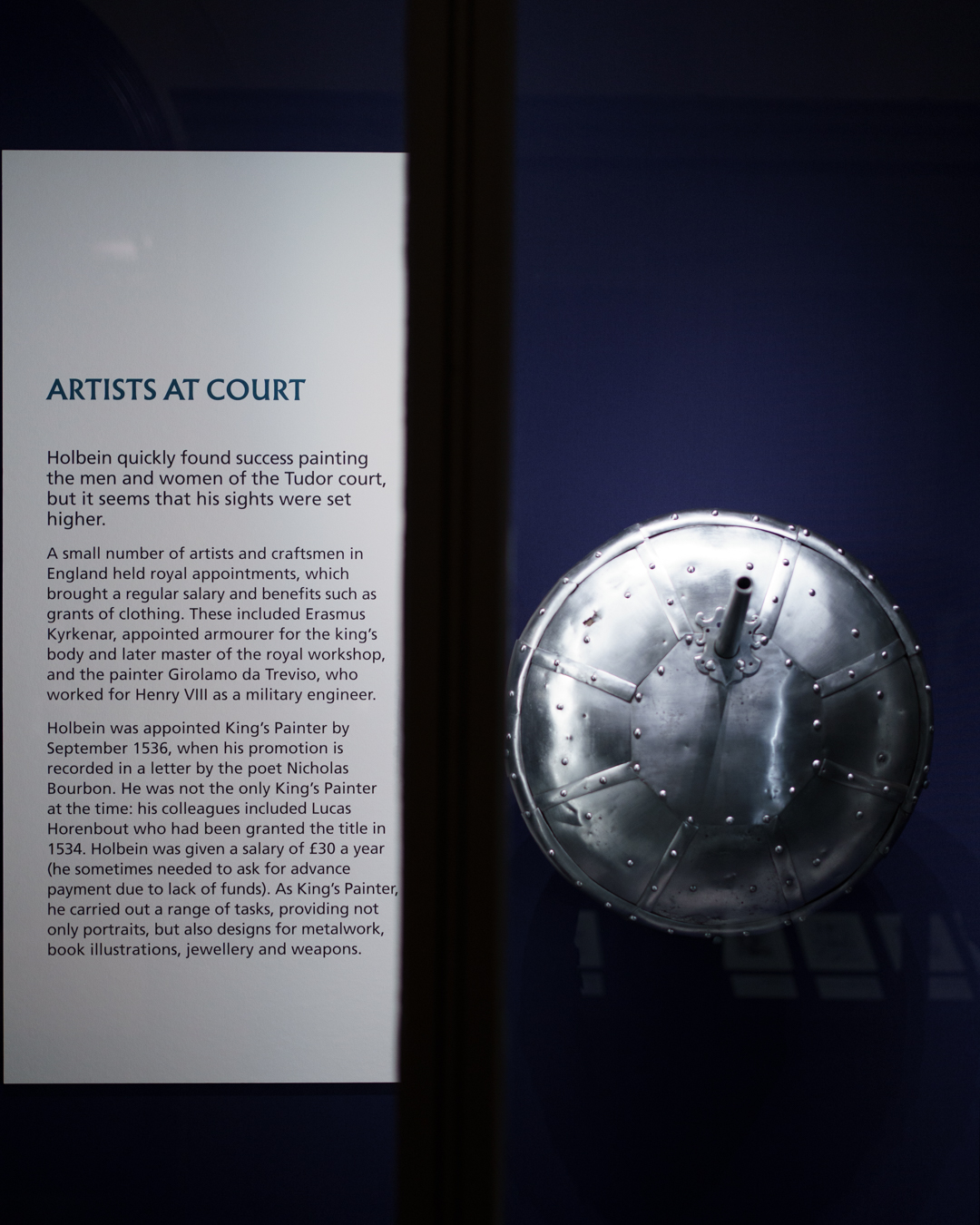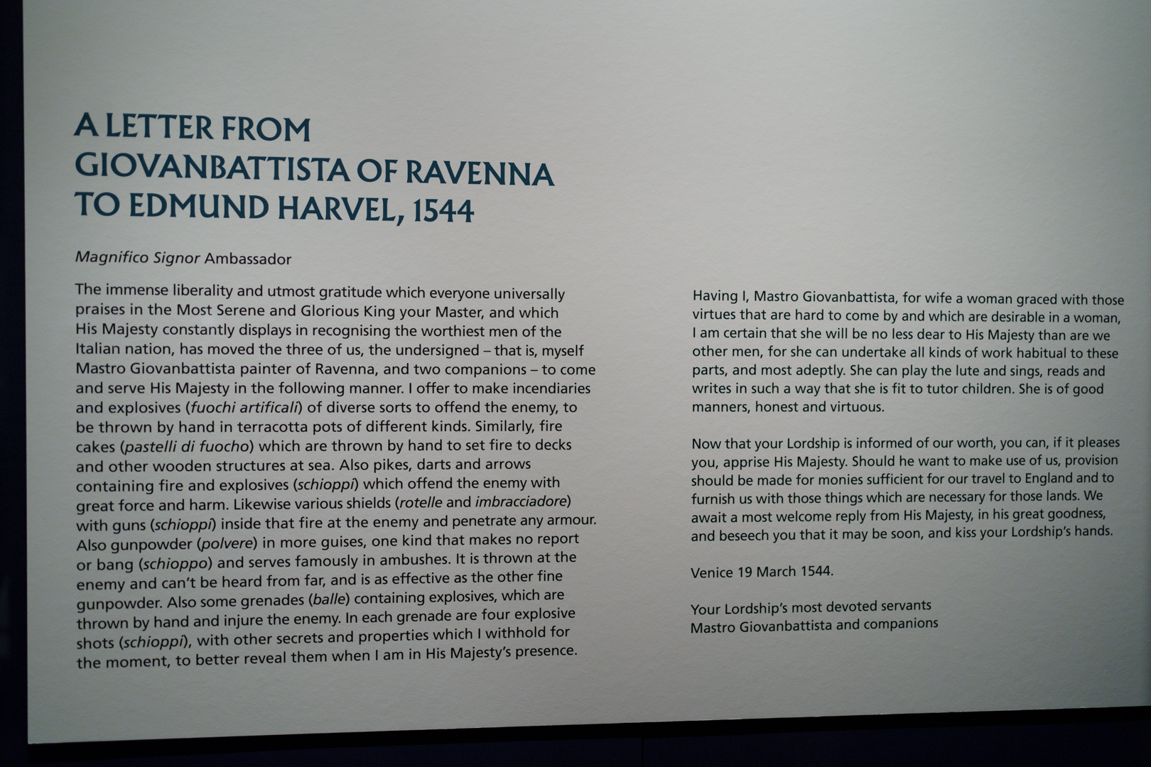 In the corridor leading up to the impressive finale devoted to the reign of Henry VIII was a little side section exploring Holbein’s involvement in designing metalwork and weaponry in his role as King’s Painter. A lot of people forget that being a court painter meant a huge range of tasks beyond just pretty portraits and decorative schemes. Innovative military knowledge was a top criterion. A transcription of Giovanbattista of Ravenna’s solicitation letter for employment in Henry VII’s court offered some insight into this (original in the National Archives: SP 1/184 f.7.)