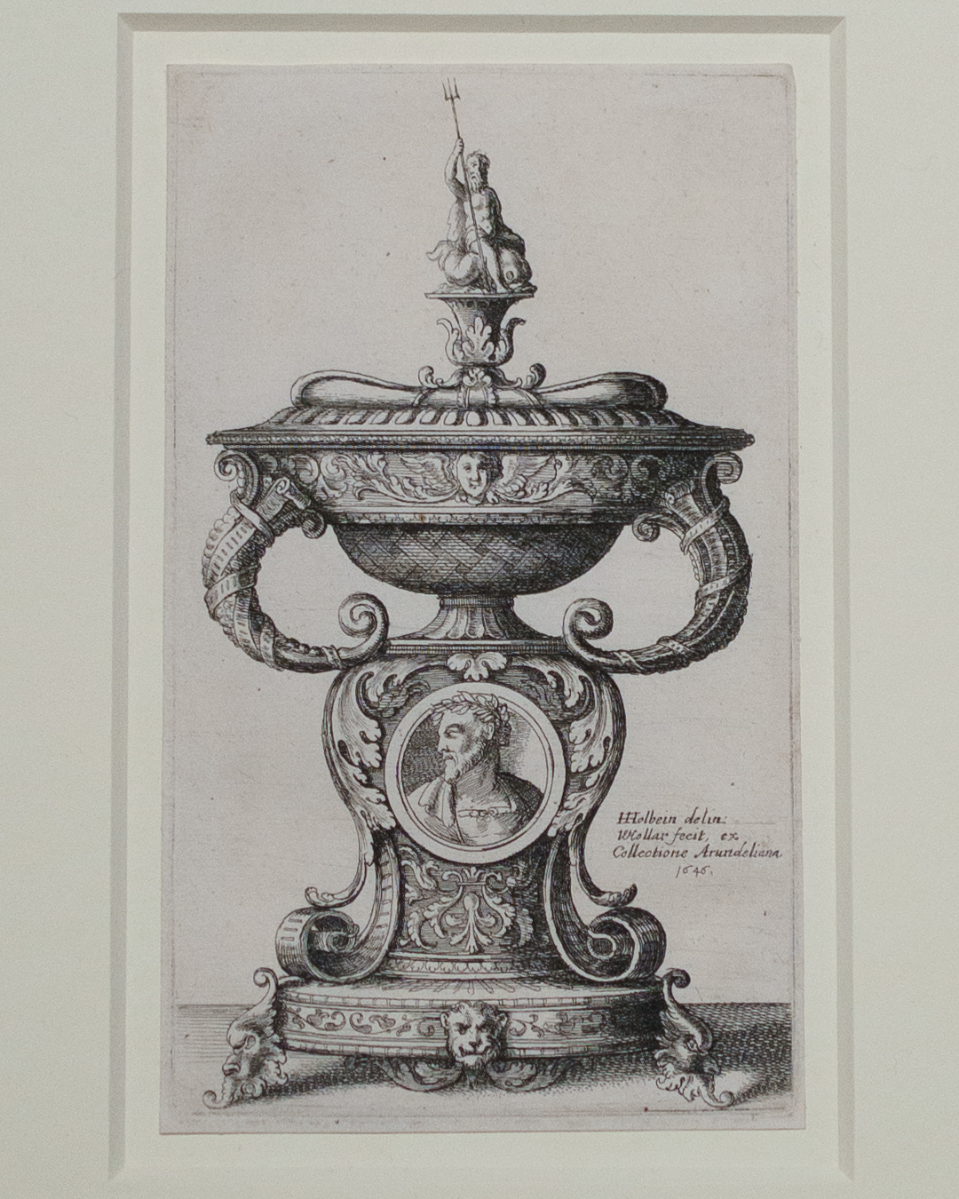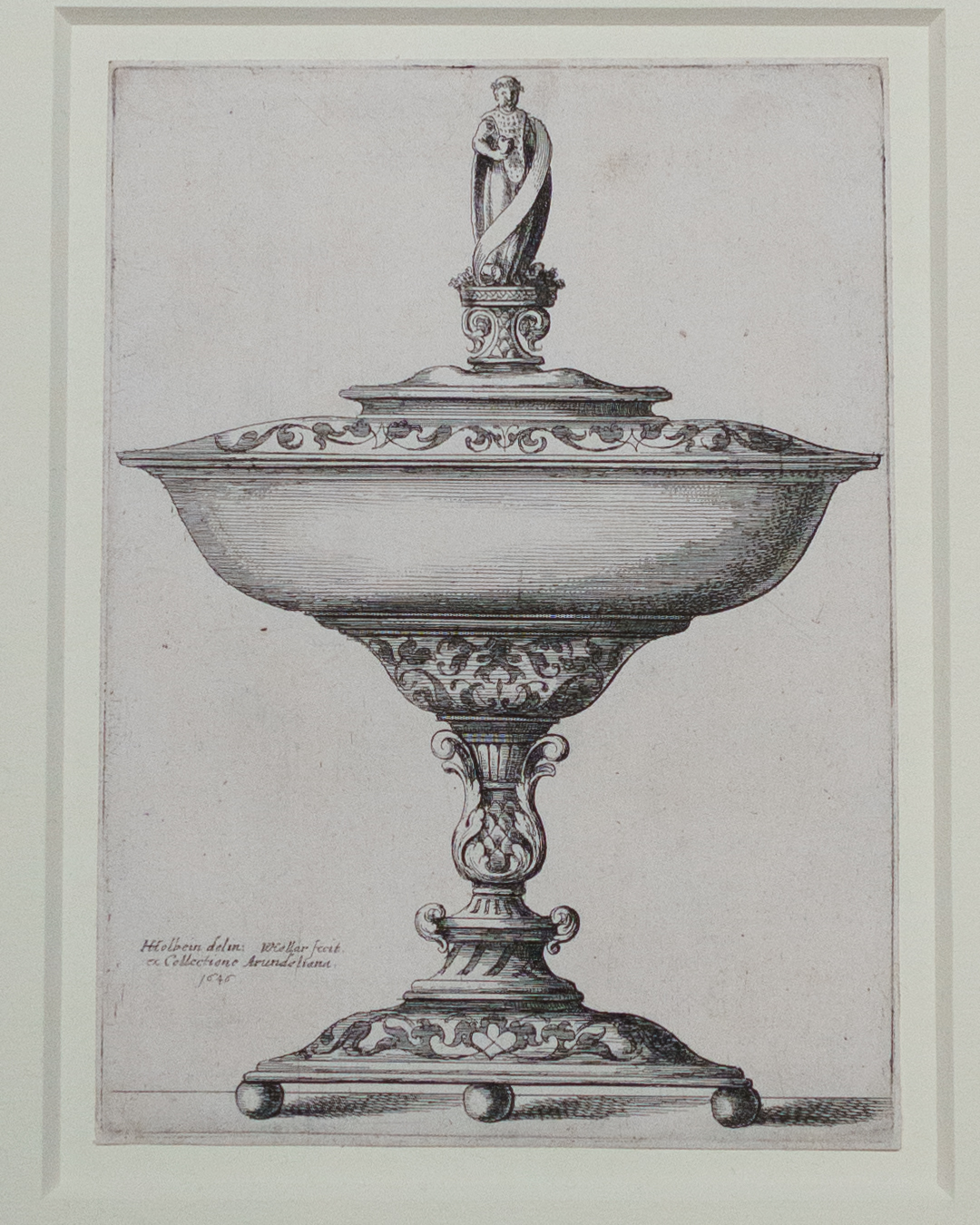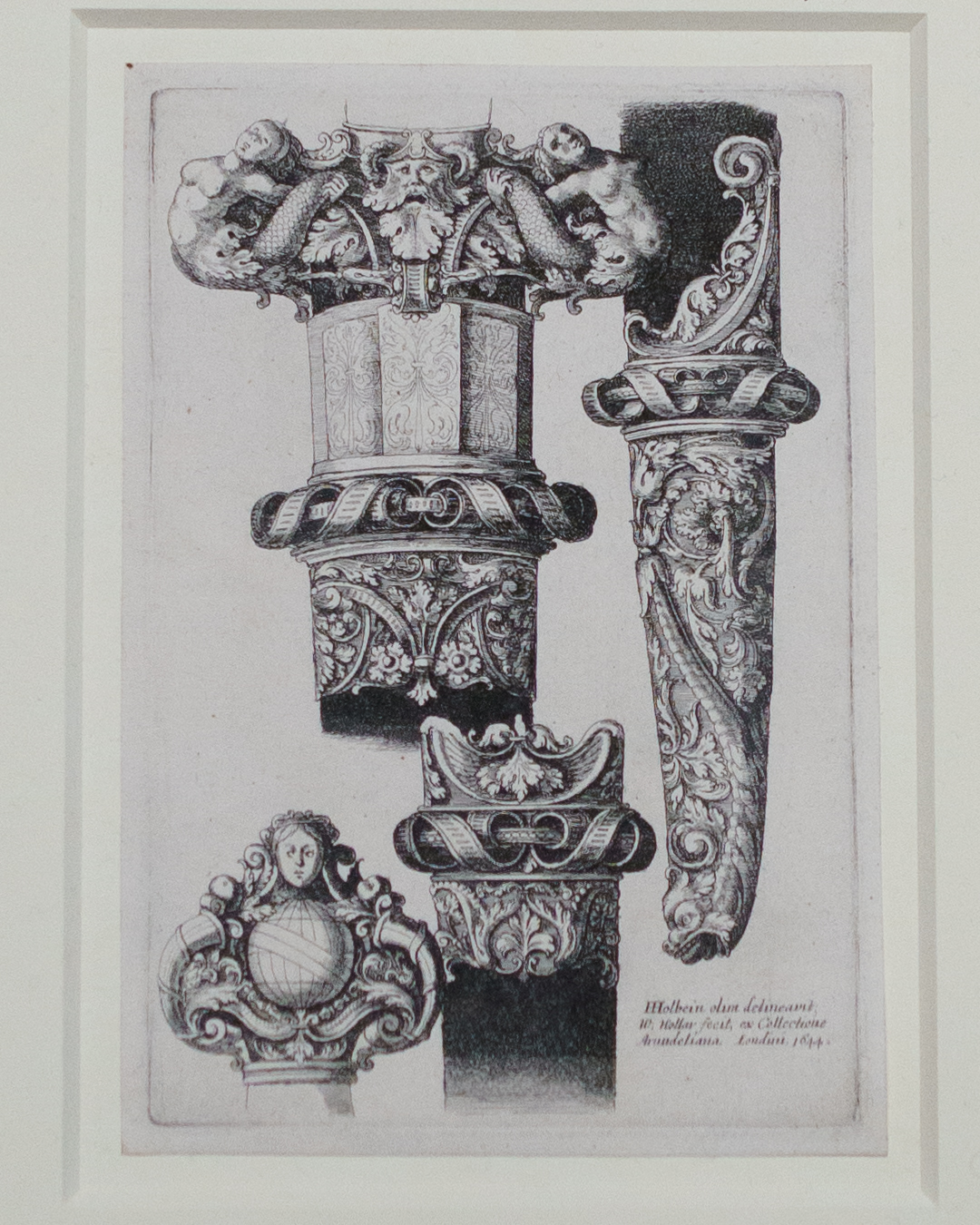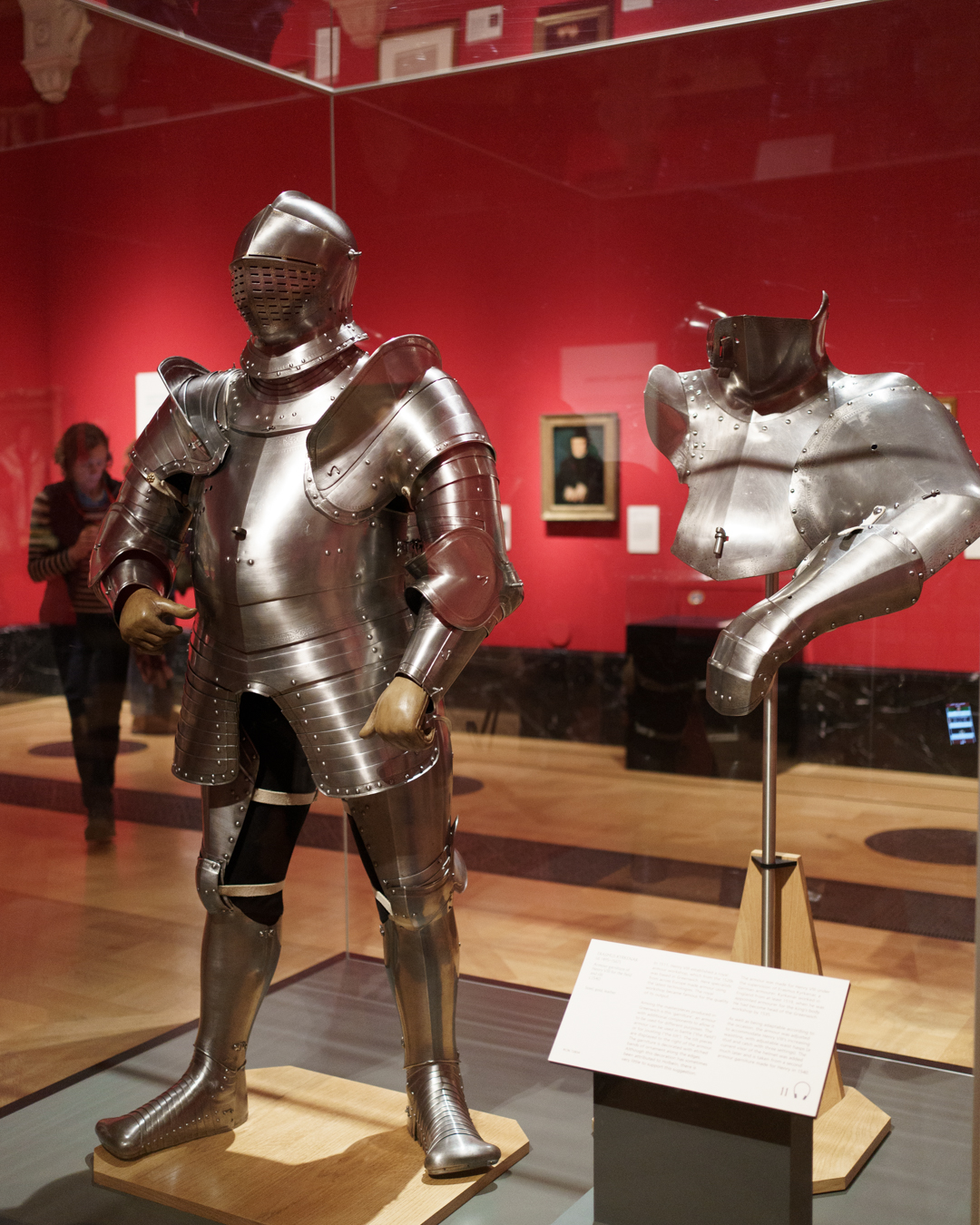 In the corridor leading up to the impressive finale devoted to the reign of Henry VIII was a little side section exploring Holbein’s involvement in designing metalwork and weaponry in his role as King’s Painter. A lot of people forget that being a court painter meant a huge range of tasks beyond just pretty portraits and decorative schemes. Innovative military knowledge was a top criterion. A transcription of Giovanbattista of Ravenna’s solicitation letter for employment in Henry VII’s court offered some insight into this (original in the National Archives: SP 1/184 f.7.)