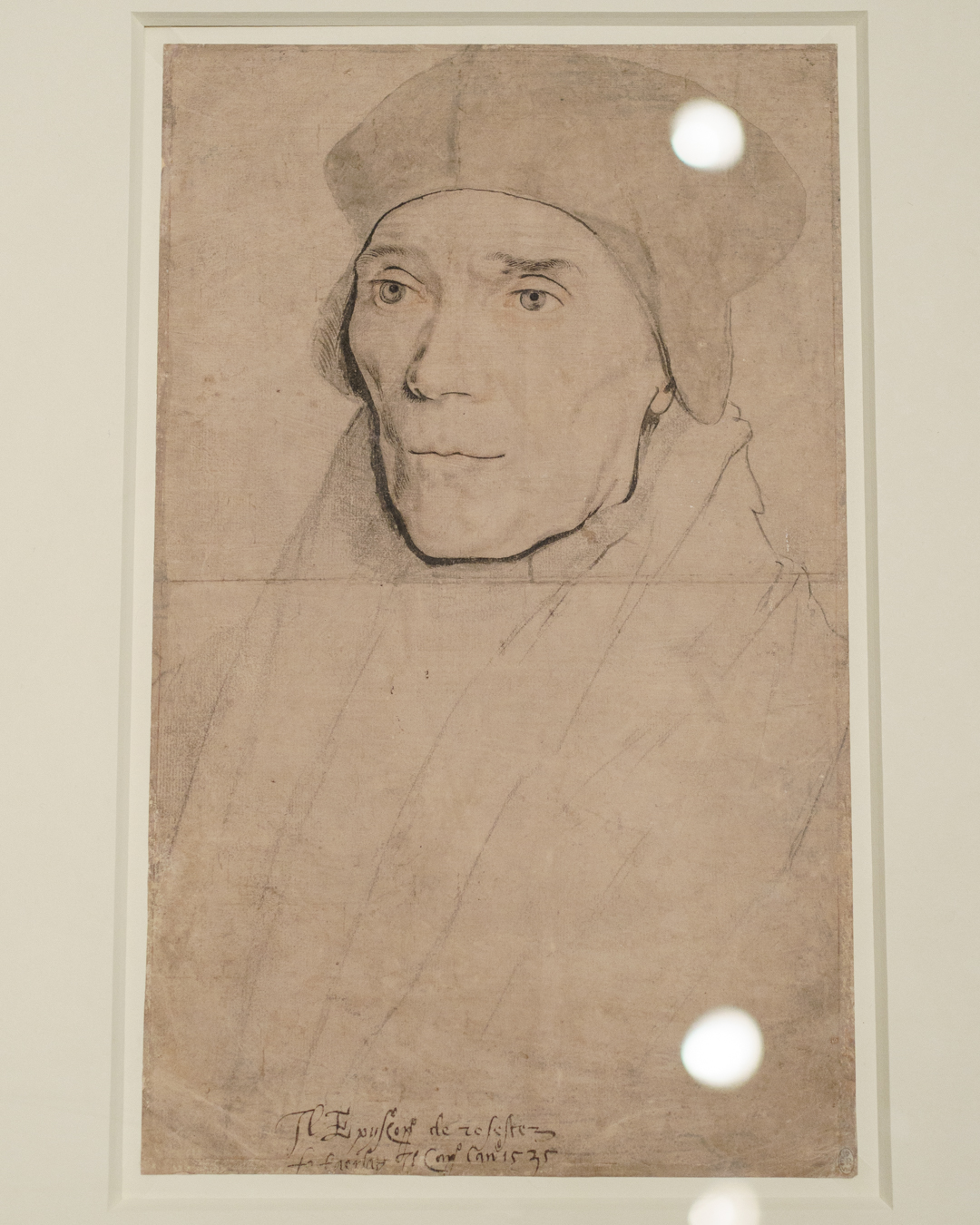 As soon as we approached the portrait drawings of Sir Thomas More’s family, it was immediately clear how big an impact he had, their likenesses practically leaping from the page, some with lovely little annotations for colours and clothing materials. In the following rooms, visitors saw Holbein’s working methods at play, first sketching in coloured chalks, adding colours and comments, and sometimes drawing extra detail studies on the side in pen and ink. You can clearly see his pragmatism to record all the details necessary to portray his sitters in paint.