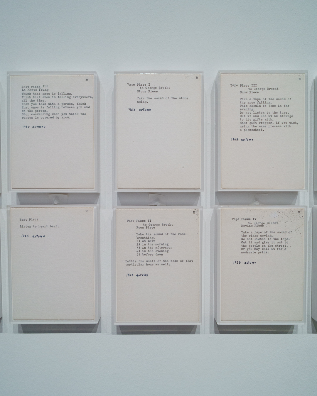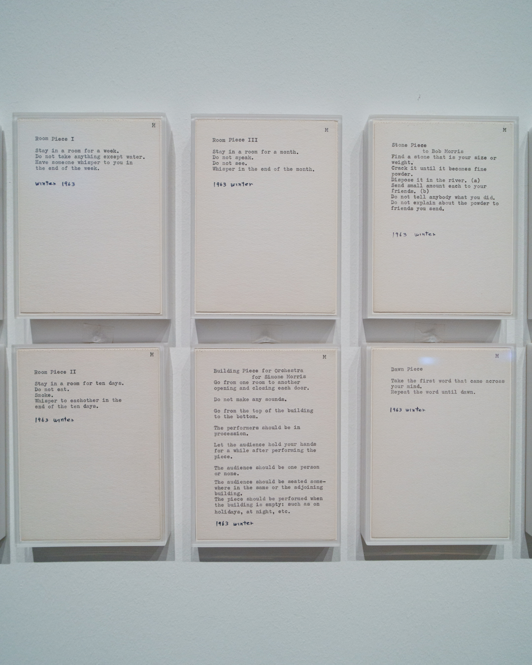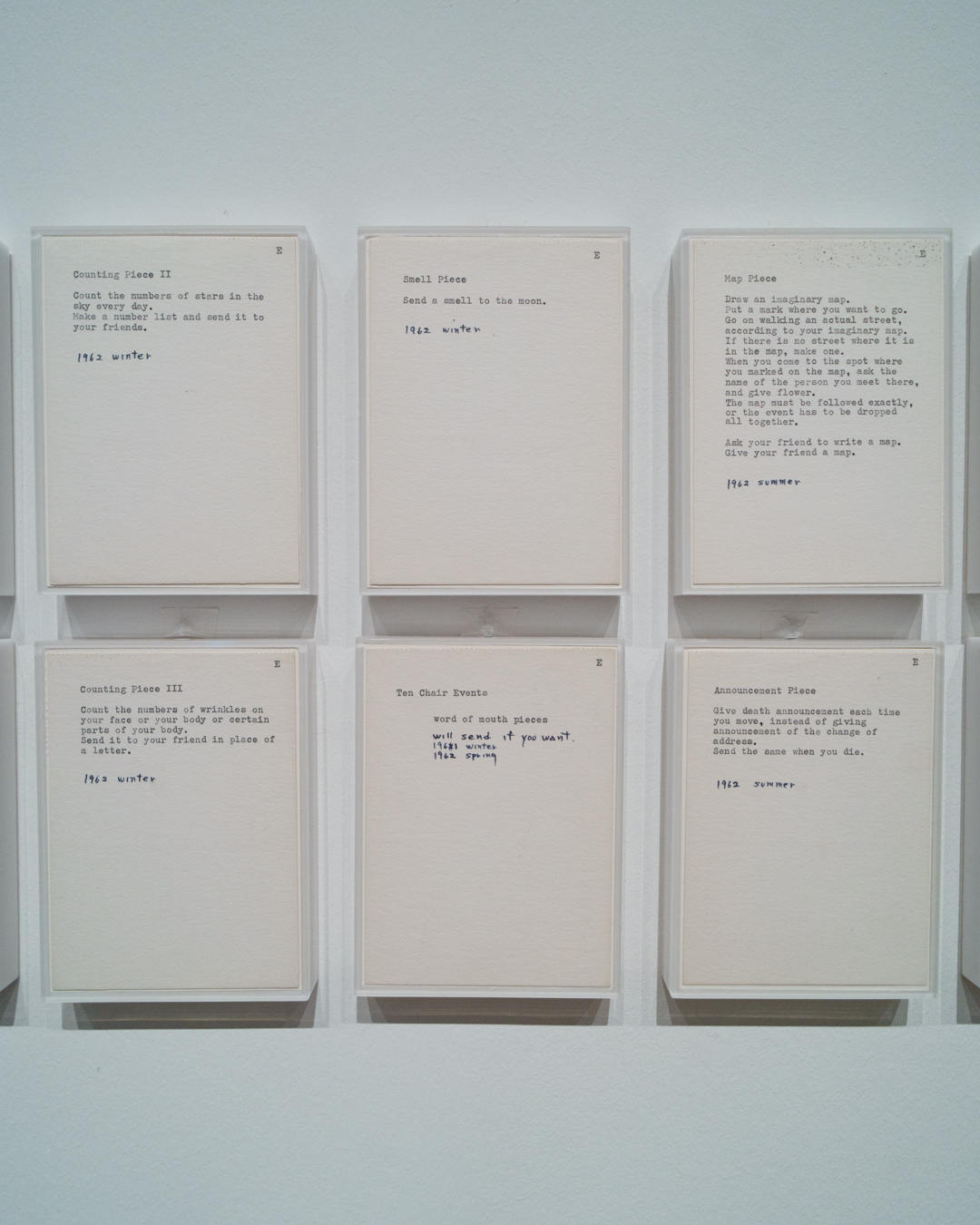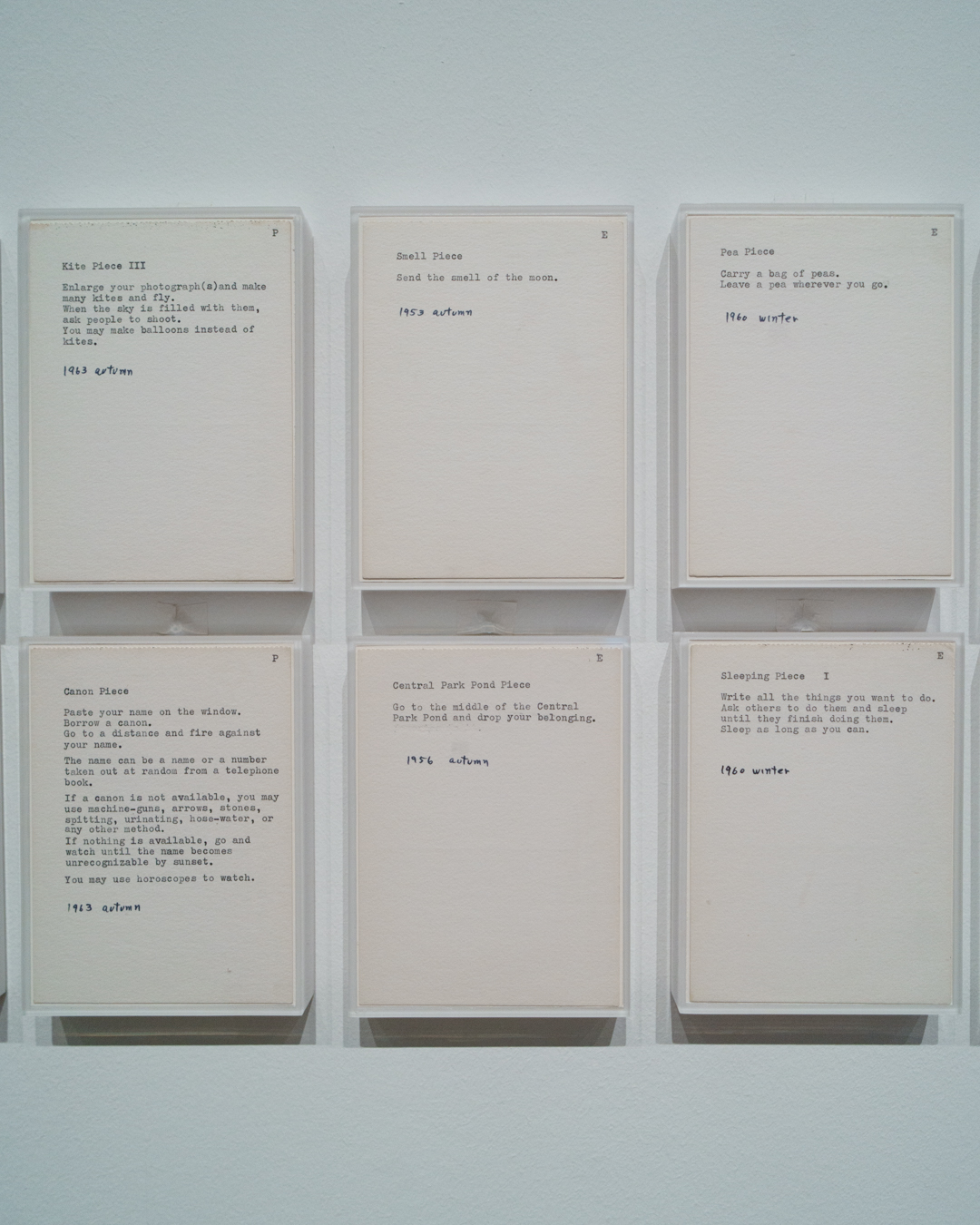 From what I could surmise from Ono’s diverse output represented in this exhibition, her practice was quite community-focused and participatory, imbuing them with spiritual concepts into a kind of life ritual. The Grapefruit series is perhaps the best demonstration of this, filled with all sorts of meditative instructions that occasionally require one or more participants to activate. I gave White Chess Set a try (‘For playing as long as you can remember where all your pieces are’); it was a hilarious adventure.