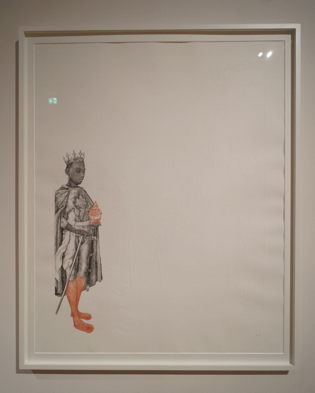 The National Portrait Gallery’s exhibition is a surprisingly light show featuring 22 contemporary artists exploring the Black figure in art, discussing themes of identity, perception, presence/absence, memorialisation, and community. Thomas J. Price’s large sculpture at the beginning of the corridor is a strong starting piece that celebrates the Black community.