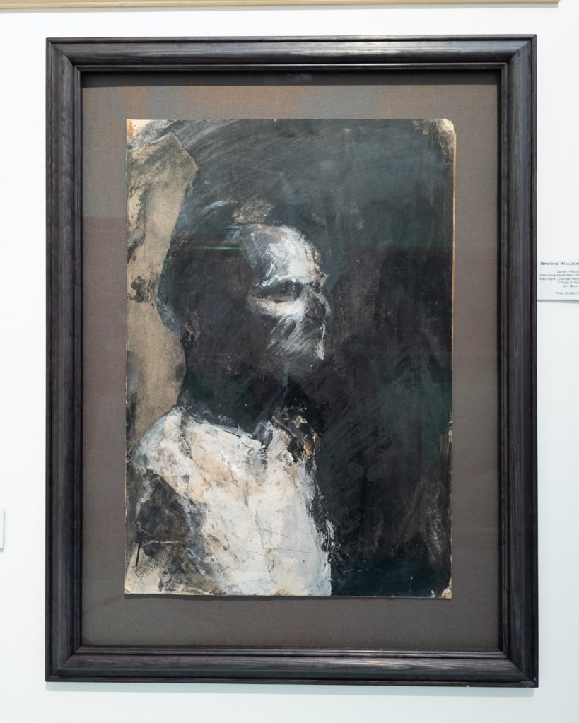 Zacron, Head Study (Death Mask of Rousseau), 1965, wax crayon, charcoal, pencil, gouache, and collage on paper (Brooke-Walder Gallery, stand 5)