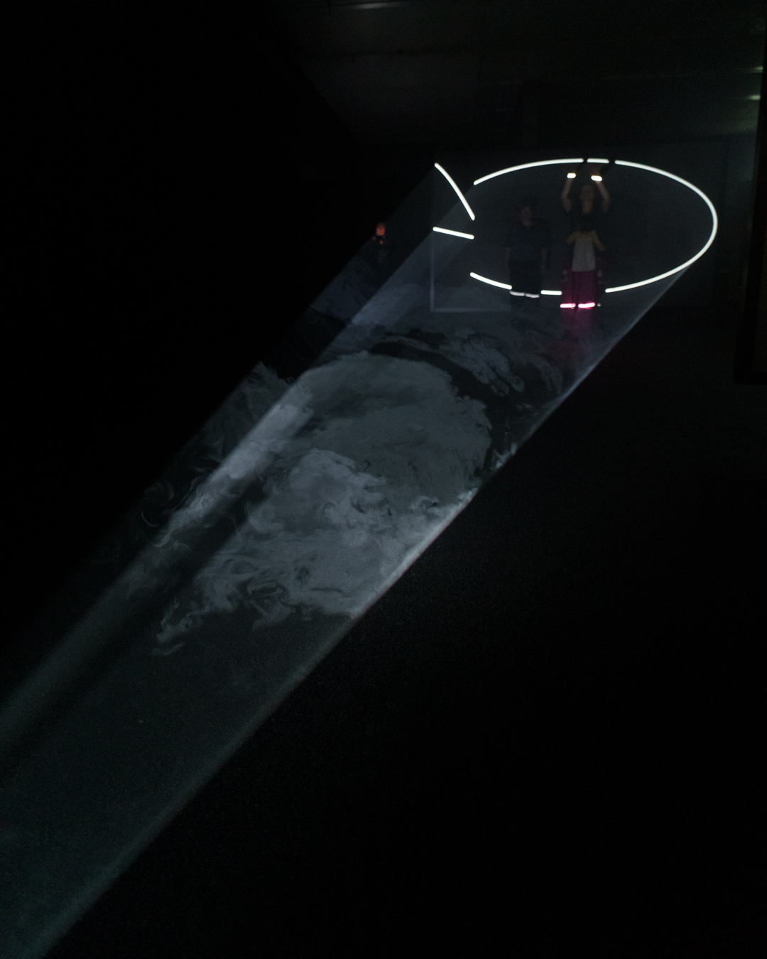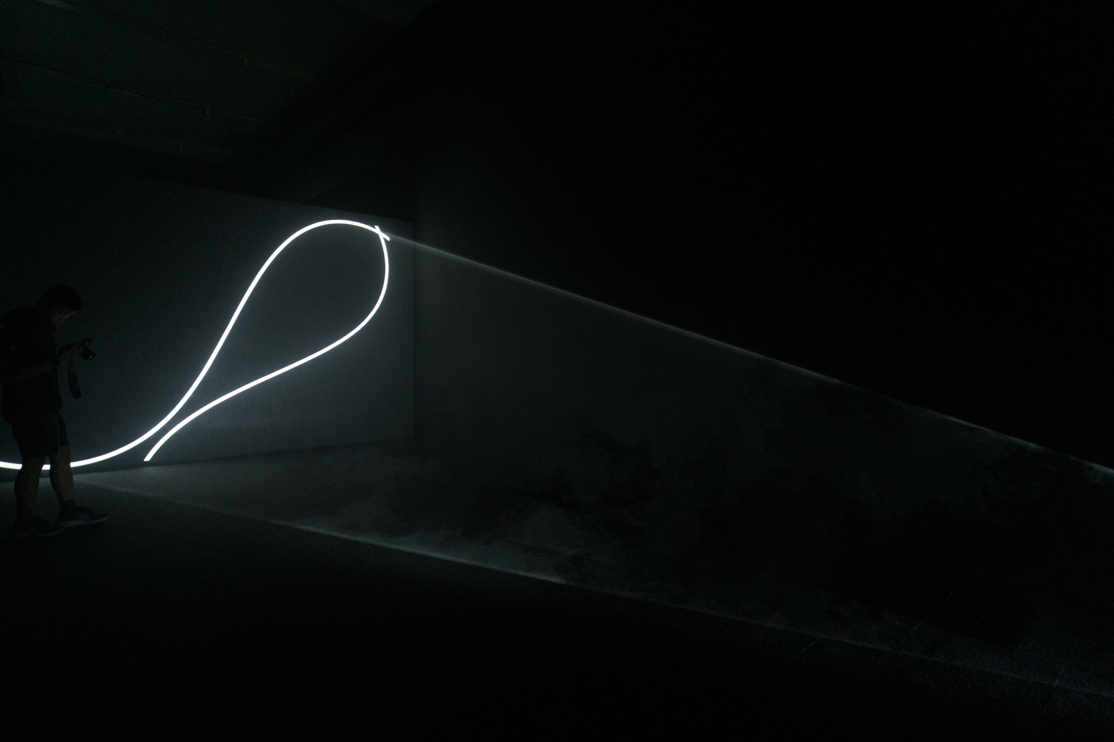 Where a waveform intersects with itself, the illusion can appear like physical shelves. It was incredibly tempting to rest my hand on a horizontal ‘surface’ or even place my phone on it. Such is the power of simple trickery, which it genuinely is. The set up could probably be done at home with a projector and a fog machine. Yet the aesthetic experience is so great.