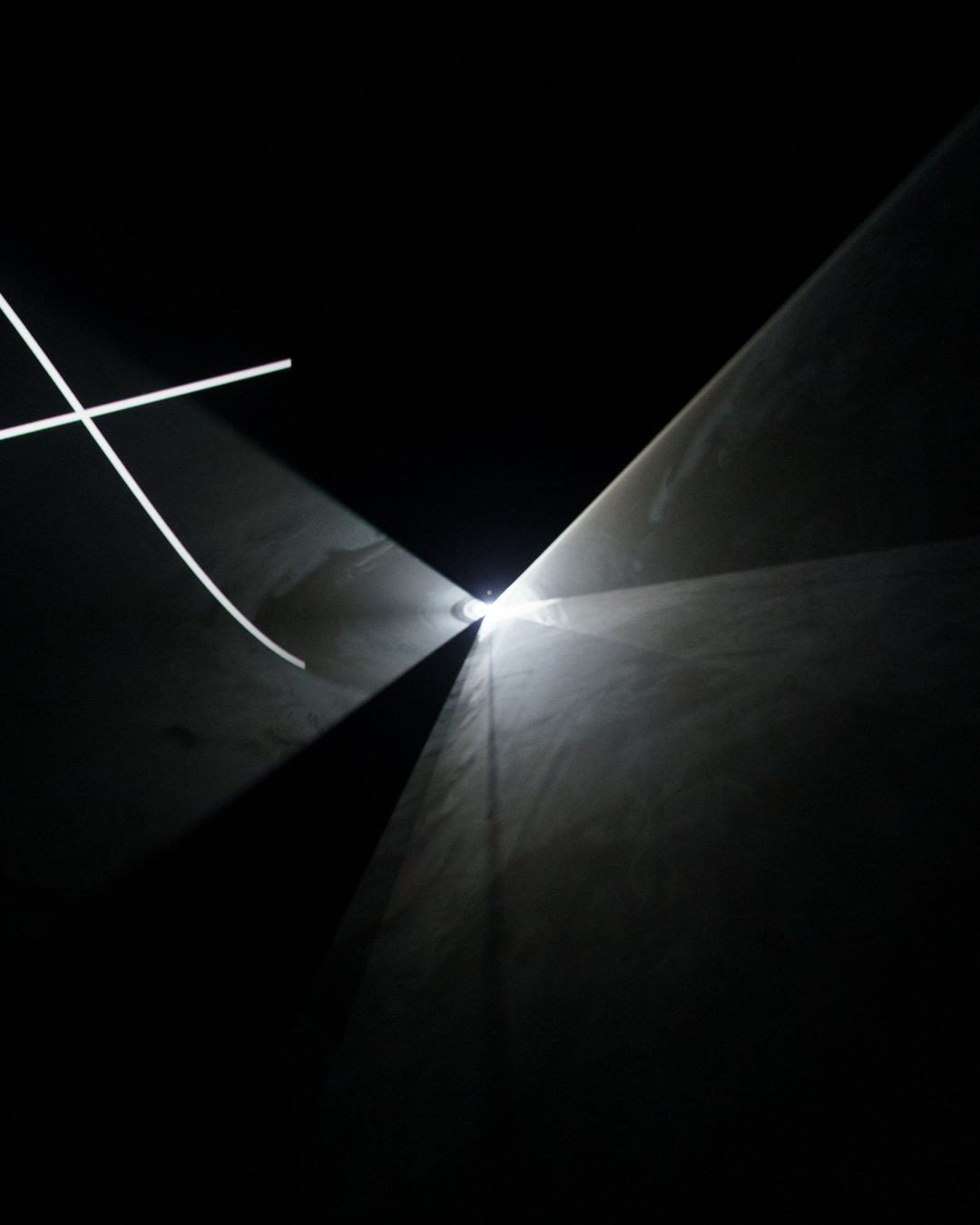 These projections are not static, however. With a little patience, you can see the physical shape and gradual movement of each waveform on the wall behind each piece. As such, the boundaries of the light moves incrementally in physical space. This causes some very quirky visual effects if you wait long enough.