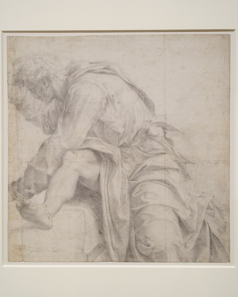 One of the first drawings to catch my eye, Daniele da Volterra‘s weighty study of a seated man, perhaps to become one of Christ’s disciples. The meticulous rendering of drapery has the feeling of sculpted marble.