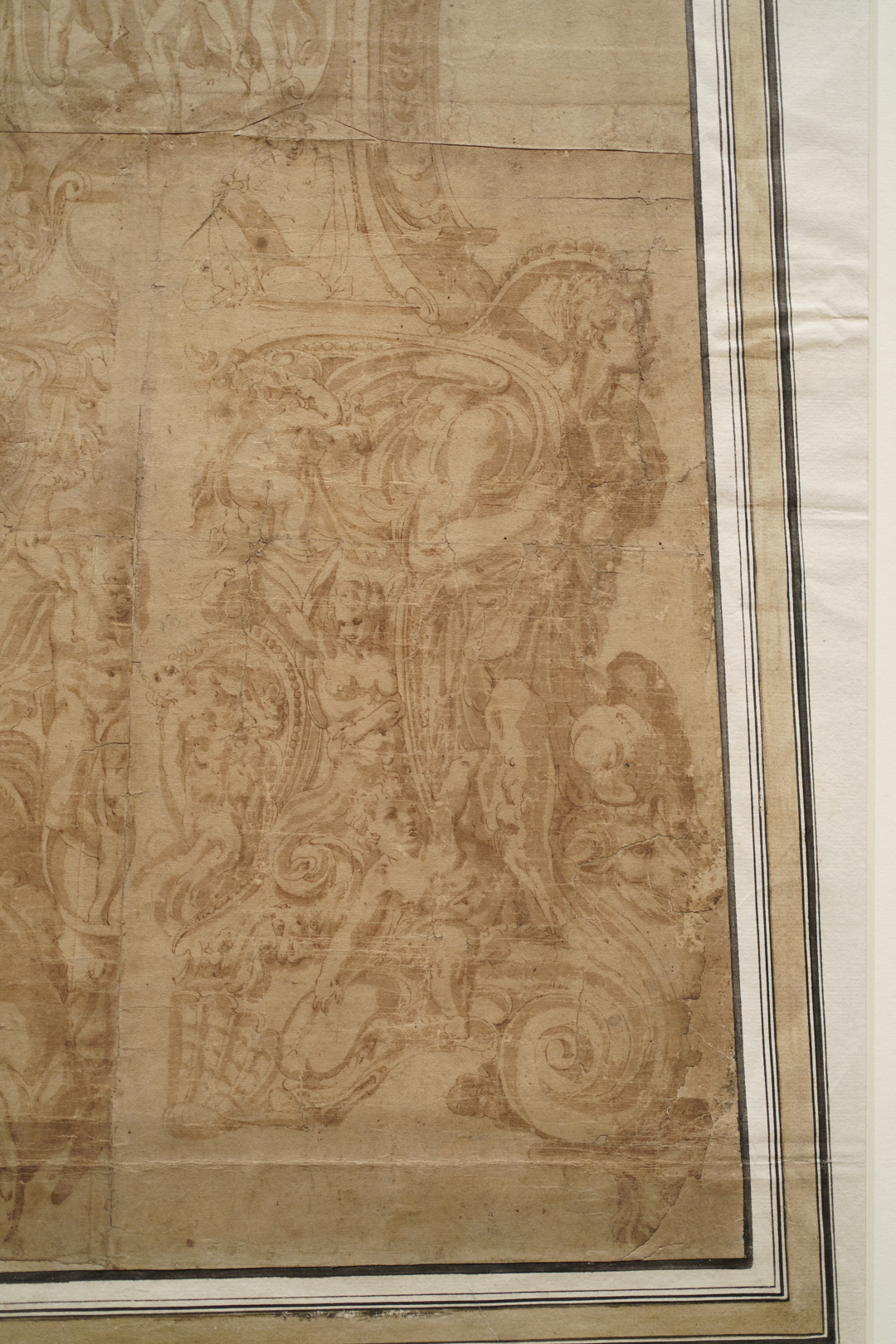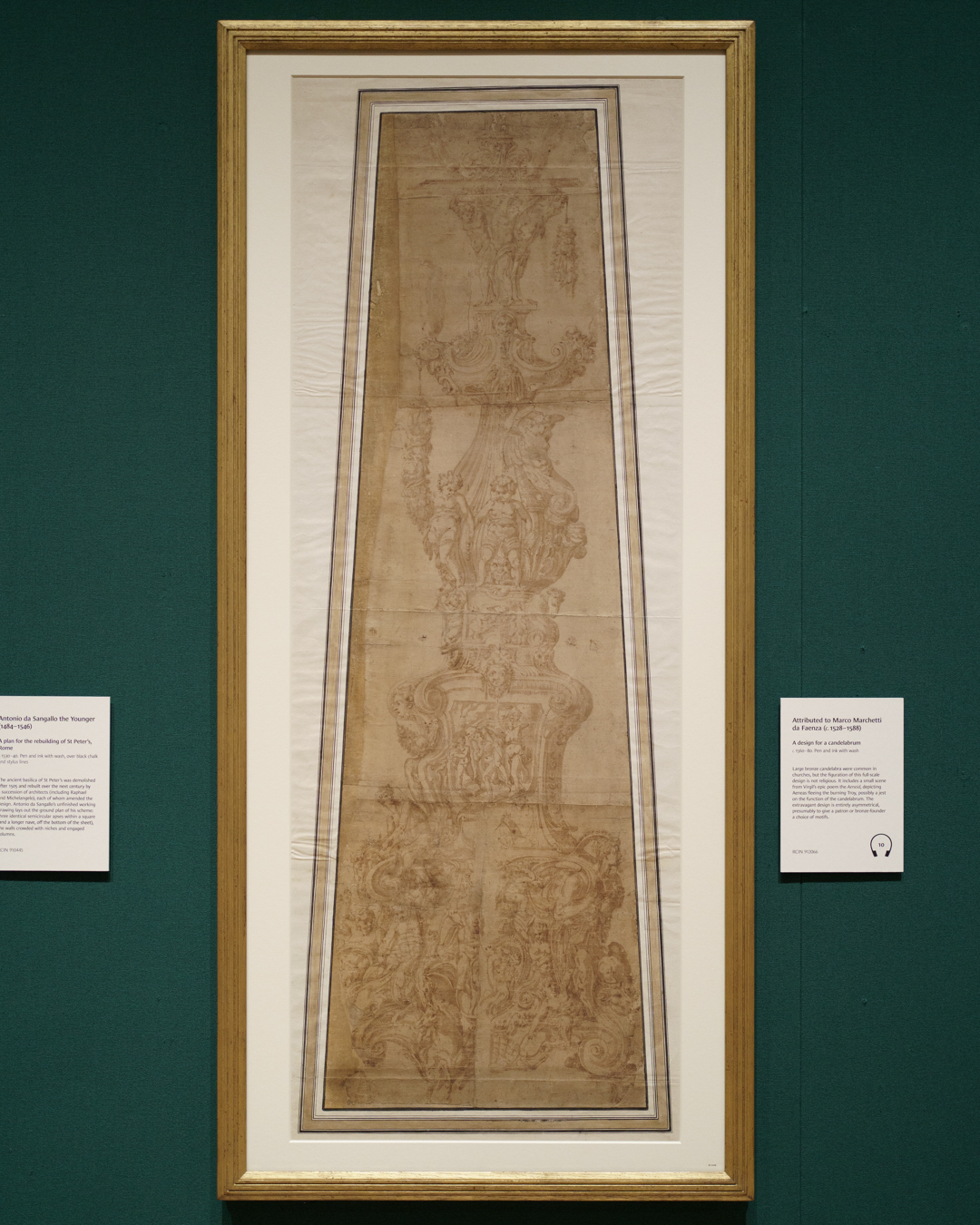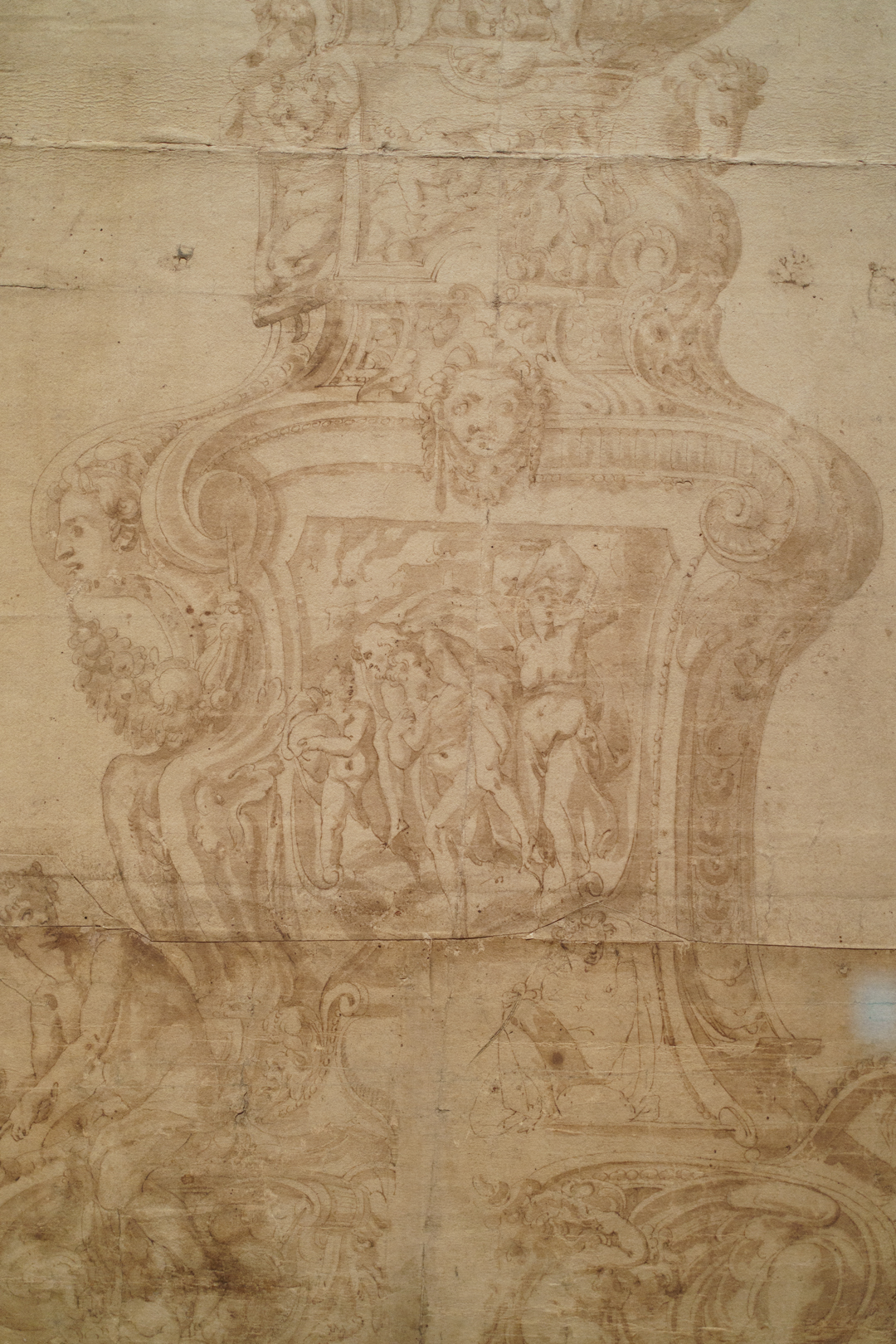 A massive, full-scale design for a candelabrum, attributed to Marco Marchetti da Faenza. Its assymmetrical nature suggests it had the mix-and-match function of offering the patron or bronze-founder a wide-ranging choice of motifs.