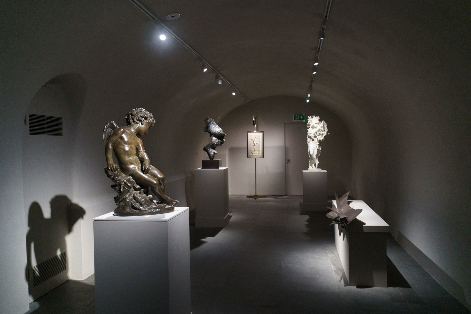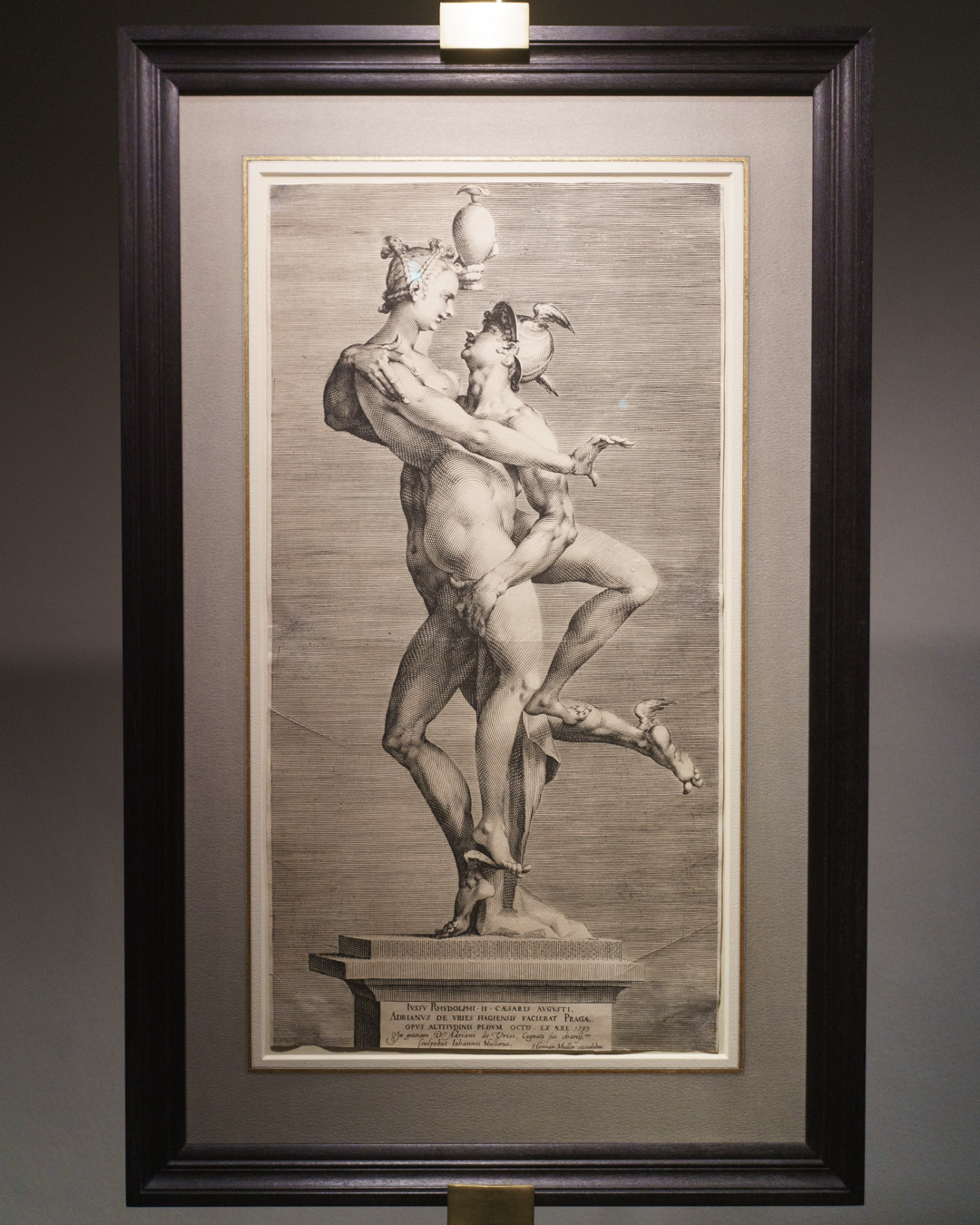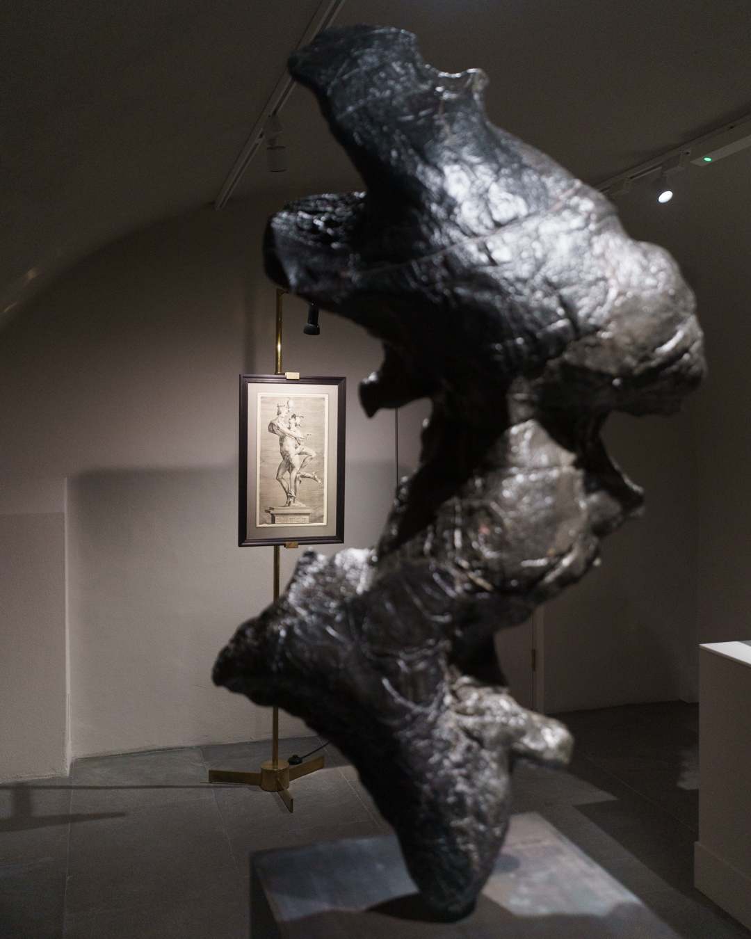 Surprisingly, the best part is in the crypt-like basement. Devoted exclusively to sculpture, one finds a kind of homage to figuration across the ages. Jean-Baptiste Carpeaux’s L’Amour Blessé (1873-75) invites us into the space, where we pass Anthony Caro’s Table Piece CLXXXII (1974) – perceived as a kind of reclining figure – and reach Brown’s recent marble sculpture Morbid Fancies (2024), which morphs from a classical figure into spirited flecks of oil paint and impasto. Yet the most playful object turns out to be another scholar’s rock, whose naturally serpentine form is eerily reminiscent of Adriaen de Vries’ Mercury and Psyche (1593), depicted in Jan Harmensz. Muller’s masterful engraving at the end of the room.