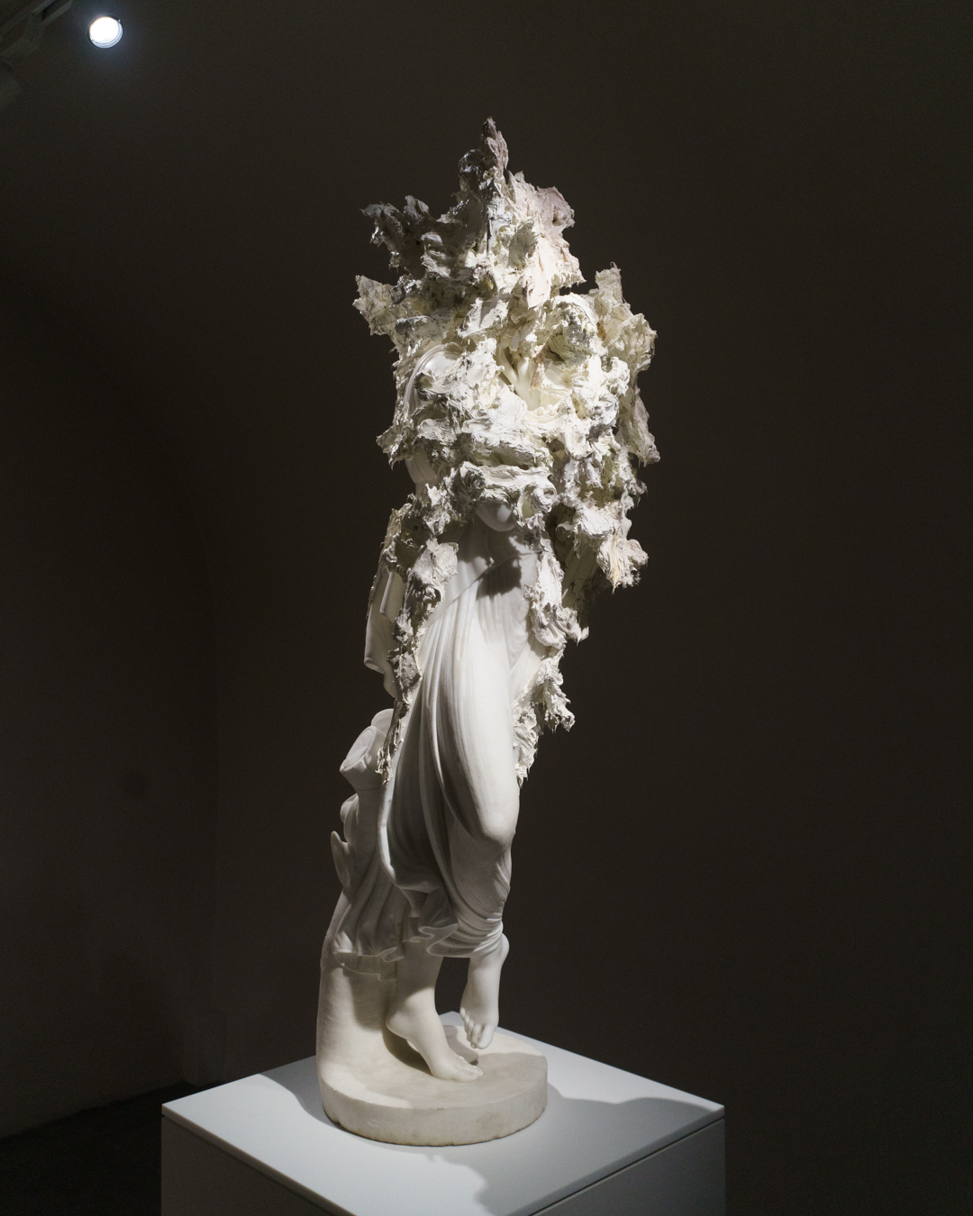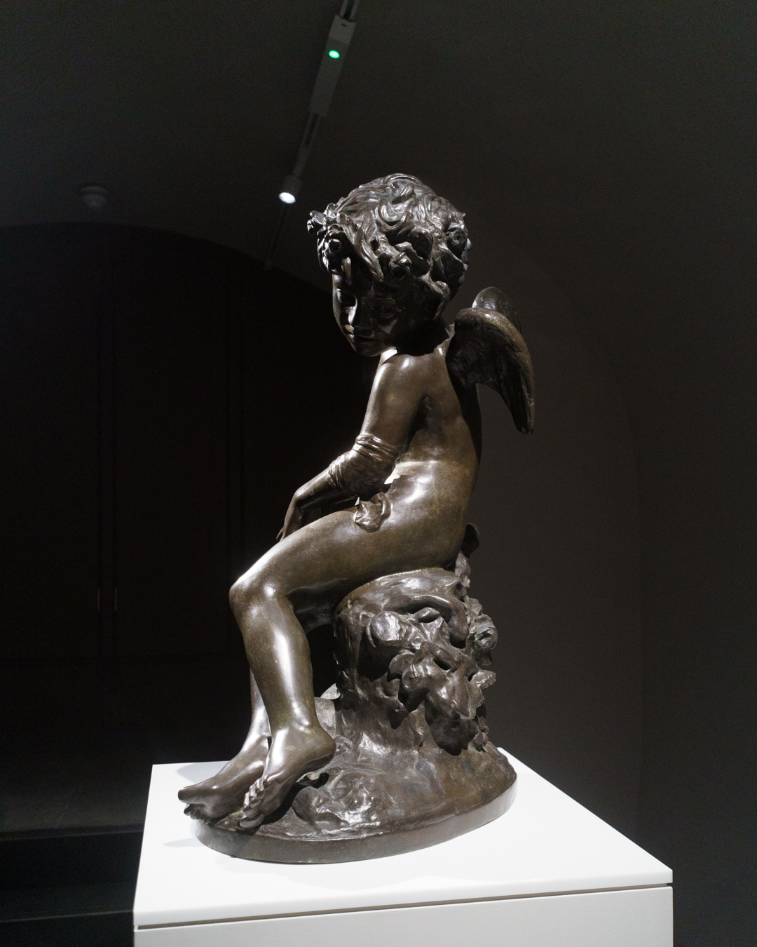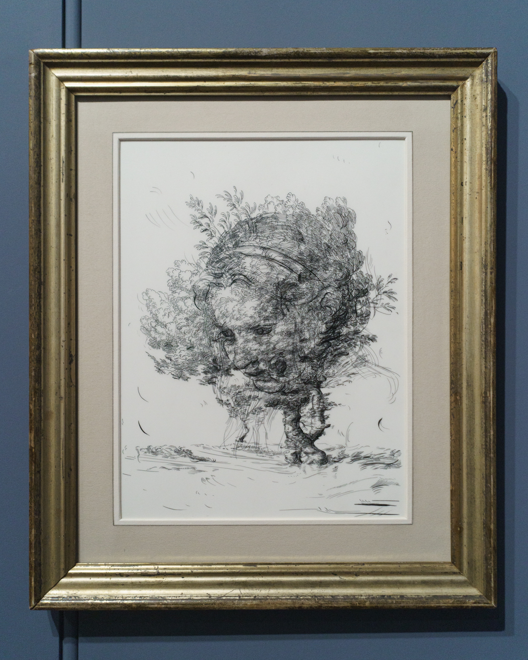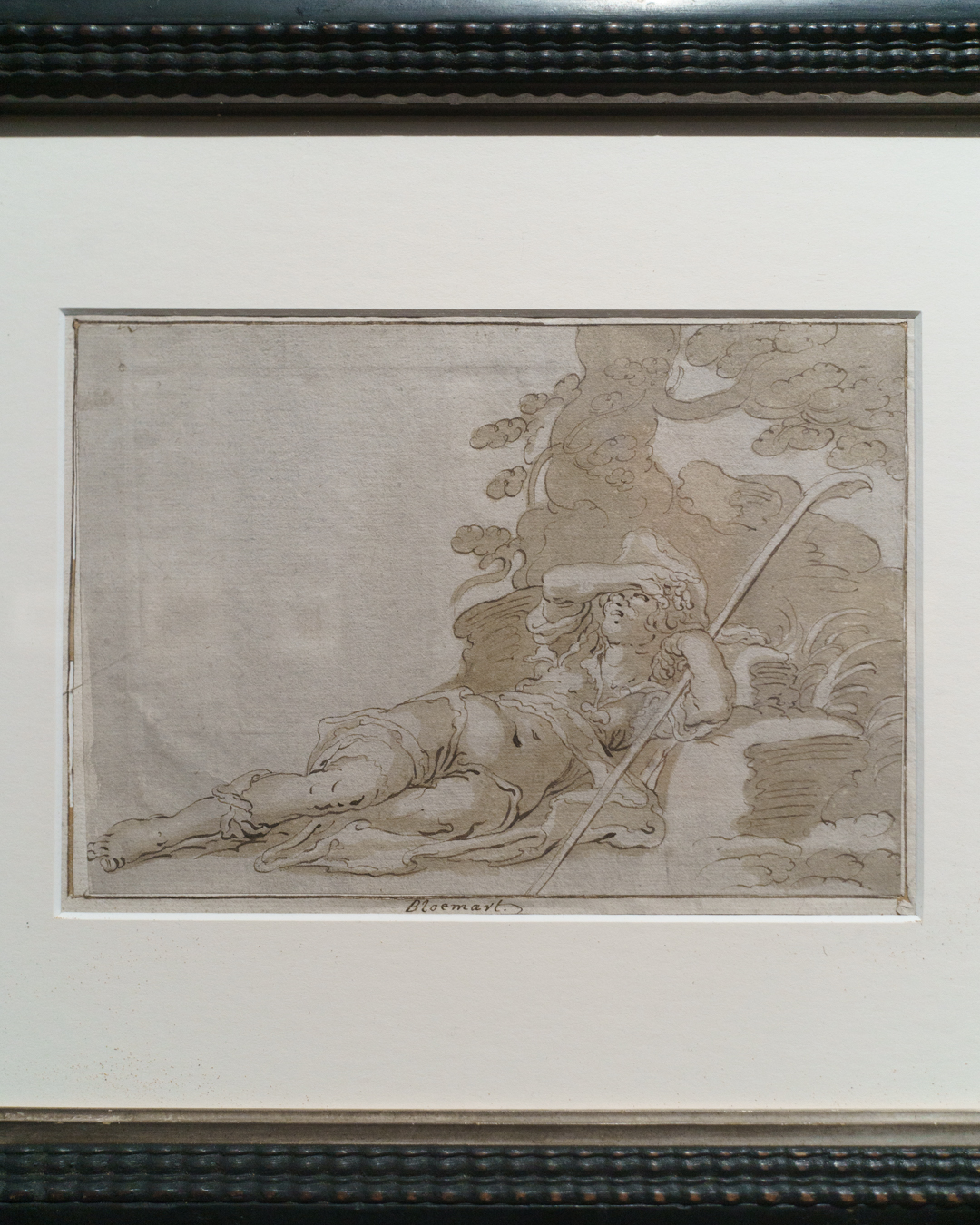 Surprisingly, the best part is in the crypt-like basement. Devoted exclusively to sculpture, one finds a kind of homage to figuration across the ages. Jean-Baptiste Carpeaux’s L’Amour Blessé (1873-75) invites us into the space, where we pass Anthony Caro’s Table Piece CLXXXII (1974) – perceived as a kind of reclining figure – and reach Brown’s recent marble sculpture Morbid Fancies (2024), which morphs from a classical figure into spirited flecks of oil paint and impasto. Yet the most playful object turns out to be another scholar’s rock, whose naturally serpentine form is eerily reminiscent of Adriaen de Vries’ Mercury and Psyche (1593), depicted in Jan Harmensz. Muller’s masterful engraving at the end of the room.