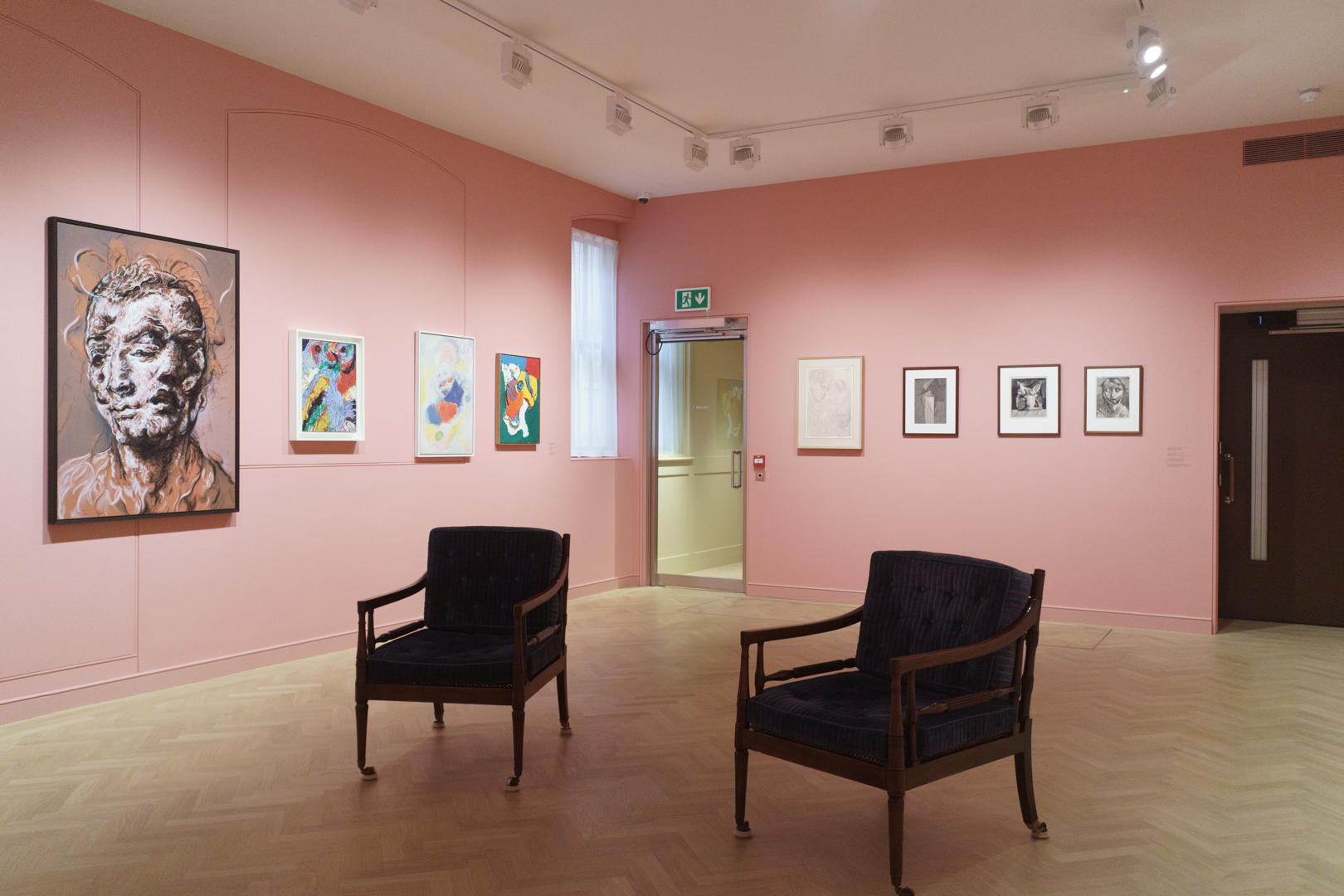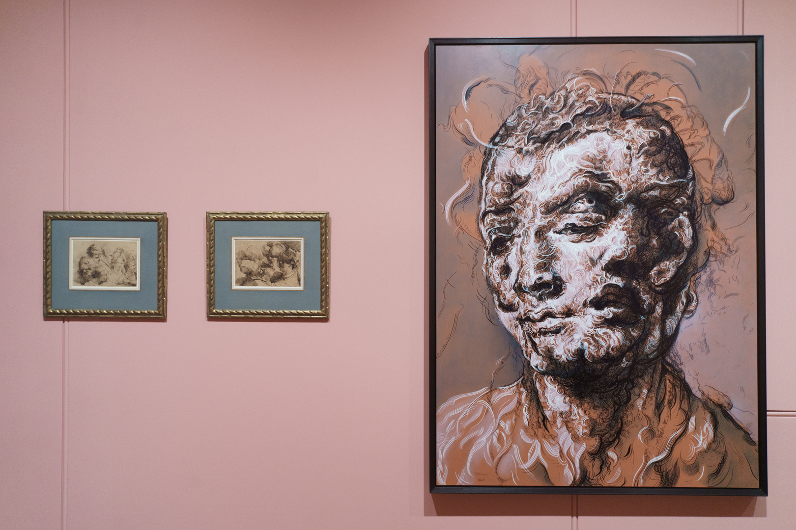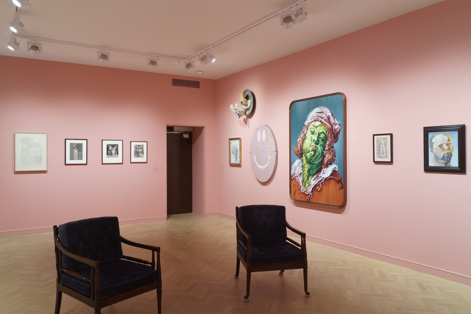 On the first floor, we find two lounge chairs in the middle of a colourful room devoted to heads and portraits, the kind of subject matter that is probably most associated with Brown’s work. Indeed, we find ourselves face-to-face with his hybrid faces, juxtaposed with sheets of head studies by Mauro Gandolfi.