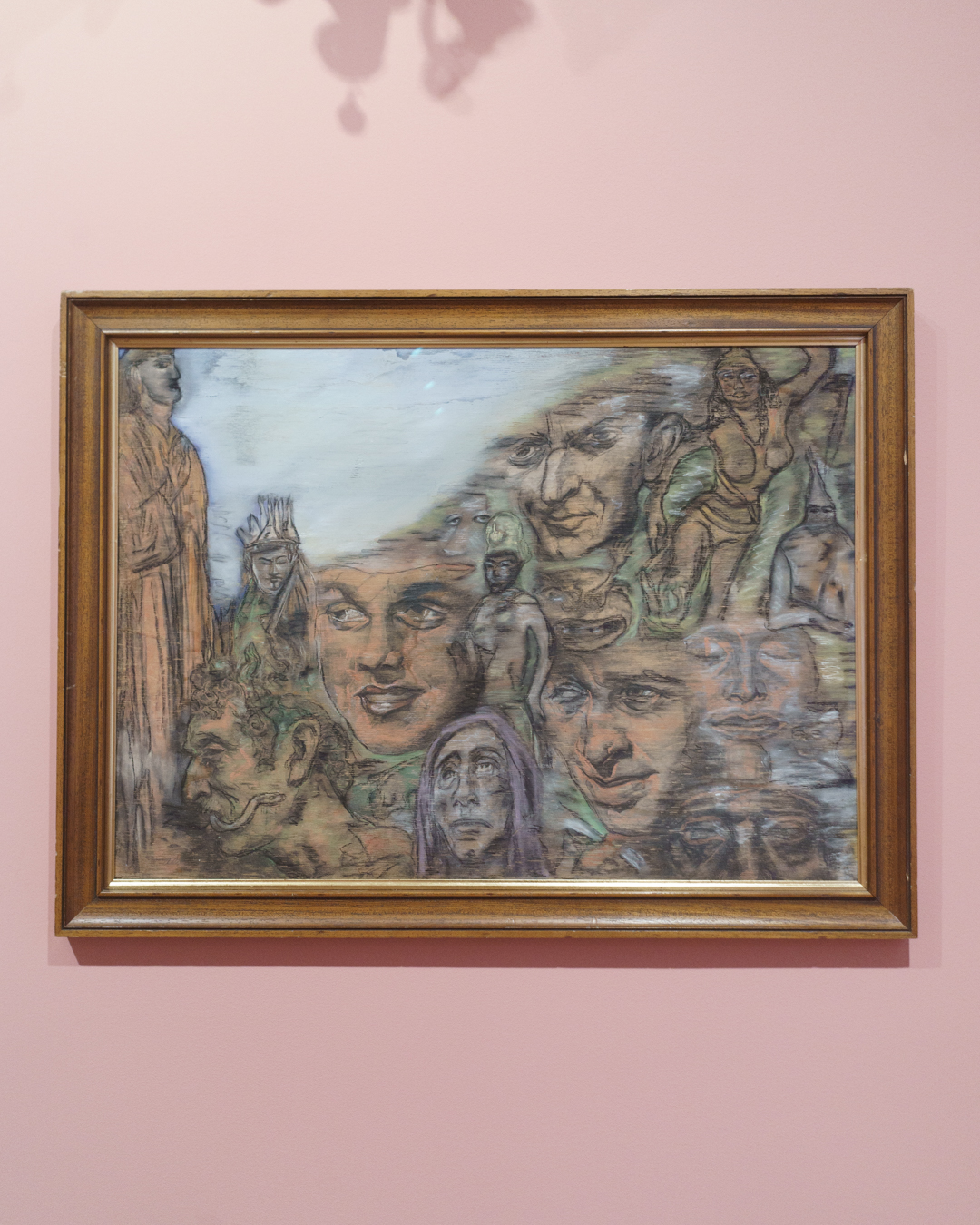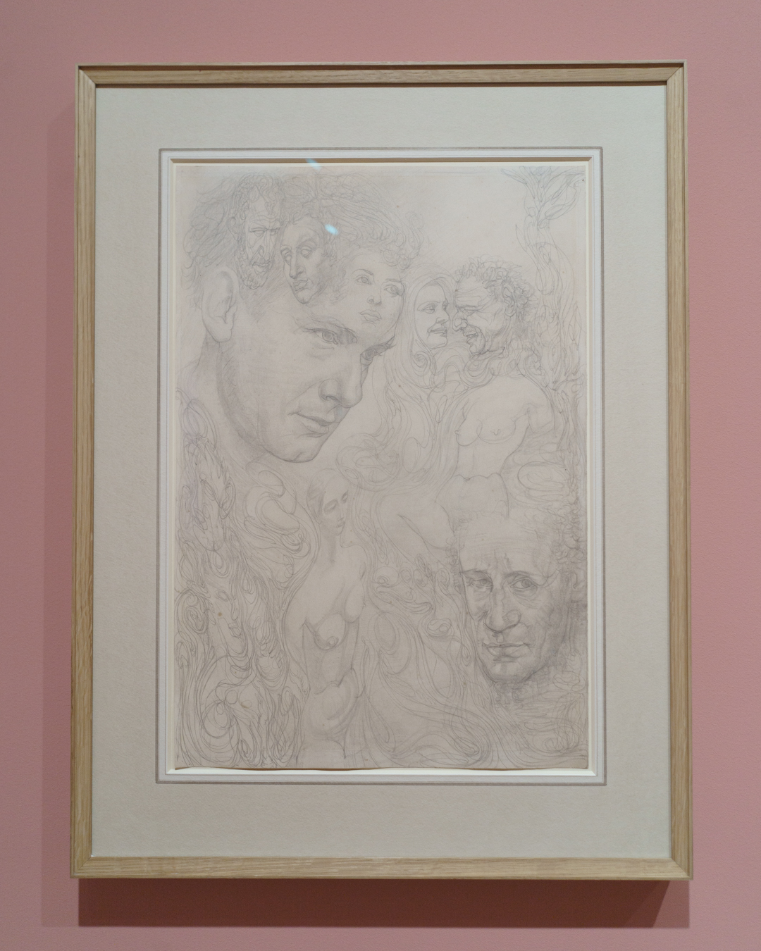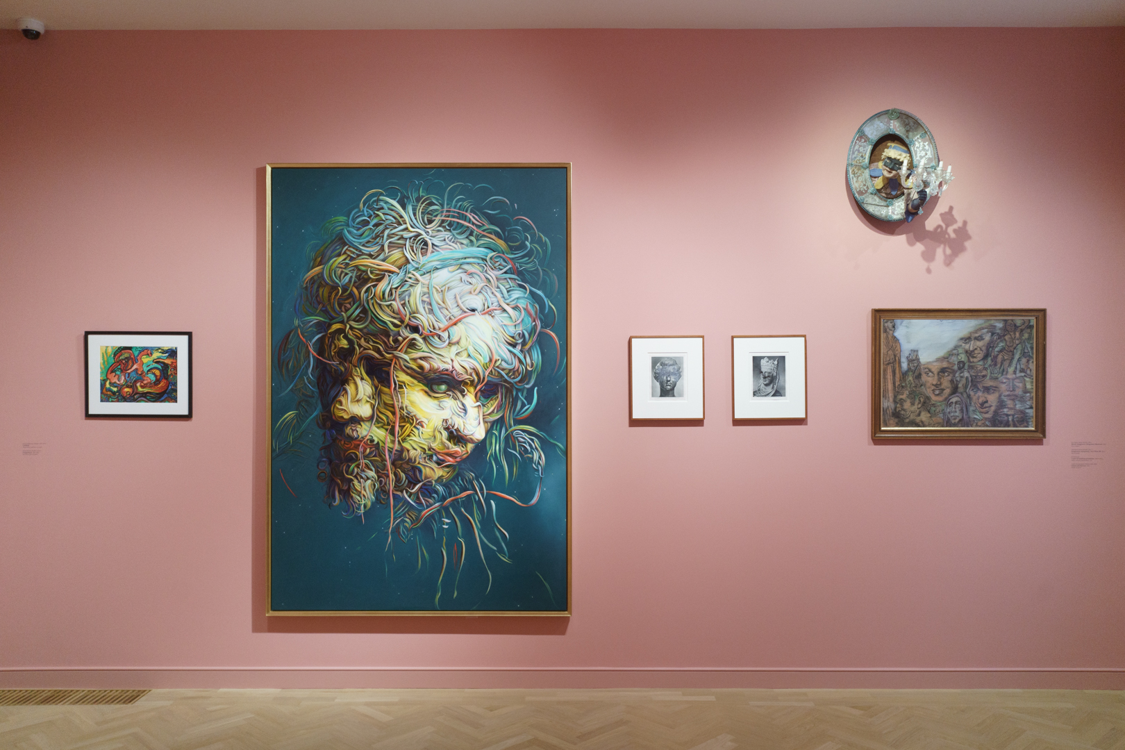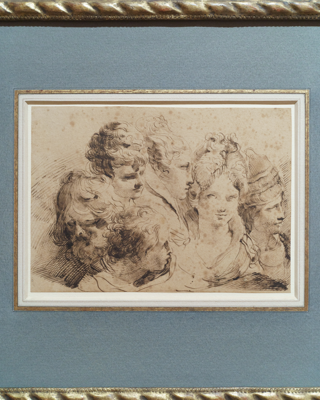 On the first floor, we find two lounge chairs in the middle of a colourful room devoted to heads and portraits, the kind of subject matter that is probably most associated with Brown’s work. Indeed, we find ourselves face-to-face with his hybrid faces, juxtaposed with sheets of head studies by Mauro Gandolfi.