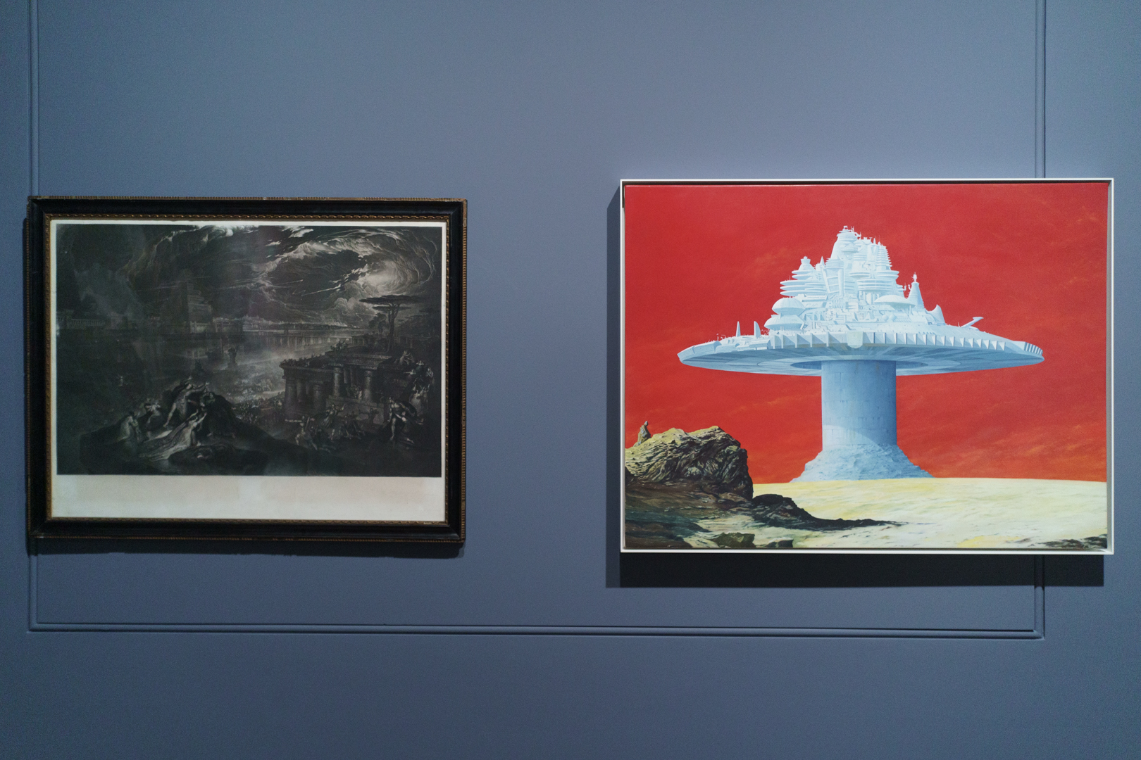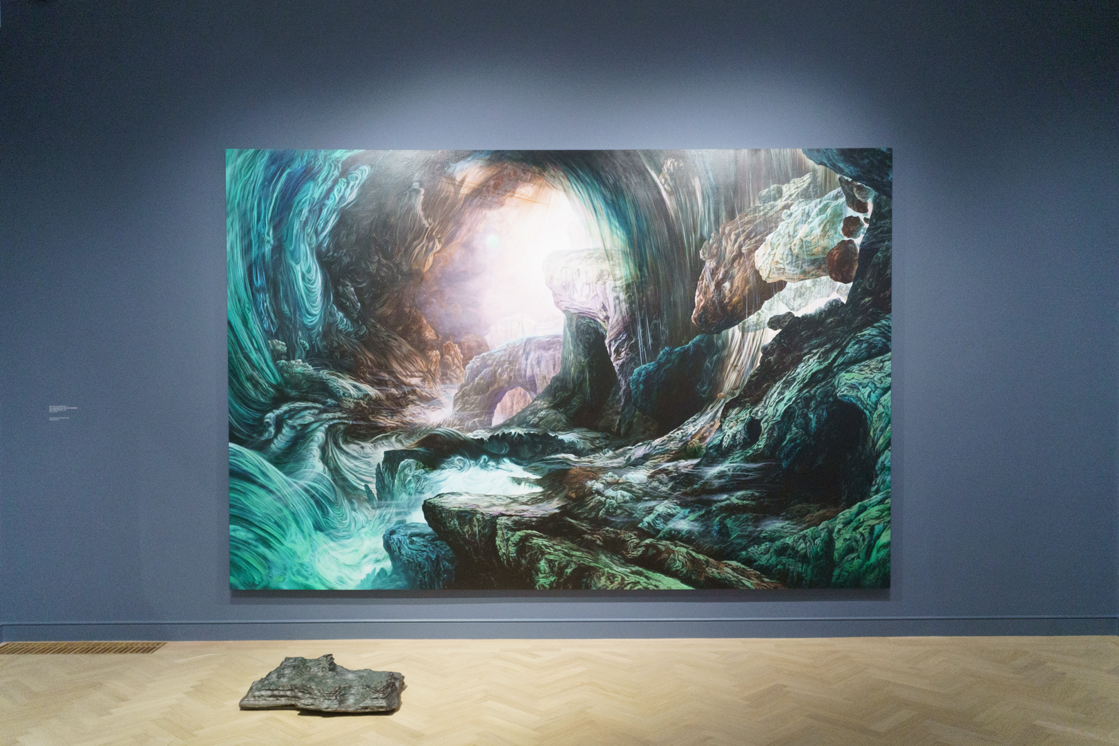 Meanwhile, the second floor captures Brown’s early interests in landscape and the sublime. The dominant painting in the room is the Zabludowicz Collection’s The Aesthetic Poor (for Tim Buckley) (2002), inspired by John Martin’s mezzotint The Fall of Babylon (1831) shown next to it. In one corner, the cosmological undertones of the room features a Qing dynasty scholar’s rock (gongshi) on the floor appearing like the craterous surface of the Moon, while Monica Poole’s Piddock Architecture (1975) looks just like a meteorite.
