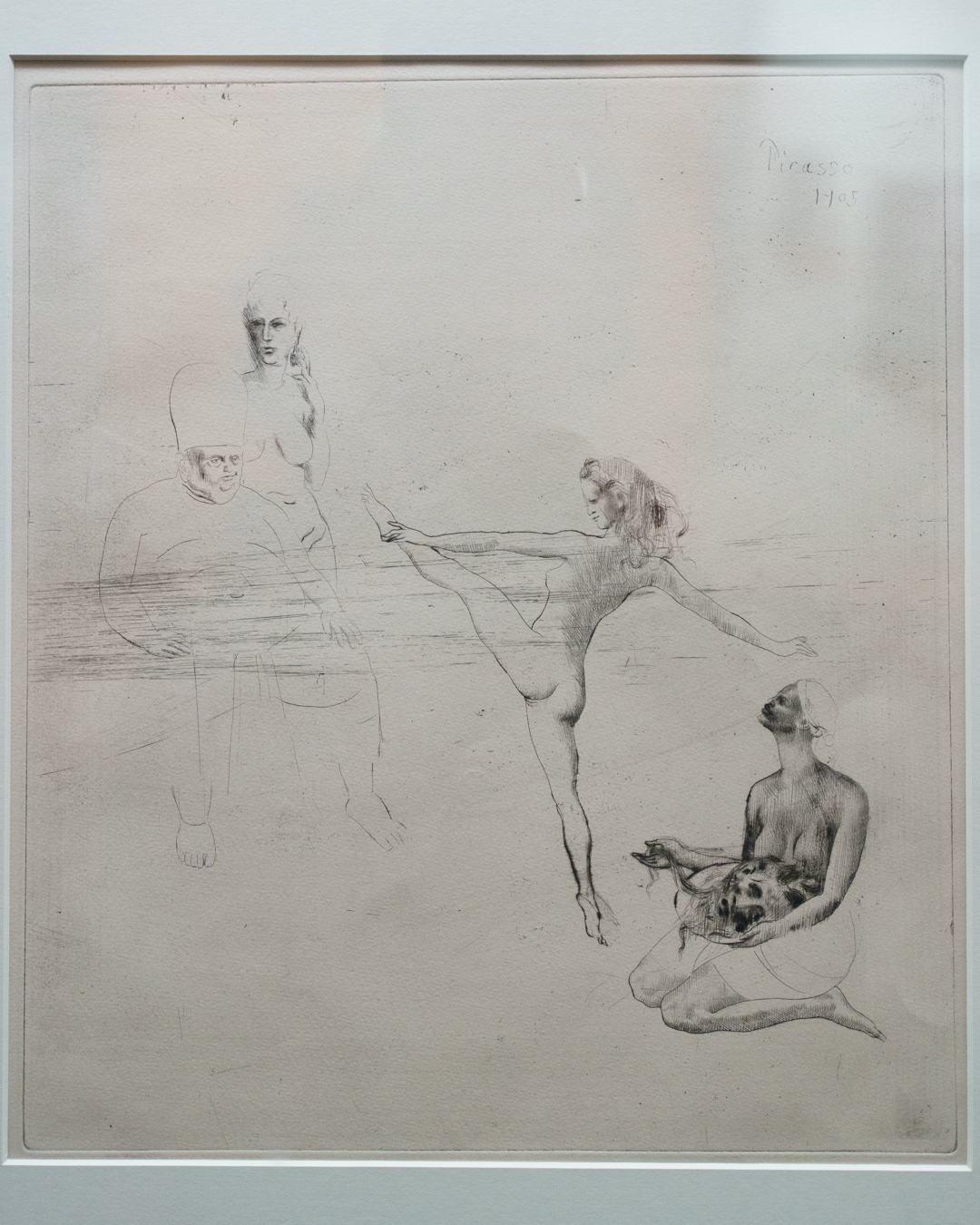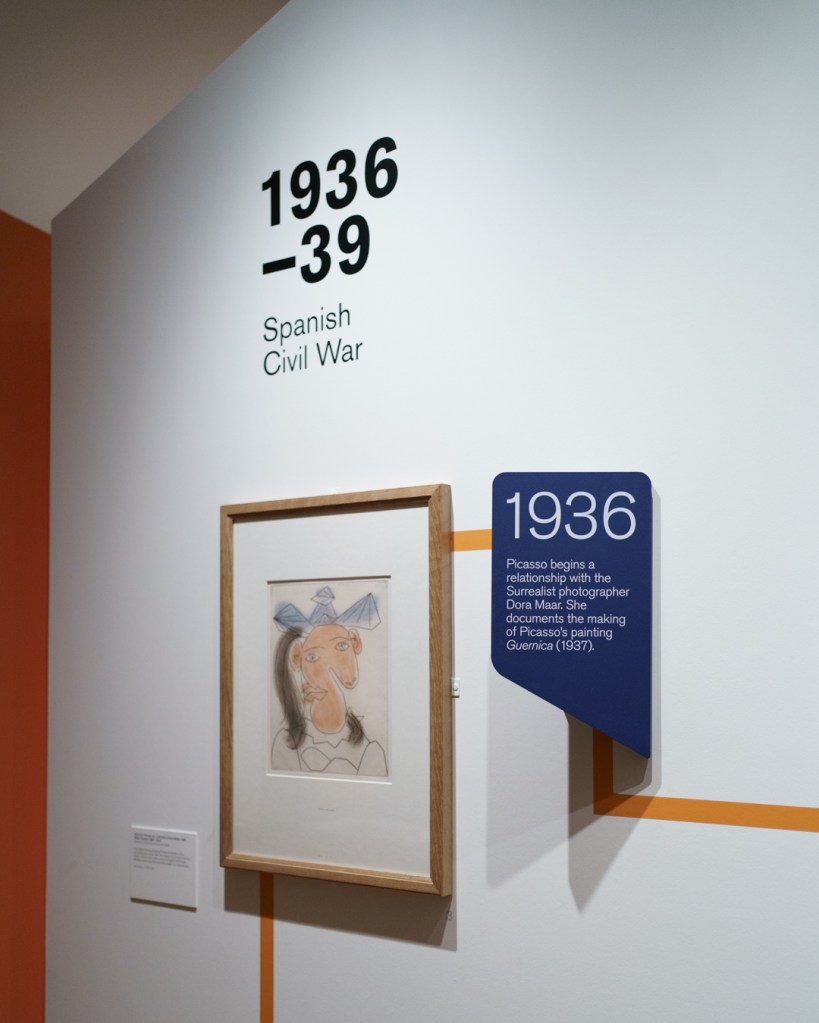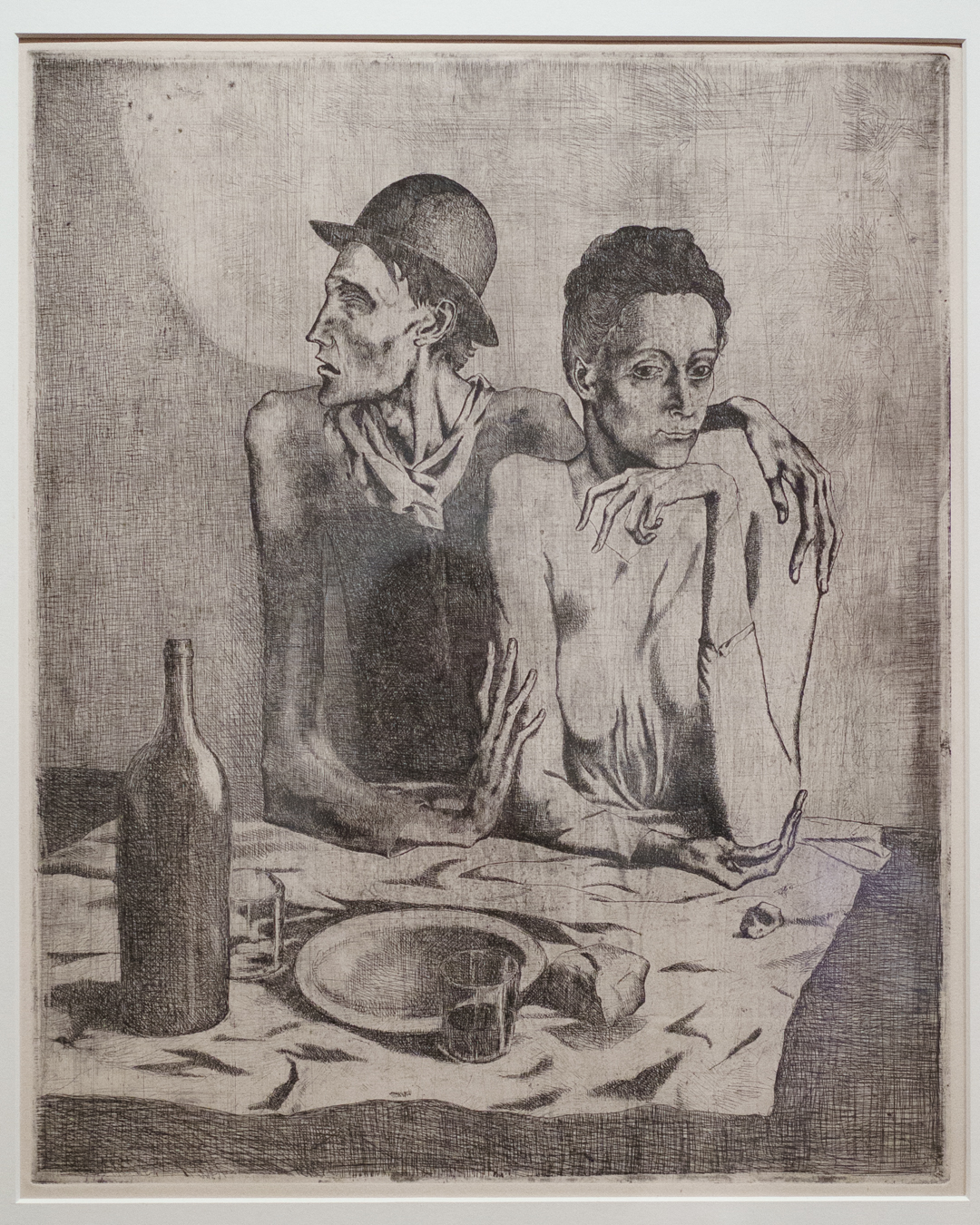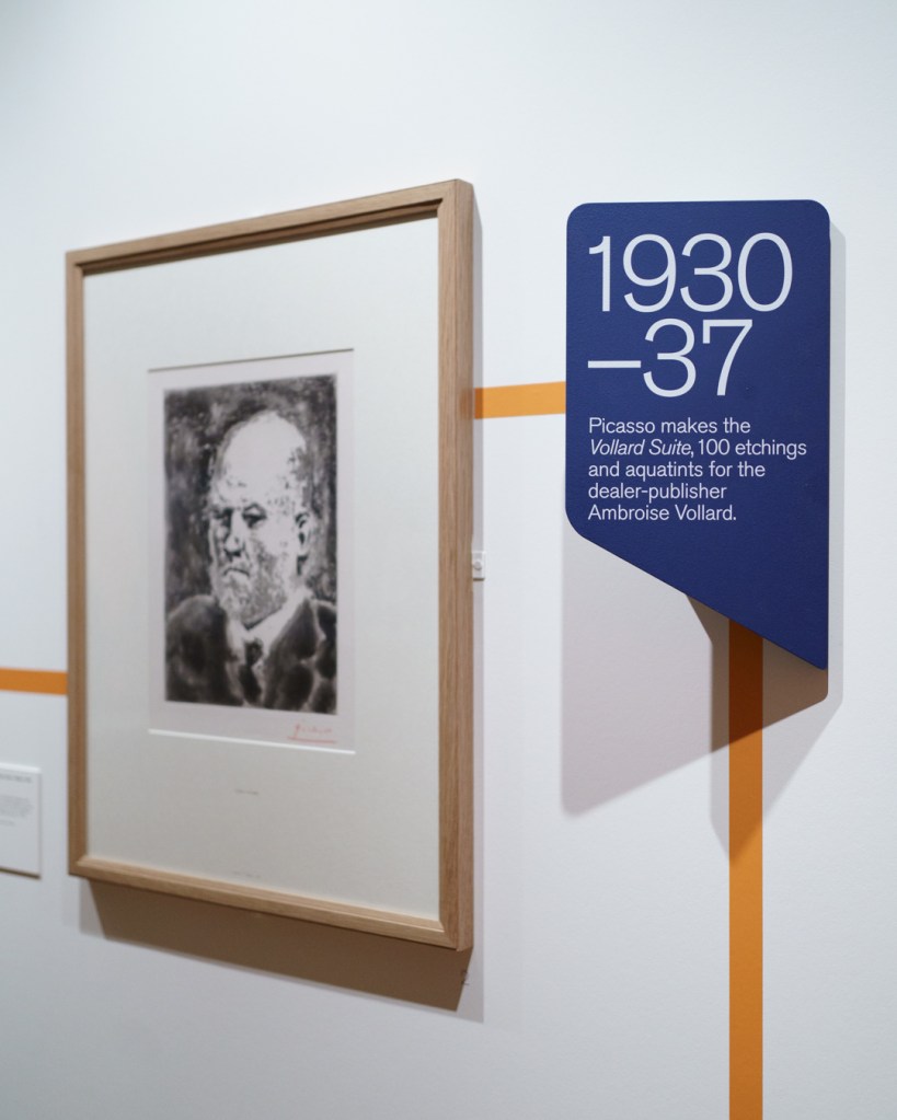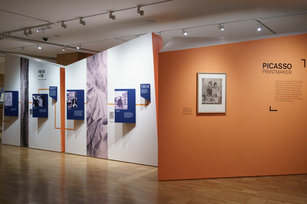 First and foremost, the beautiful exhibition design is worth highlighting, incorporating a set of partitions bisecting the room that double up as an informative timeline. This is where we see Picasso’s first print made in Paris, The Frugal Meal (1904), created using a recycled zinc plate and scraper.