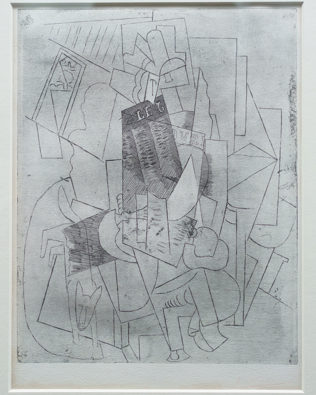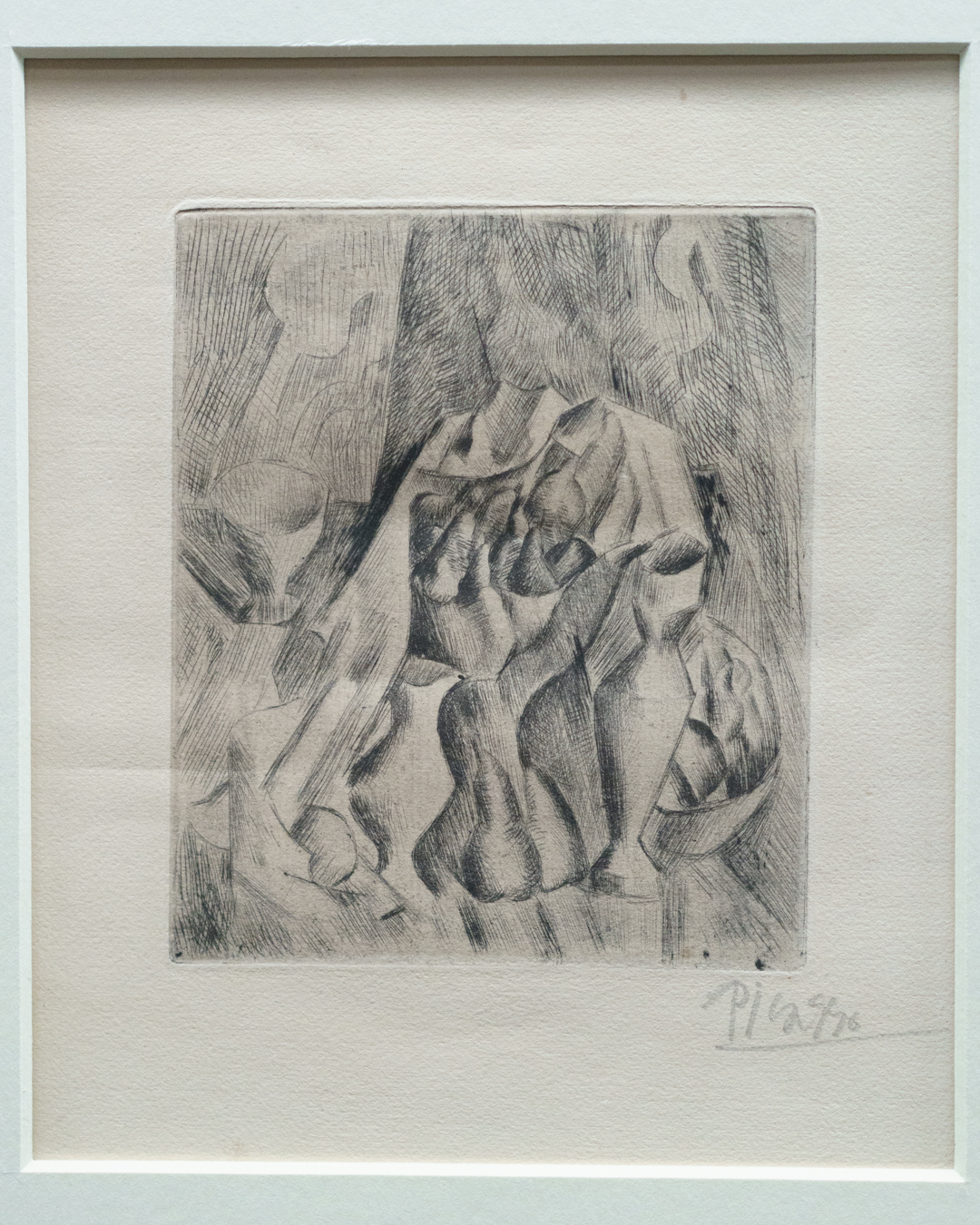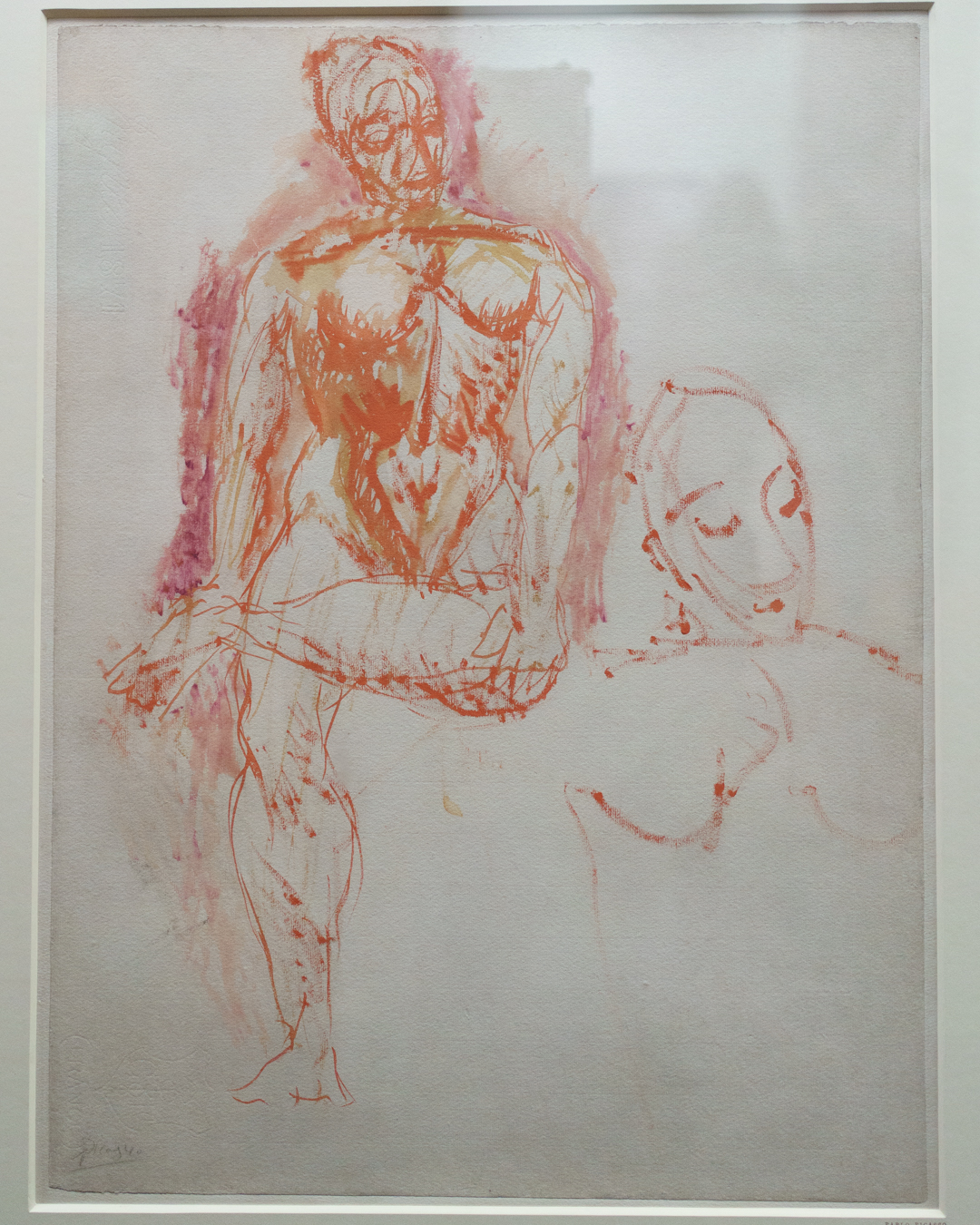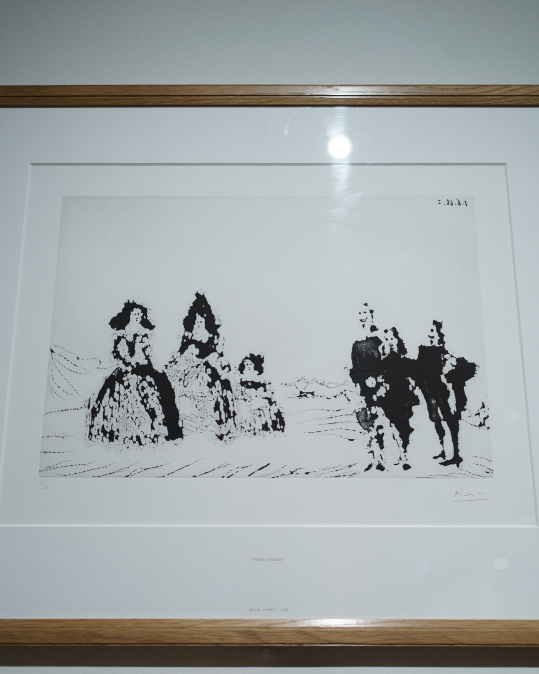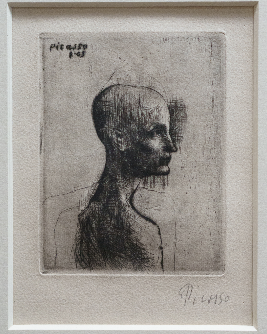 First and foremost, the beautiful exhibition design is worth highlighting, incorporating a set of partitions bisecting the room that double up as an informative timeline. This is where we see Picasso’s first print made in Paris, The Frugal Meal (1904), created using a recycled zinc plate and scraper.