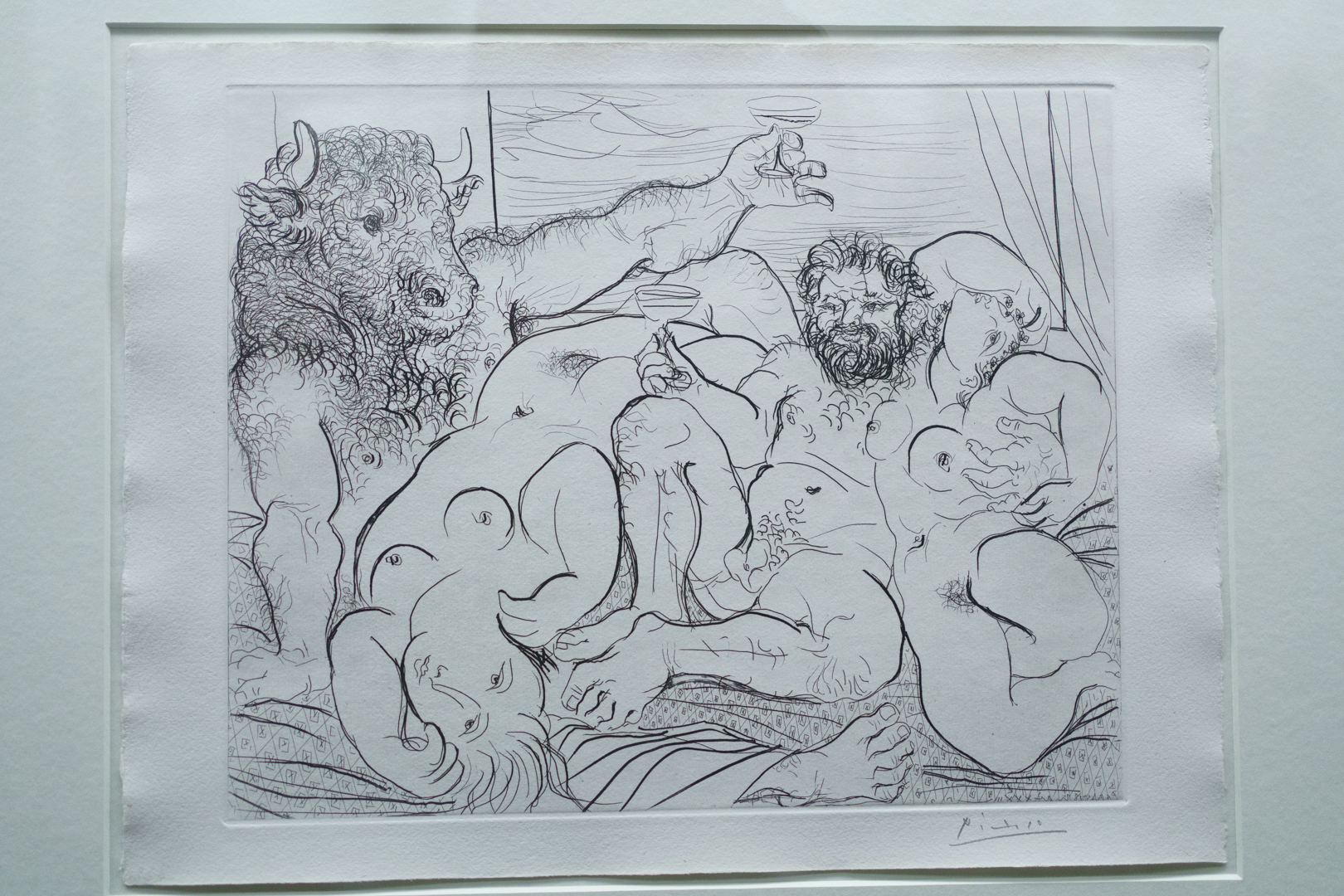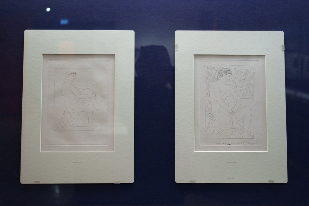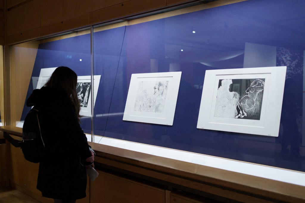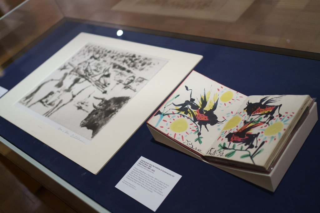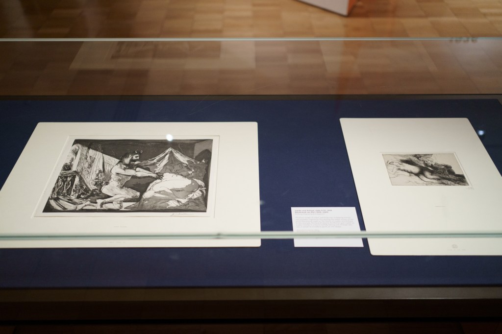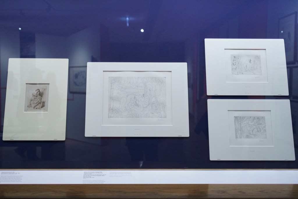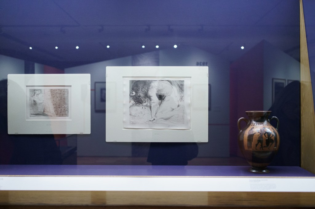The early drypoints and etchings are fascinating, allowing us to see Picasso’s response and assimilation of the styles of Georges Braque, Henri Matisse, and Rembrandt. At times, the prints respond to objects in the museum, such as an ancient Greek bronze mirror decorated with goddesses in a pure outline style. The Minotaur prints are also well contextualised with one of Francisco de Goya’s La Tauromaquia prints (1815-16) and an amphora depicting the story of Theseus and the Minotaur.