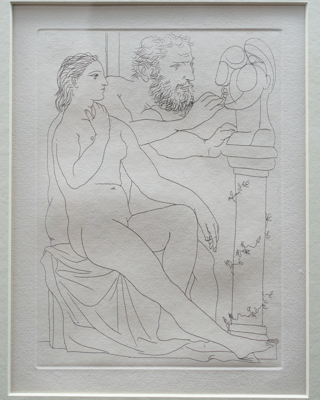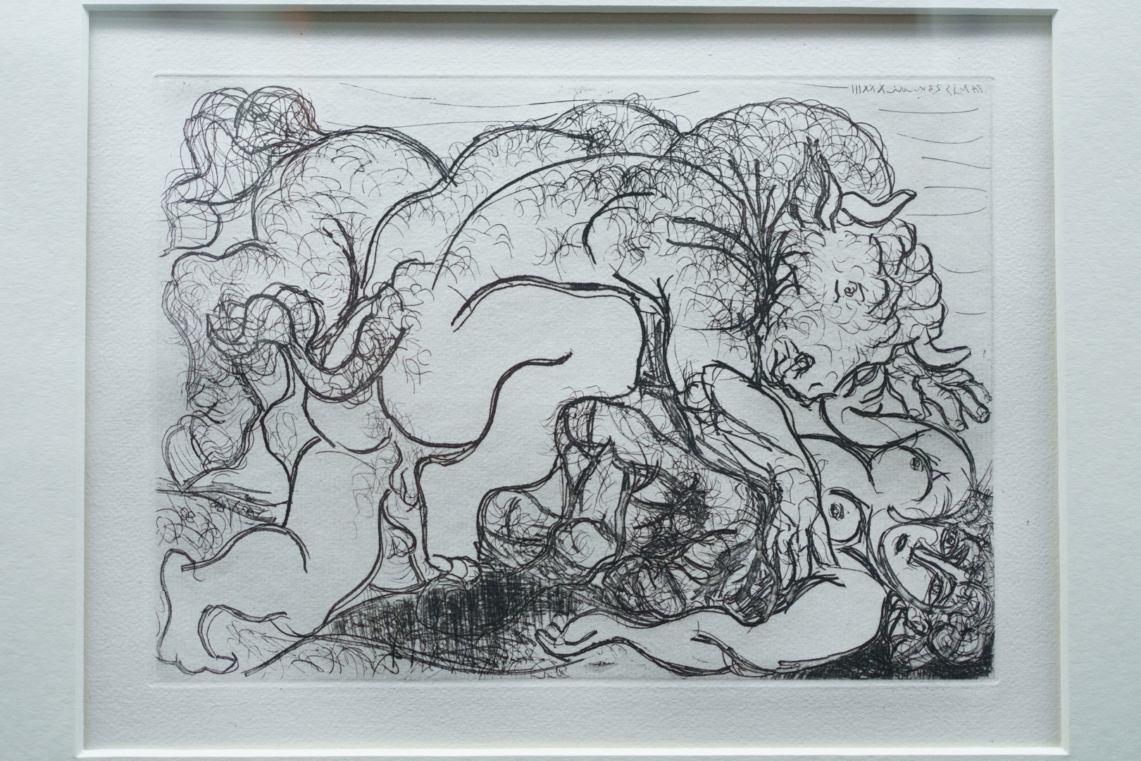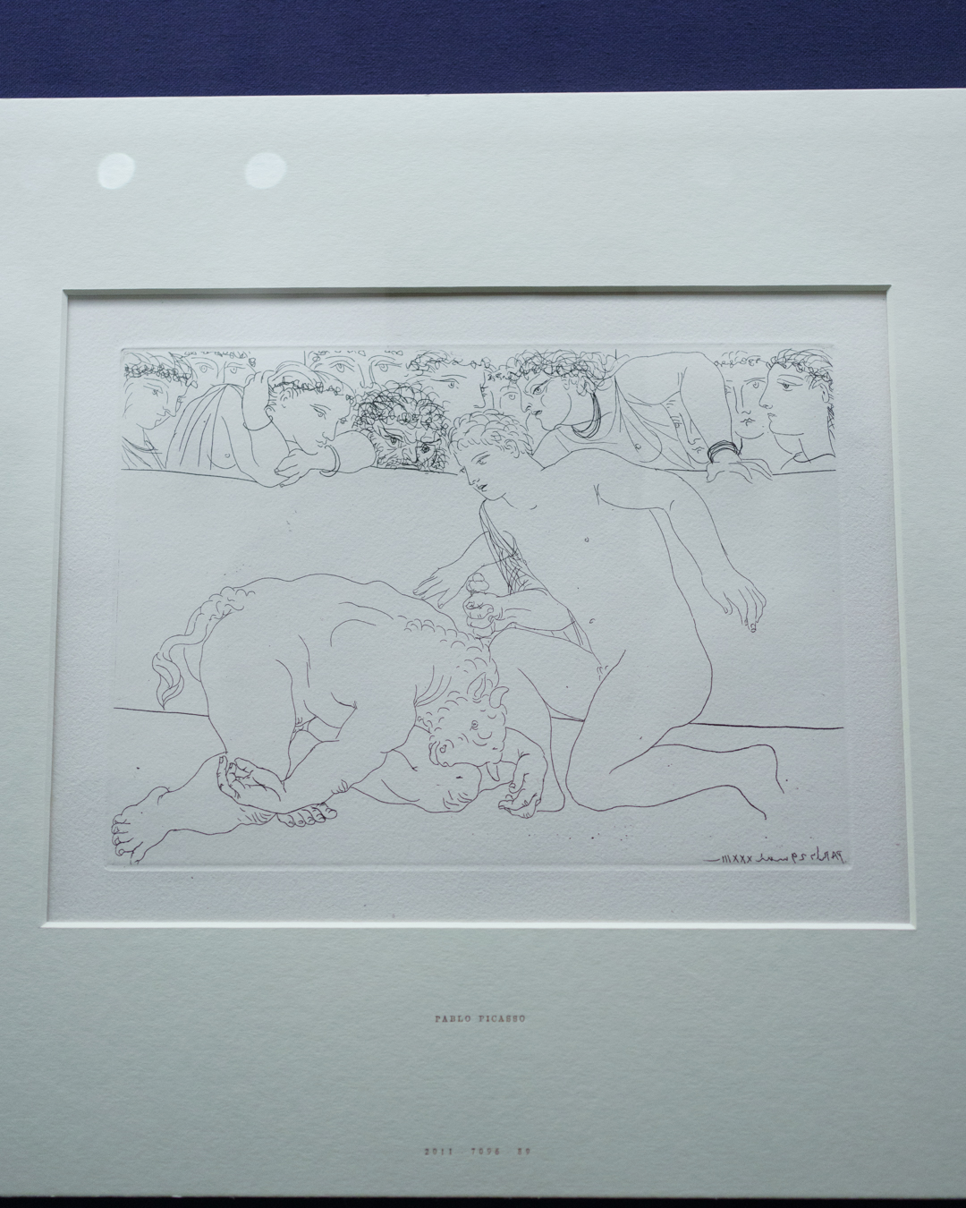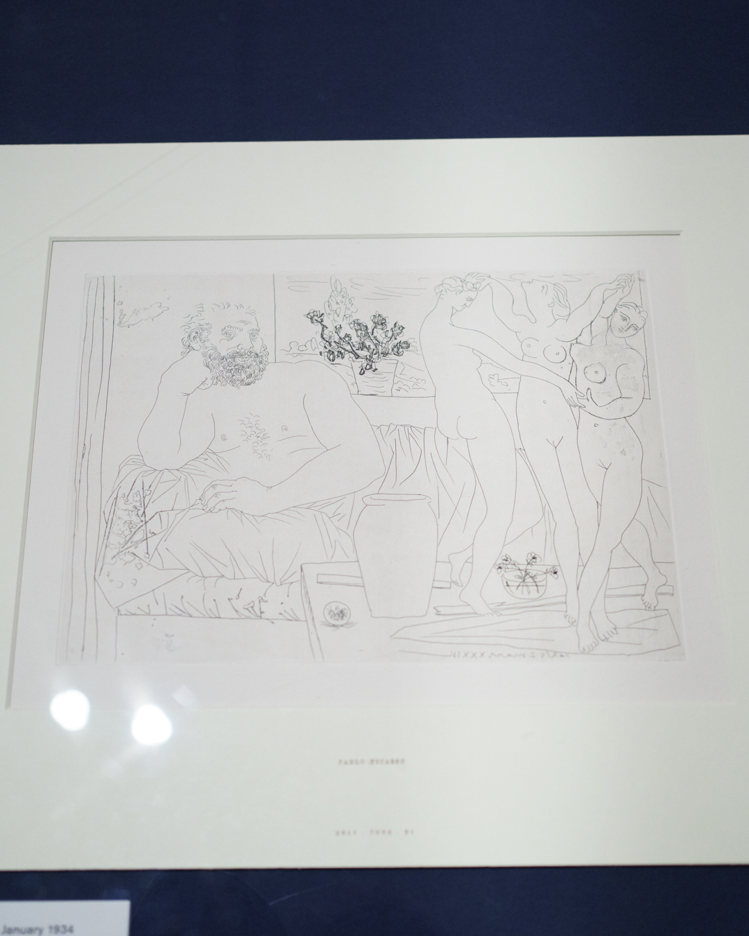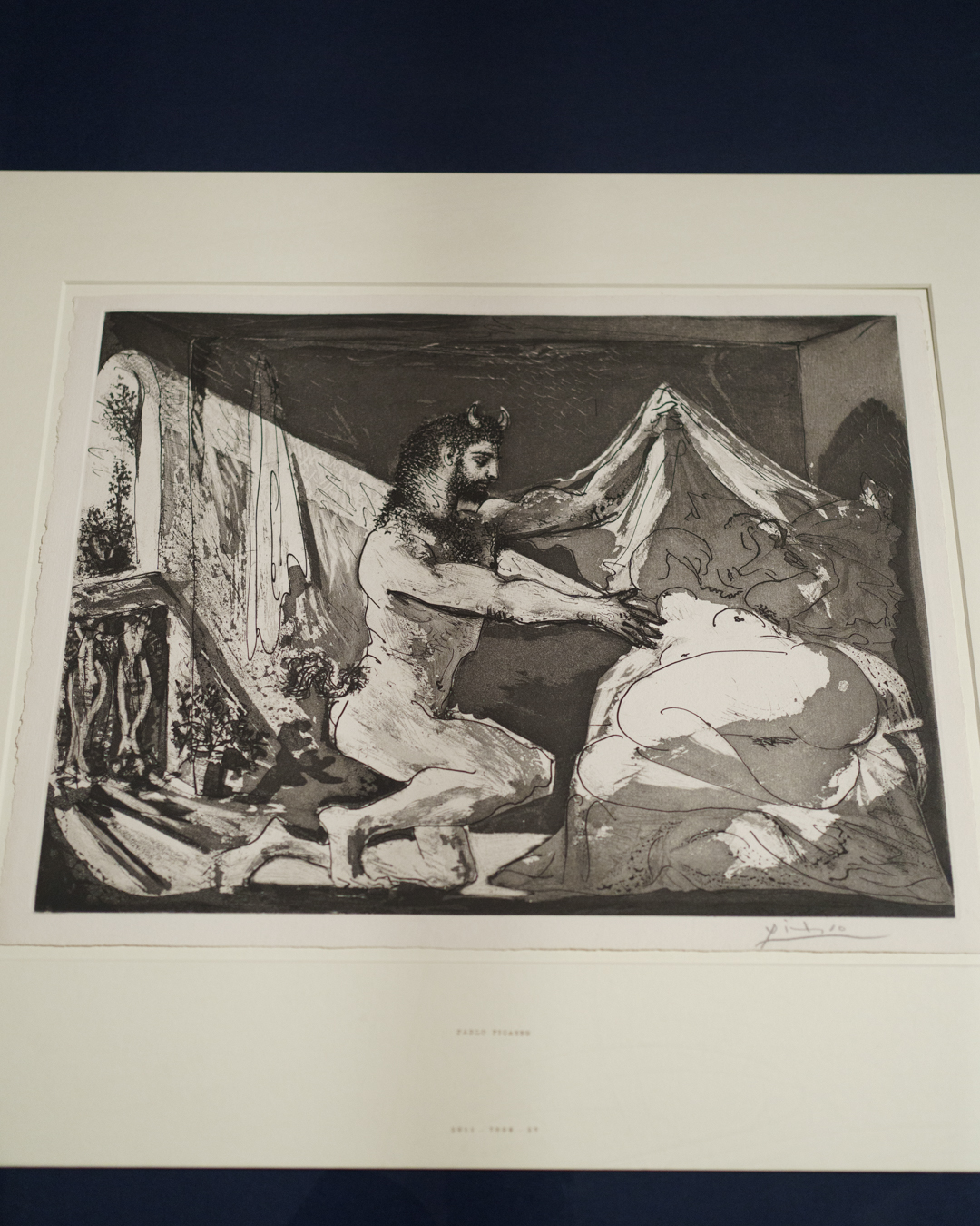 The early drypoints and etchings are fascinating, allowing us to see Picasso’s response and assimilation of the styles of Georges Braque, Henri Matisse, and Rembrandt. At times, the prints respond to objects in the museum, such as an ancient Greek bronze mirror decorated with goddesses in a pure outline style. The Minotaur prints are also well contextualised with one of Francisco de Goya’s La Tauromaquia prints (1815-16) and an amphora depicting the story of Theseus and the Minotaur.