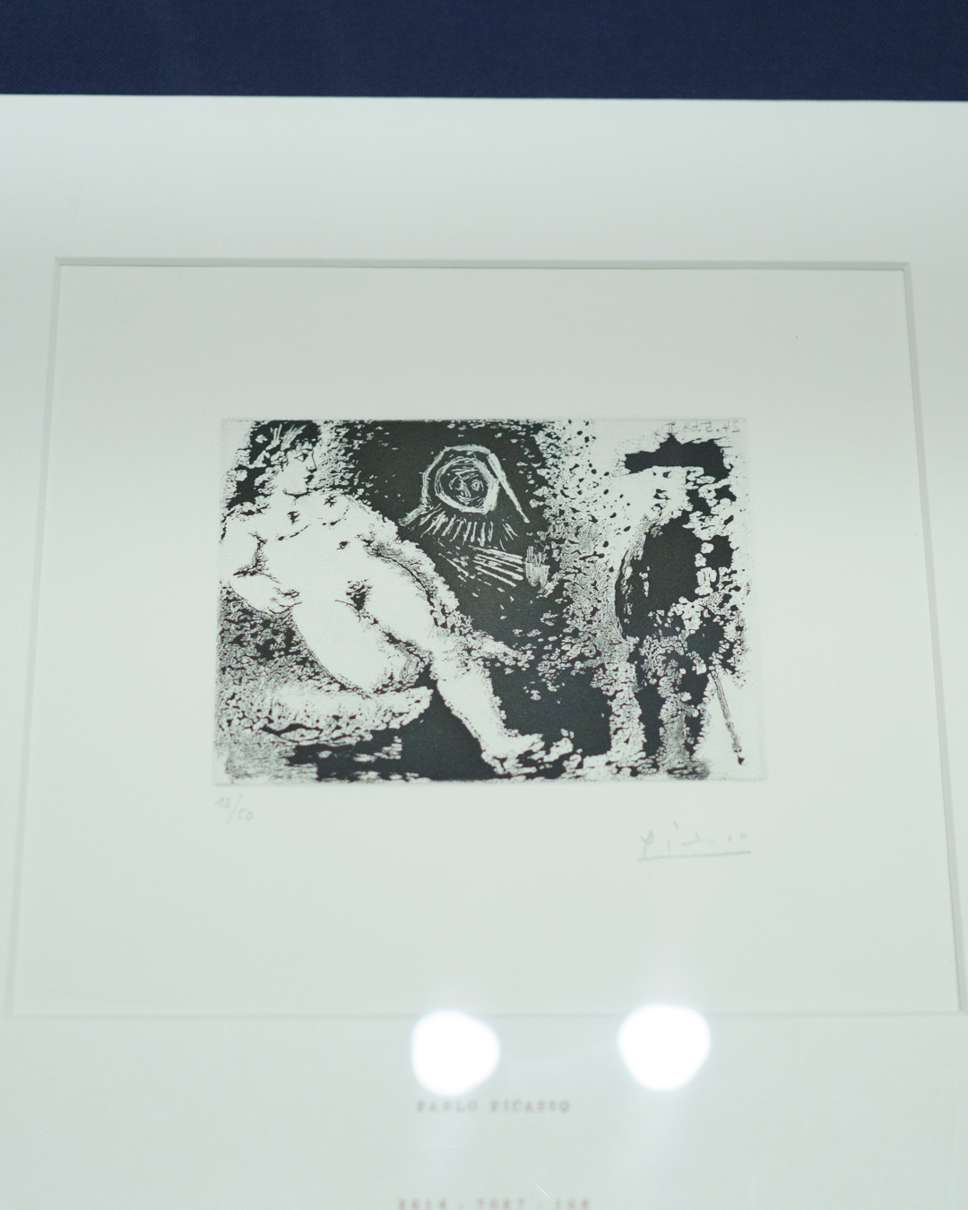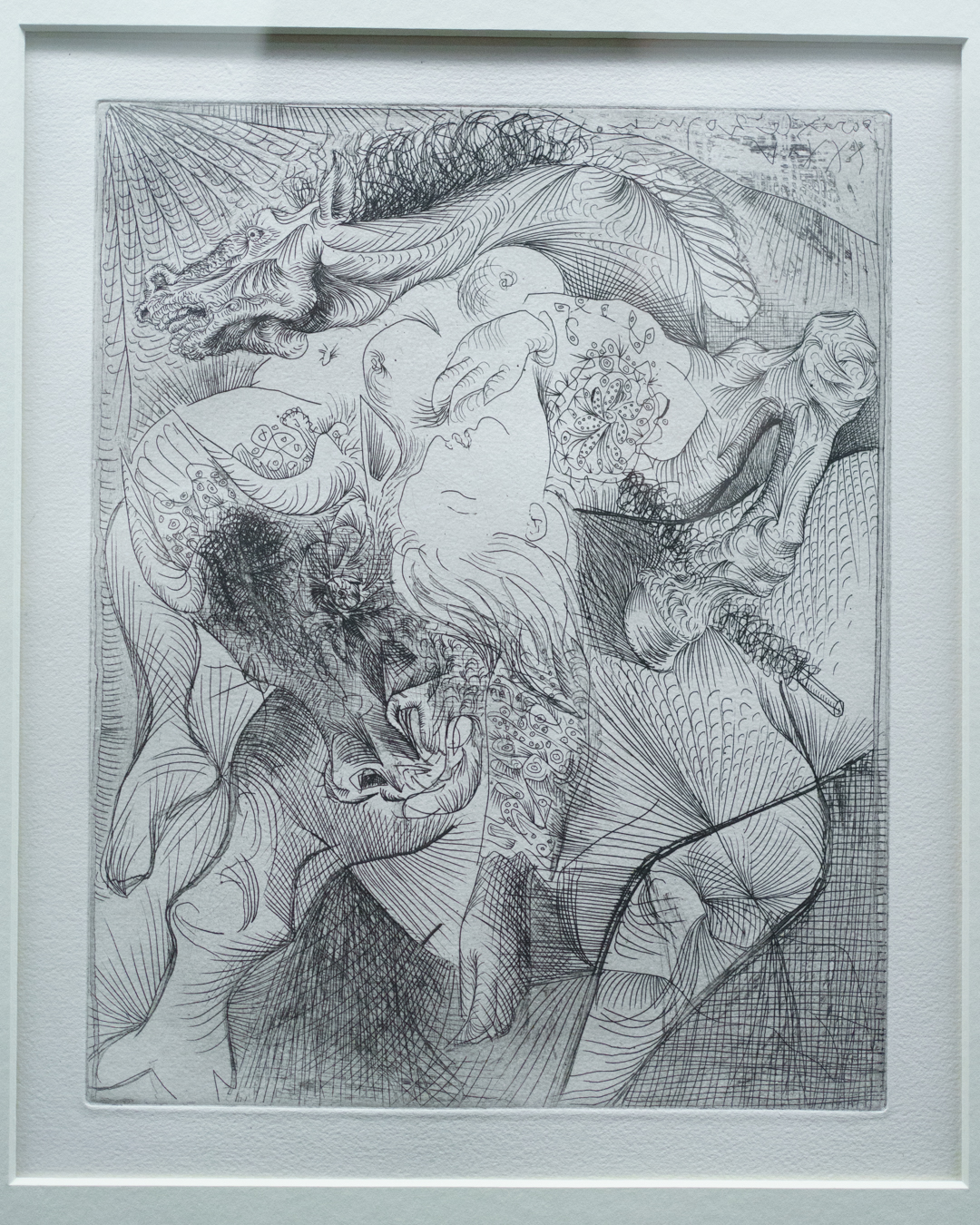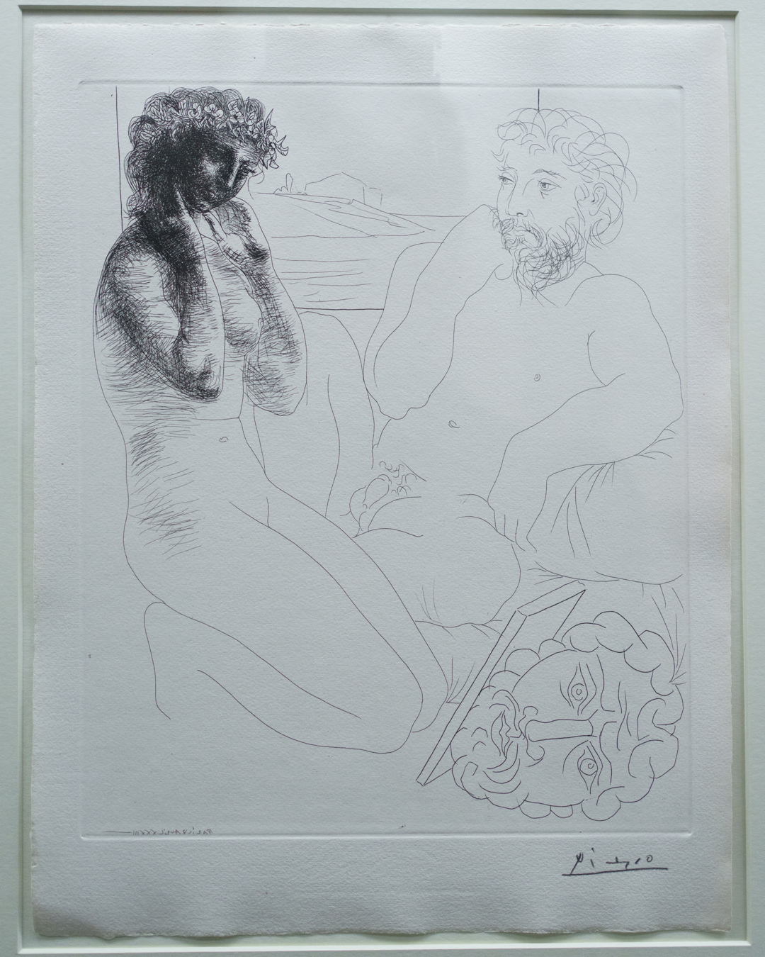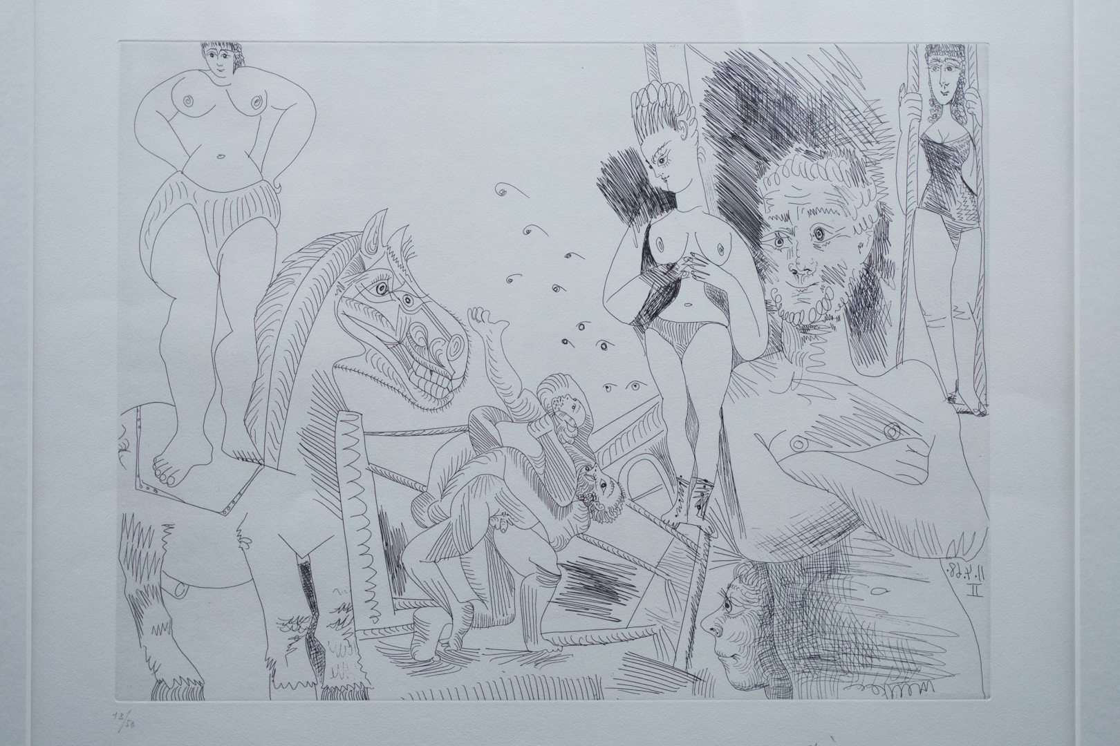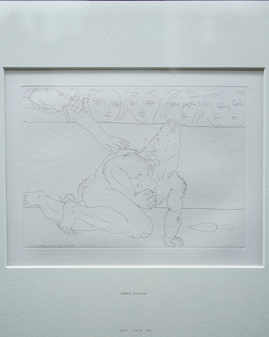 The early drypoints and etchings are fascinating, allowing us to see Picasso’s response and assimilation of the styles of Georges Braque, Henri Matisse, and Rembrandt. At times, the prints respond to objects in the museum, such as an ancient Greek bronze mirror decorated with goddesses in a pure outline style. The Minotaur prints are also well contextualised with one of Francisco de Goya’s La Tauromaquia prints (1815-16) and an amphora depicting the story of Theseus and the Minotaur.