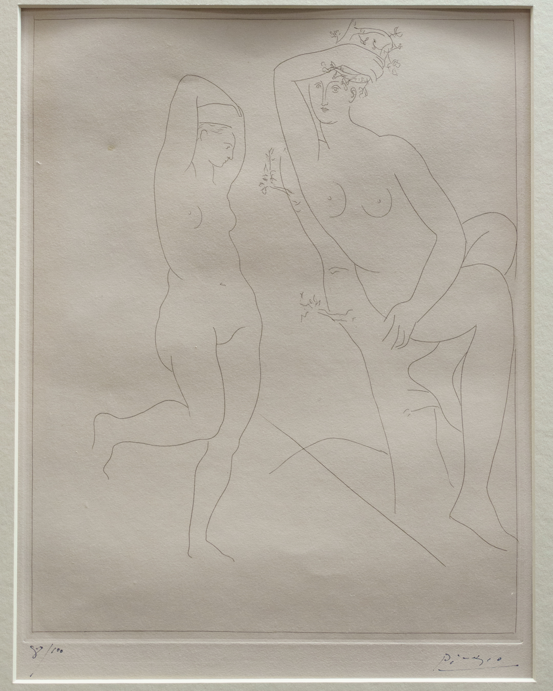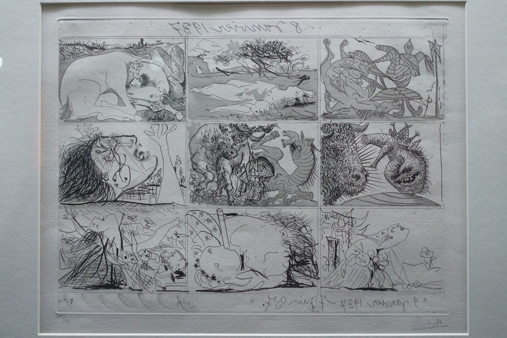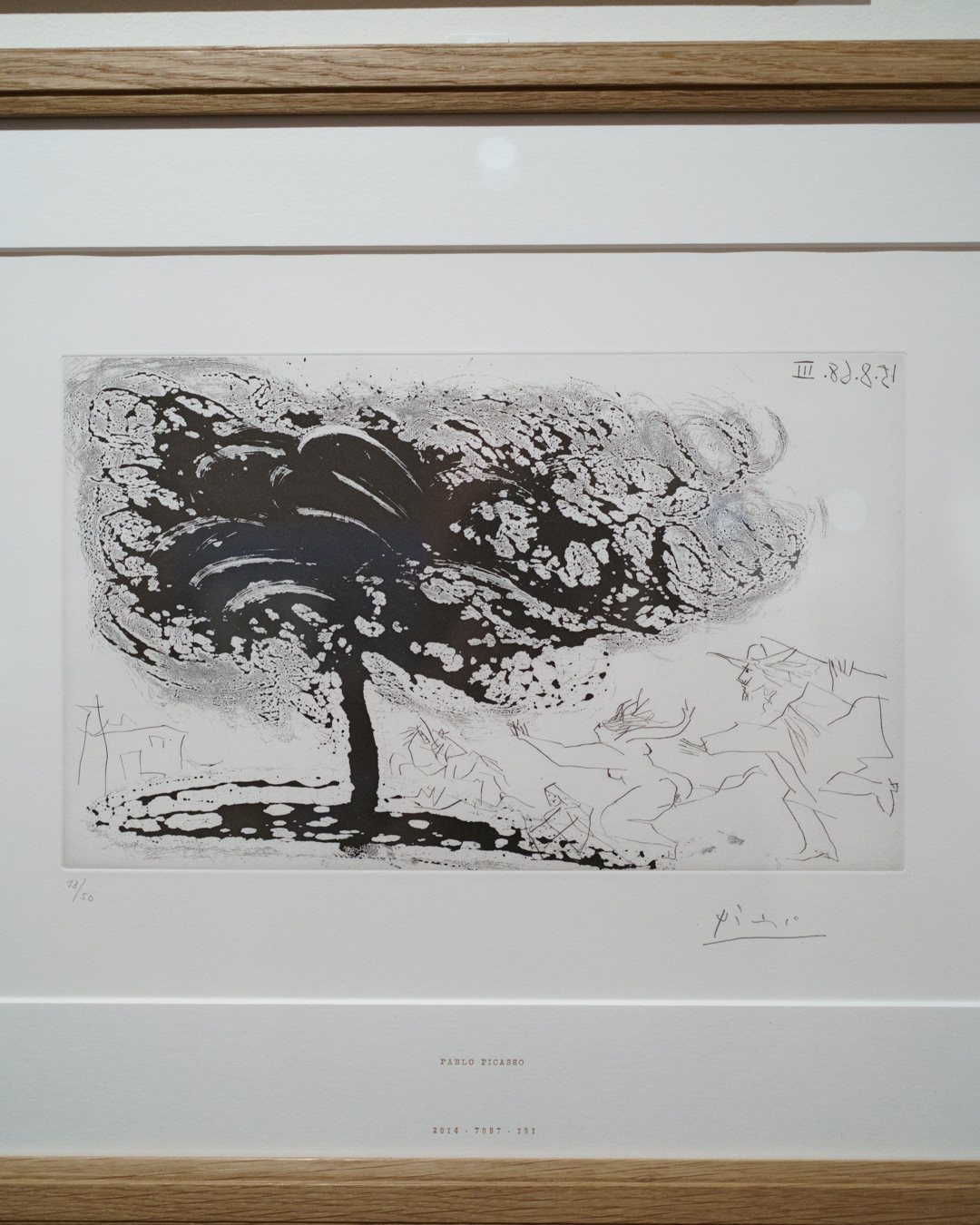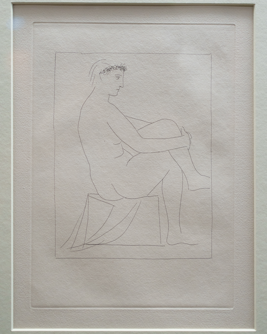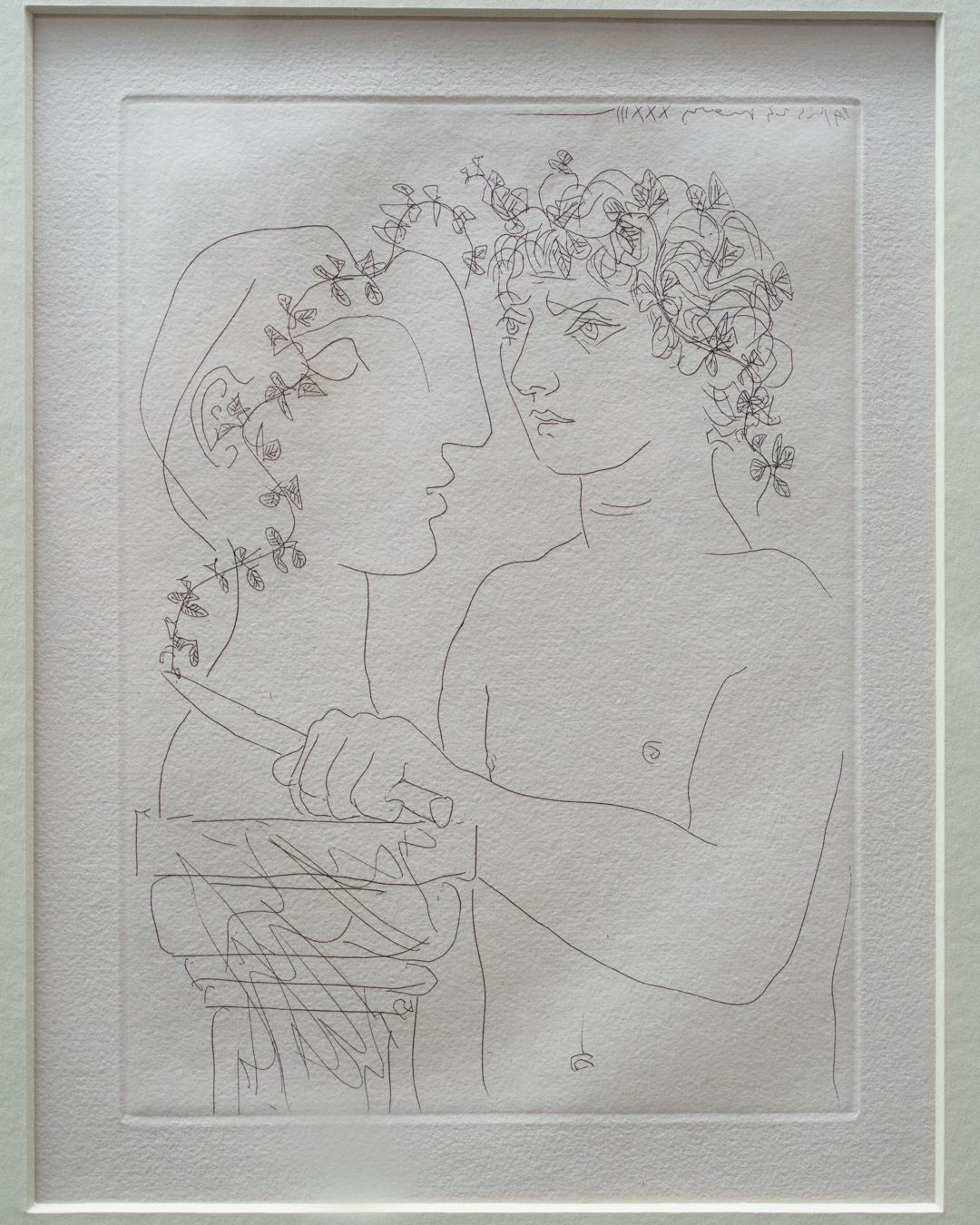The early drypoints and etchings are fascinating, allowing us to see Picasso’s response and assimilation of the styles of Georges Braque, Henri Matisse, and Rembrandt. At times, the prints respond to objects in the museum, such as an ancient Greek bronze mirror decorated with goddesses in a pure outline style. The Minotaur prints are also well contextualised with one of Francisco de Goya’s La Tauromaquia prints (1815-16) and an amphora depicting the story of Theseus and the Minotaur.