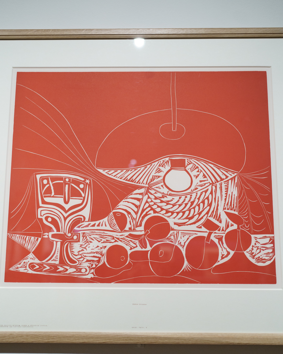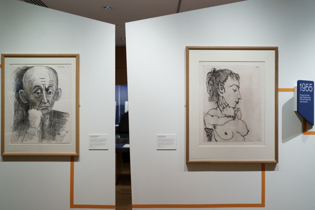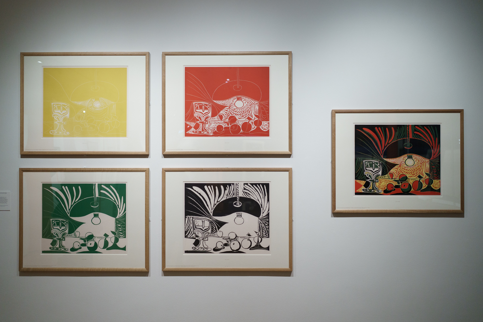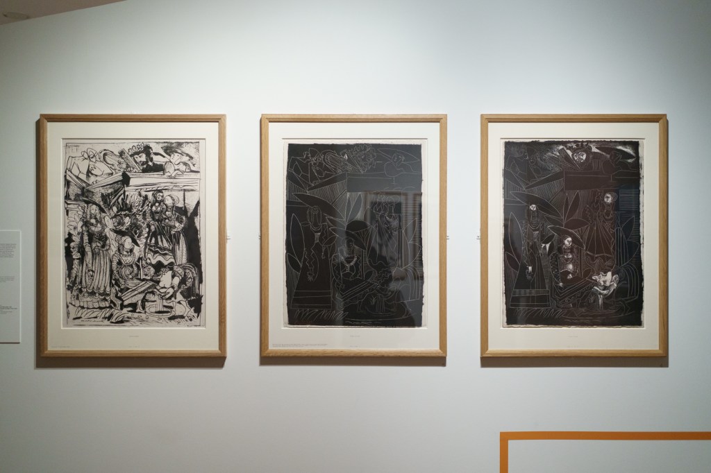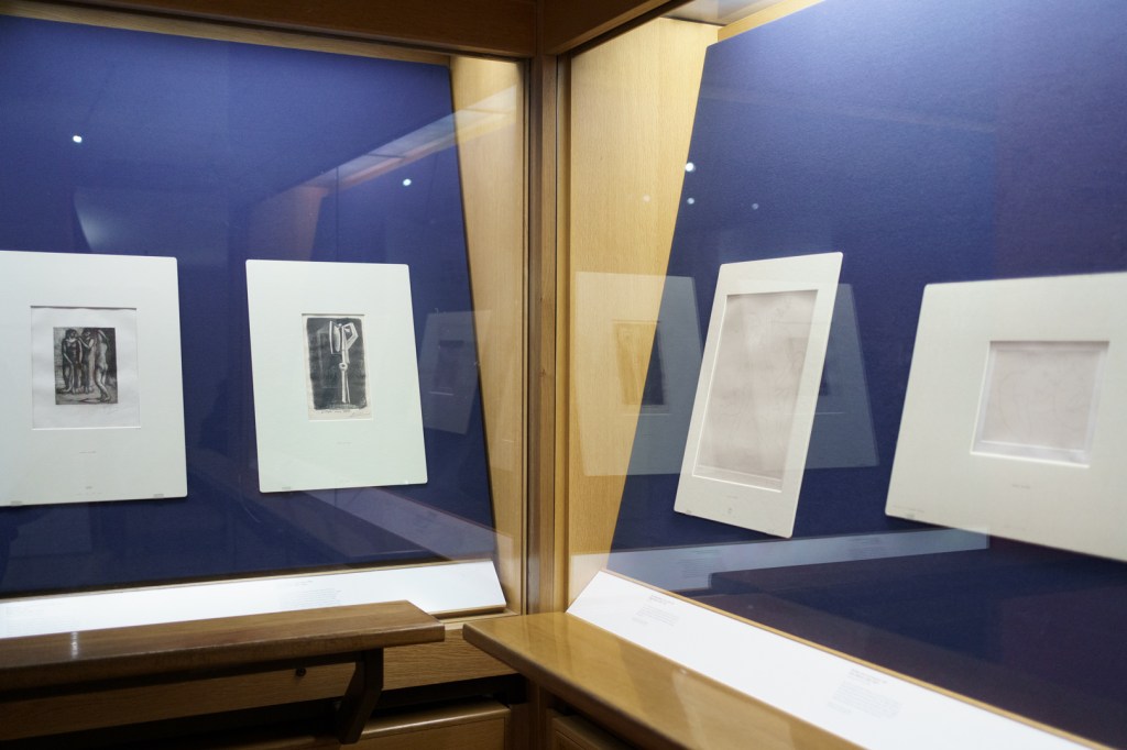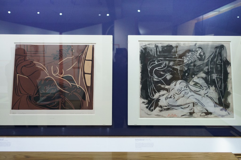 There is also a nod to Picasso’s variations after the Old Masters; three lithographs of David and Bathsheba illustrate progressive transformations of a Lucas Cranach painting. On the other side, a wall of five linocuts chart the successive states via the reduction linocut process to produce the multicoloured Still Life Under the Lamp (1962) at the end.