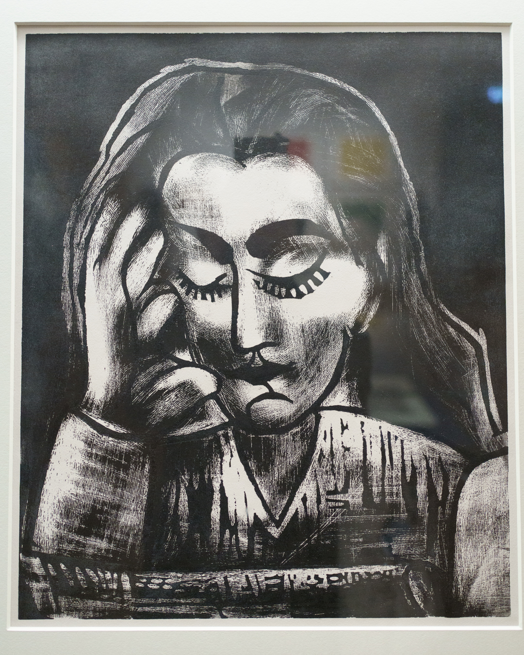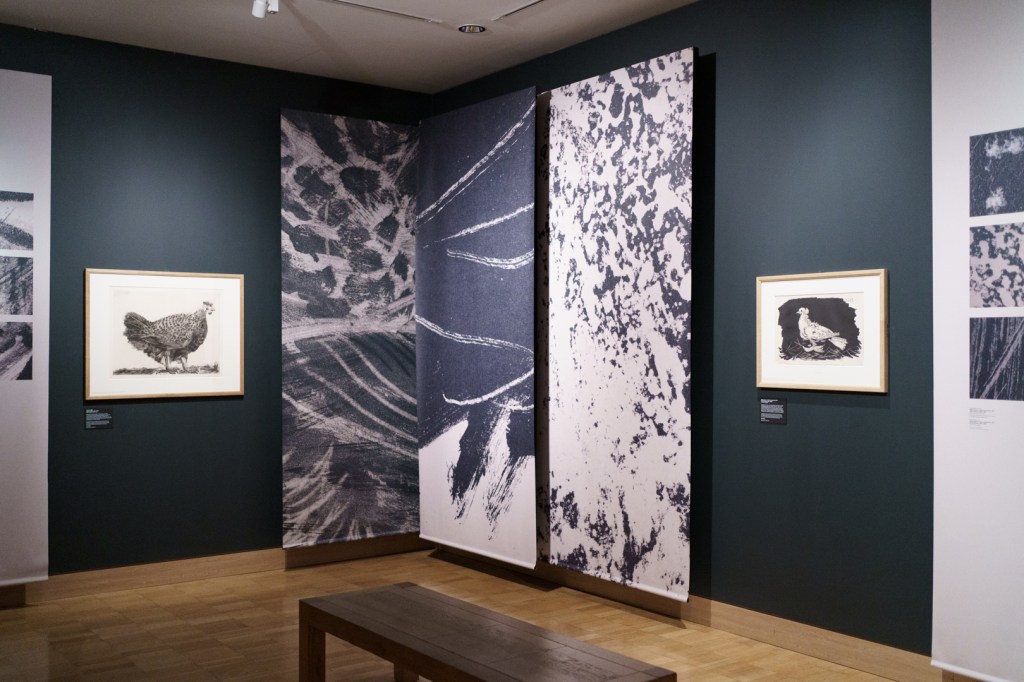 I especially appreciated a section displaying four different kinds of lithographs; one can really see the graphic differences between each one. Nearby are two linocuts where the same piece of lino has been reused from one, reinked differently, and then printed to create a variation.