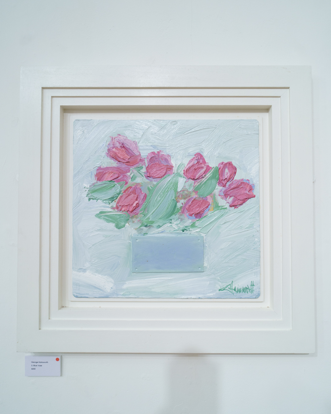 Hainsworth attributes his reawakened fascination with paint and colour to a vase of flowers, and it is easy to see why. There is a soothing playfulness at the sight of richly coloured petals, set against a minimalist background while green leaves provide a semblance of familiarity, acting like a mid-tone for our aesthetic experience. Even the vases have a character of their own, their forms created by adding paint, removing paint, or attaching pieces of wood to the surface.