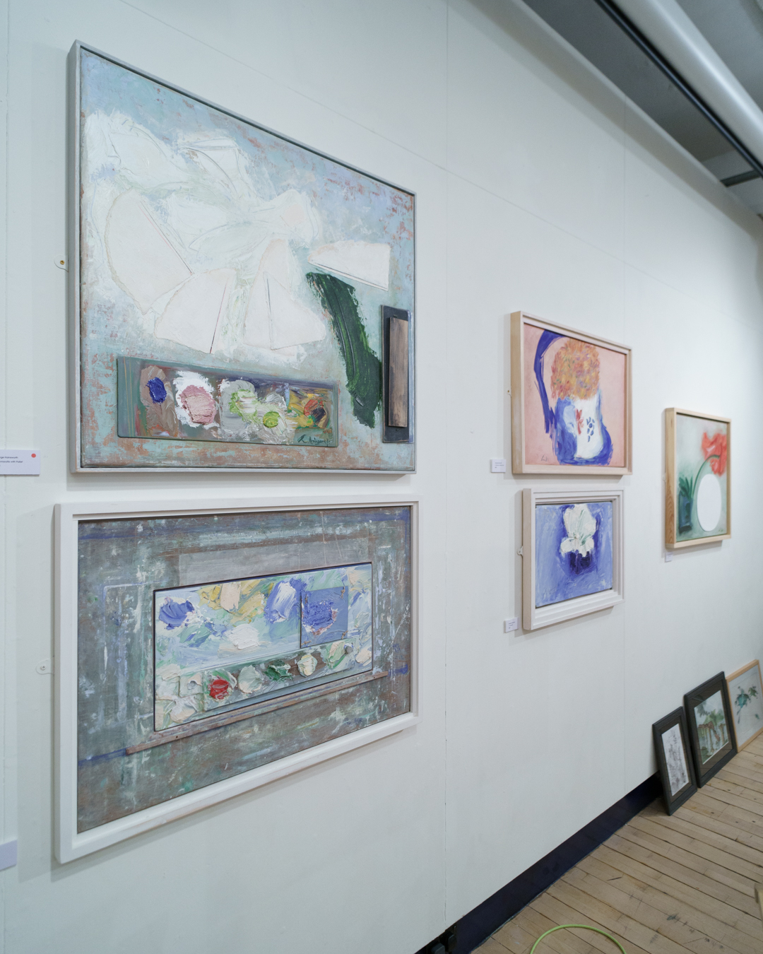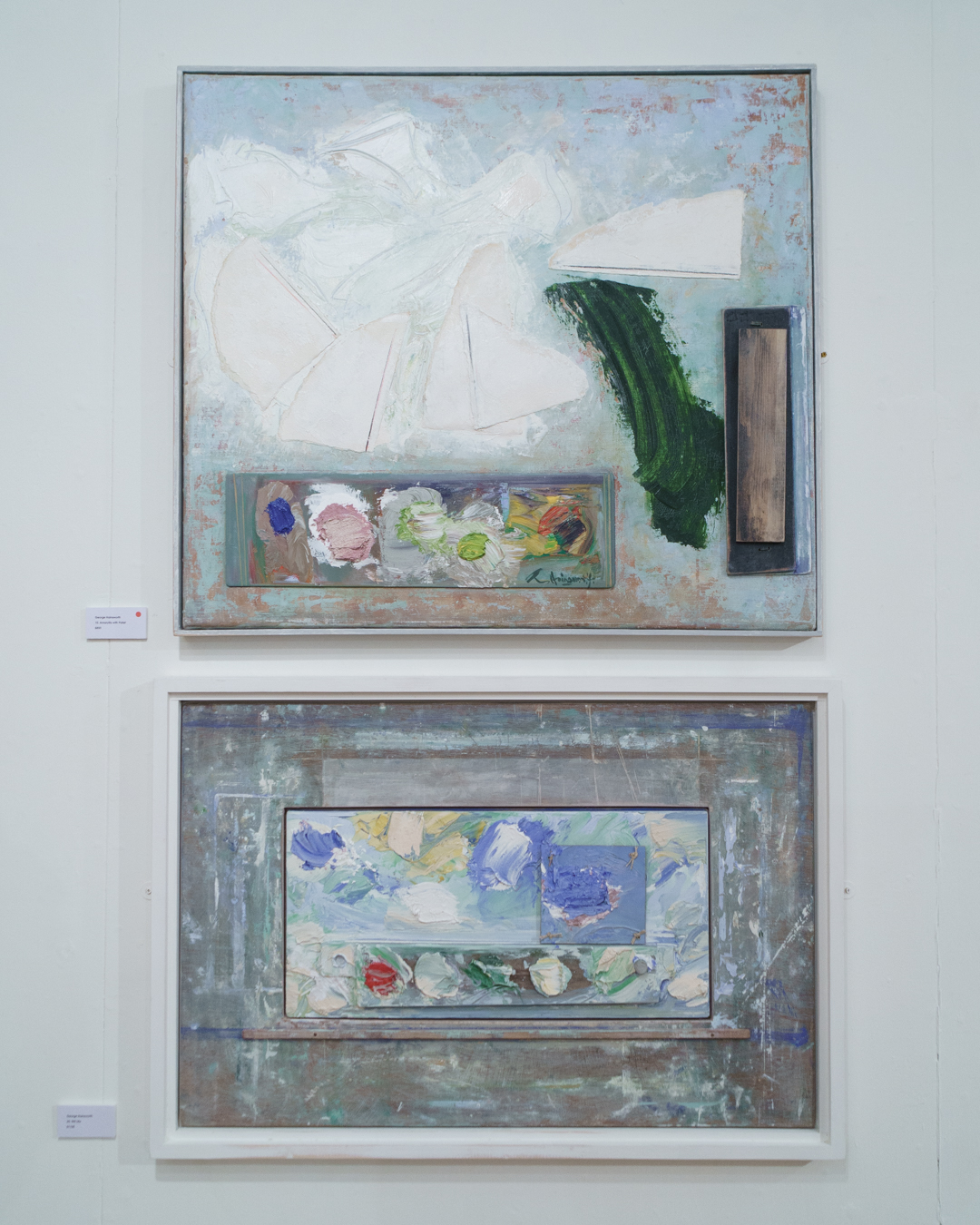 In some cases, an artist’s palette is incorporated within the ensemble, skirting the border between our physical space and the pictorial one. The viewer’s perception is tested even further with the use of matte surfaces, scraping, and impasto which add an element of dilapidation and physicality. In other words, their presence elevates them beyond decorative set pieces.