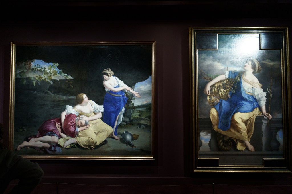 By contrast, there isn’t a single bad painting by Orazio in the show, which are practically luminous; one exception is the Bilbao version of Judith and Her Maidservant with the Head of Holofernes, here presented next to Artemisia’s Uffizi one. They were even able to project the duo’s celebrated Allegory of Peace and the Arts on to the ceiling of the opening, which originally adorned that of the Great Hall in the Queen’s House at Greenwich.