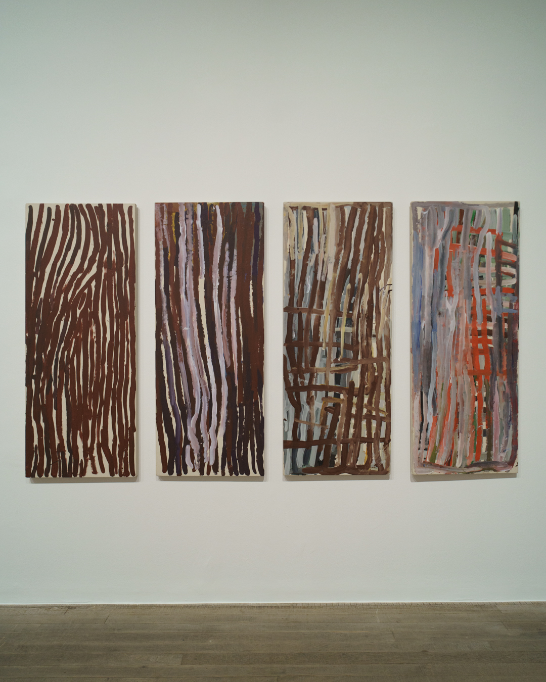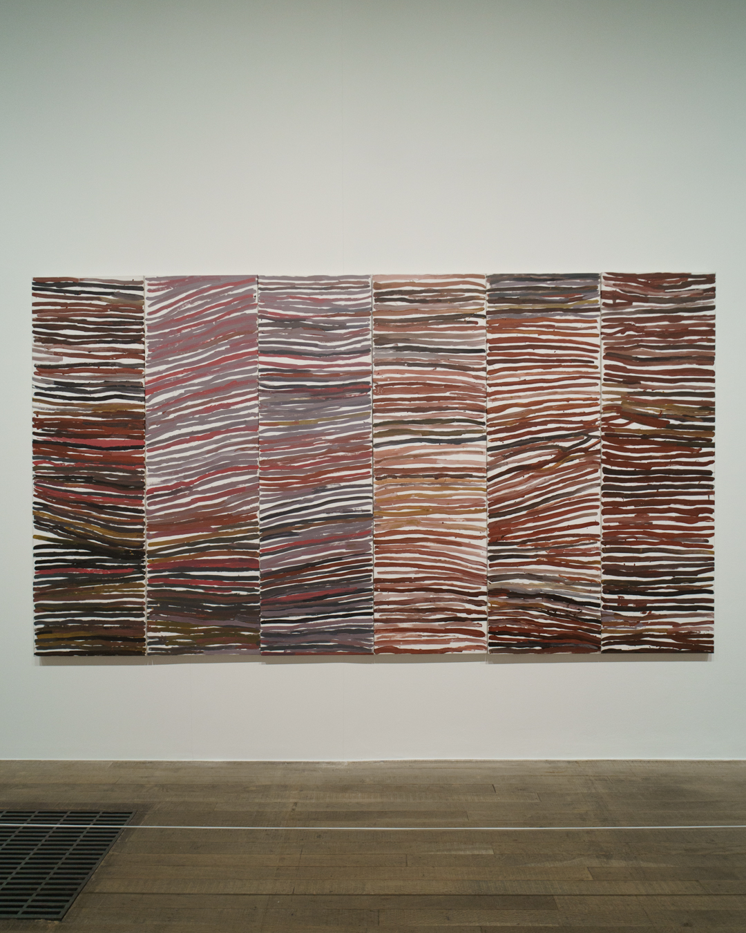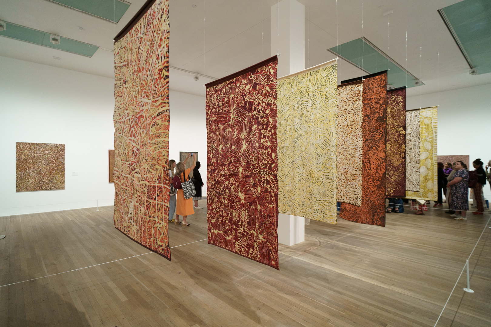Raised as an Anmatyerr woman, over 80 works by Kngwarray are on show, highlighting the ways she translated her ceremonial and spiritual engagement with her ancestral Country, Alhalker, into batik textiles and acrylic paintings. These include significant works like Emu Woman (1988), her first ever work on canvas that attracted widespread media attention, and The Alhalker Suite (1993), a vibrant portrait of her Country comprised of 22 canvases.