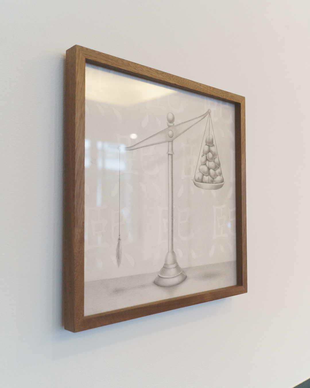 On the more concrete side of human experience, William GC Brown’s drawings and paintings present glimpses of observed narratives, while Samuel Zhang’s video In The Place Where We Left and Arrived (2022) highlights shared experiences of queer identity, rejection, racism, and cultural confusion in Chinese LGBTQ+ communities in the UK. The role of political narratives in shaping identities and a sense of belonging is also explored in Lydia Wong’s Crab, Ascend! (2024), a kite representing the spirit of the crab rising from the earthly realm to the metaphysical realm.