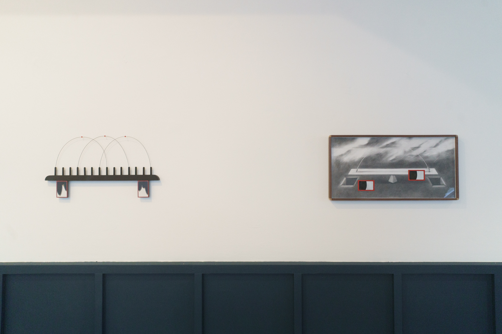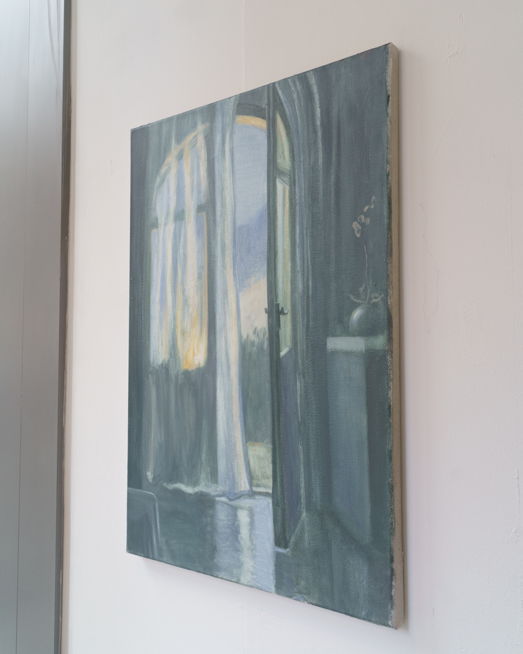 There is something quite poetic about entering the space through double doors and immediately seeing Pavel Isupov’s Doorway at Dusk (2024), where an open door invites you back outside again. This feeling of circularity and in-betweenness in one’s life experiences underpins the show’s curatorial endeavours and Seihee Cho’s drawing Bare House (2023) highlights what such a solitary landscape might look like.