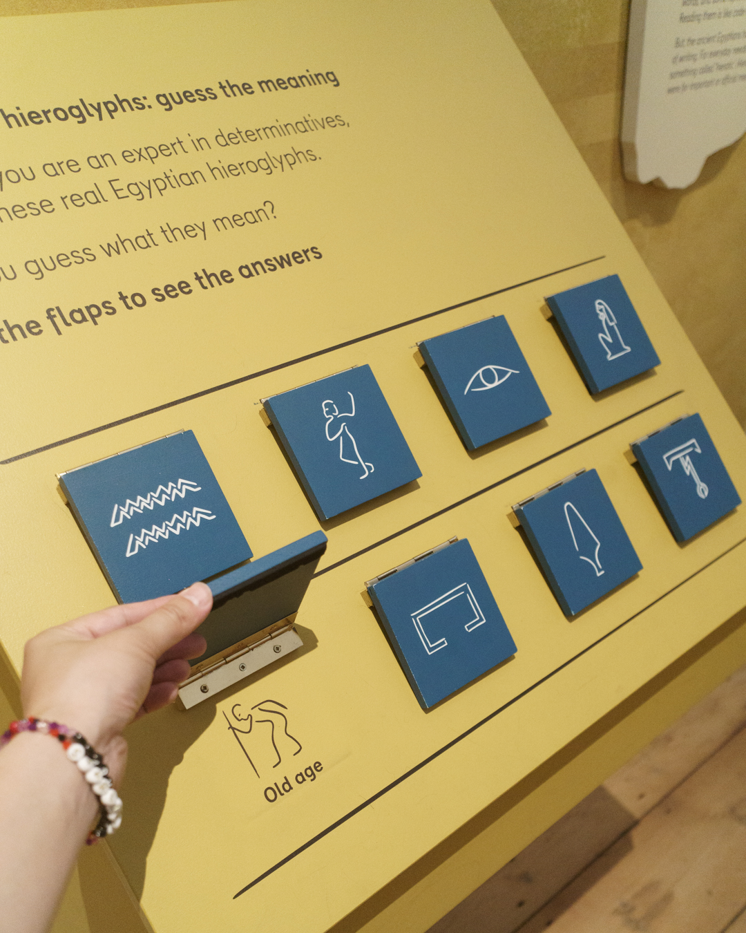 Spread out over three sections – Storytelling, Communicating, and Making – the assortment of displays give you a crash course in practically everything you ever wanted to know about Ancient Egypt. How do you read hieroglyphs? What colours did they use and what do they signify? Did you know they drew grids as an underdrawing to aid with their precise wall paintings? How were the pyramids built?