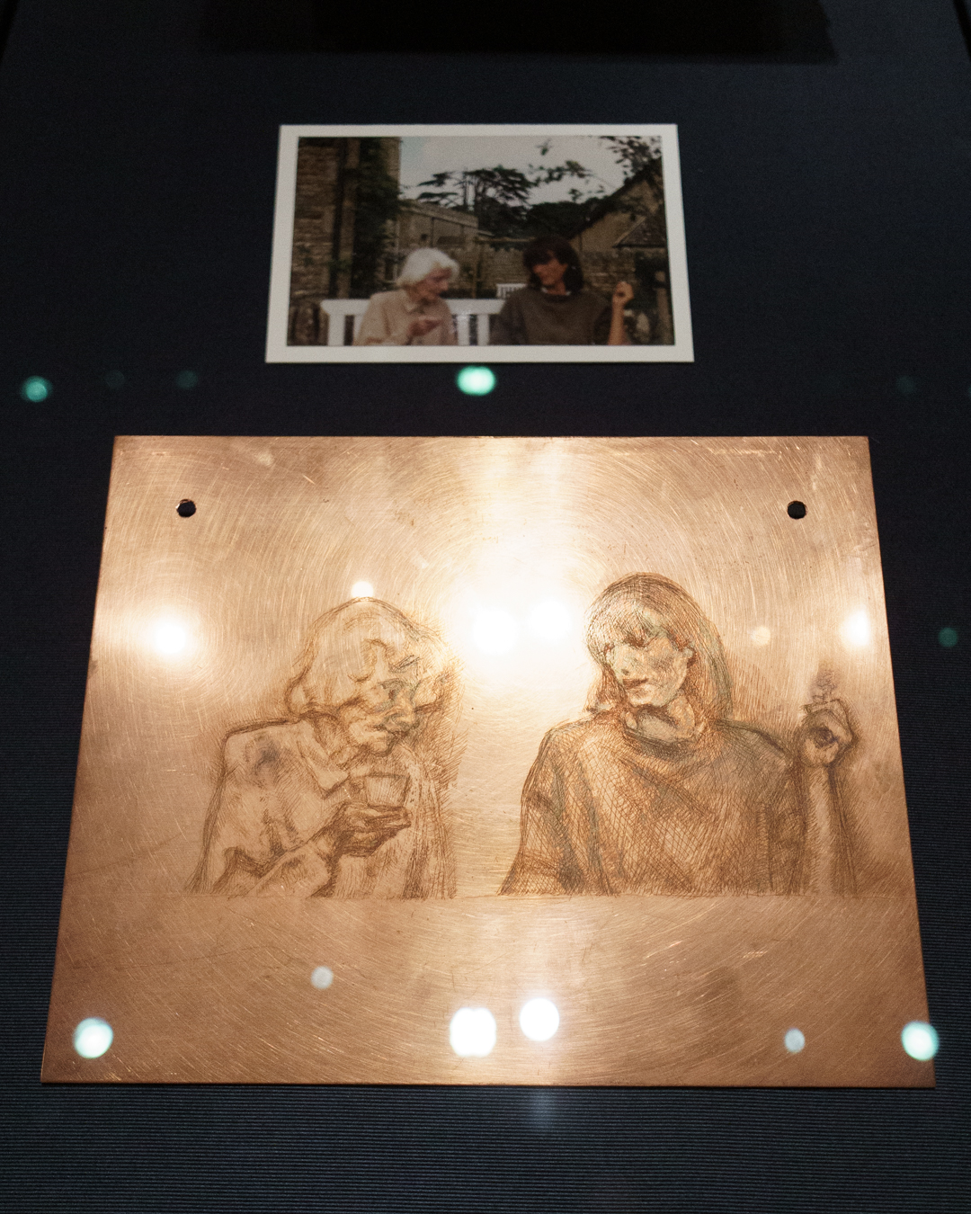 Meanwhile, a central display highlights Freud’s close friend Susanna Chancellor, who would become a recurrent sitter throughout his career. One of the sketchbooks shows a large portrait of her drawn in charcoal. More interesting for me is the etching plate for Conversation (1999), shown next to a photograph of Susanna with her mother-in-law taken several years before the etching was begun.