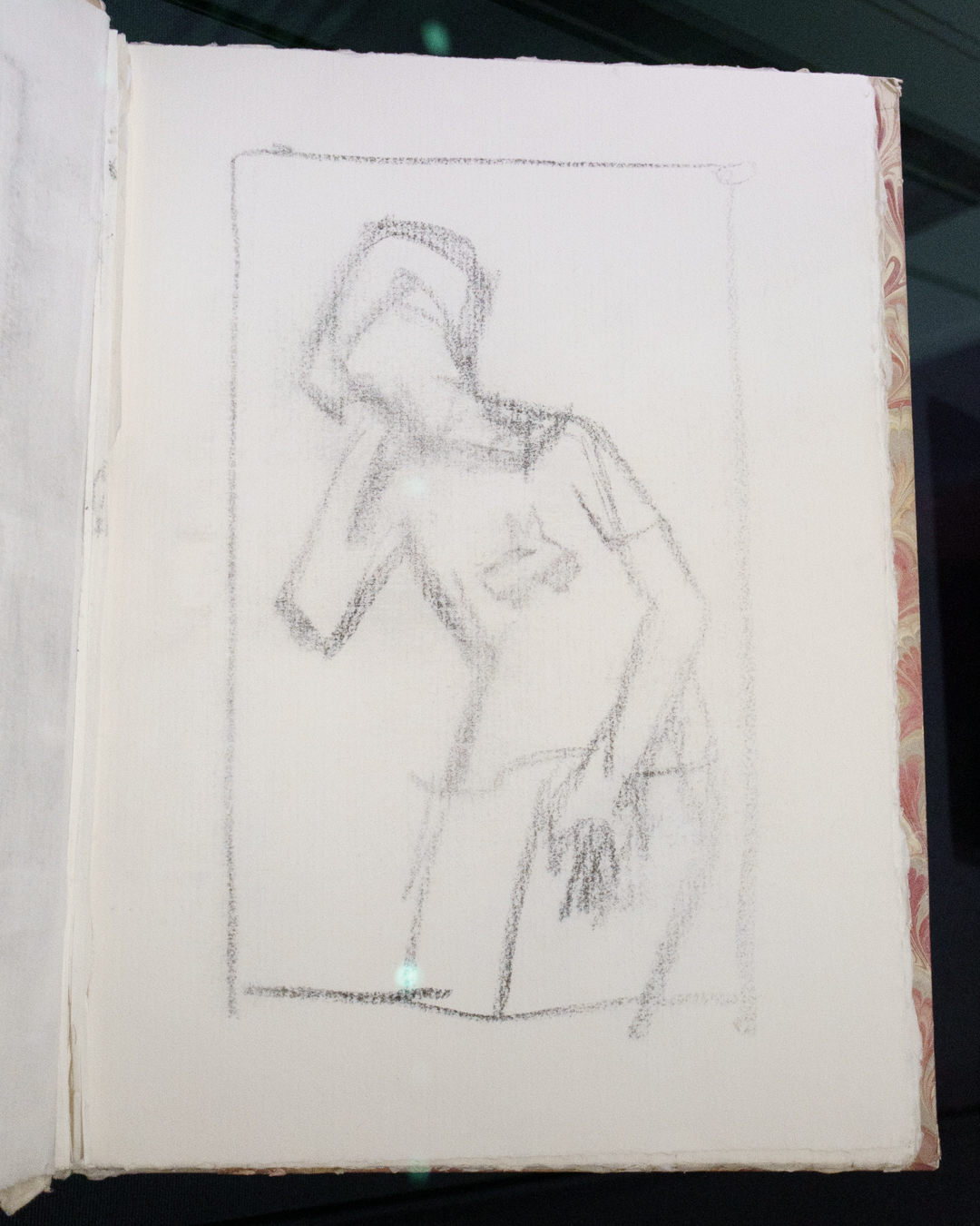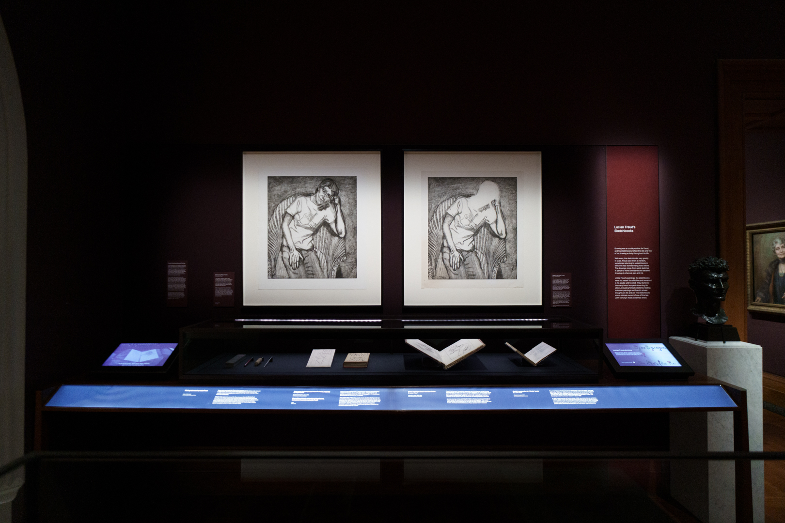 Focusing on Freud’s draughtsmanship and printmaking, the display brings together a pair of newly acquired etchings depicting his daughter Bella in her Pluto T-shirt (1995); one is a trial proof from before her facial features were drawn in. Below them is a sketchbook open to a rudimentary sketch for the etching to establish Bella’s basic posture.