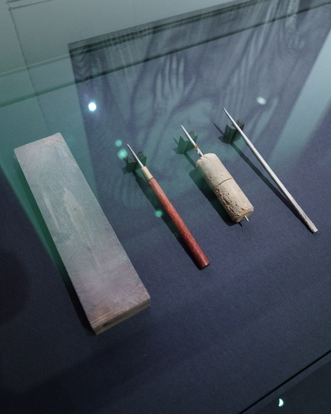 Freud’s etching tools are also present, consisting of an etching stone and three etching needles. Curiously, one of the needles is a makeshift etching needle made by Freud from two corkscrews.