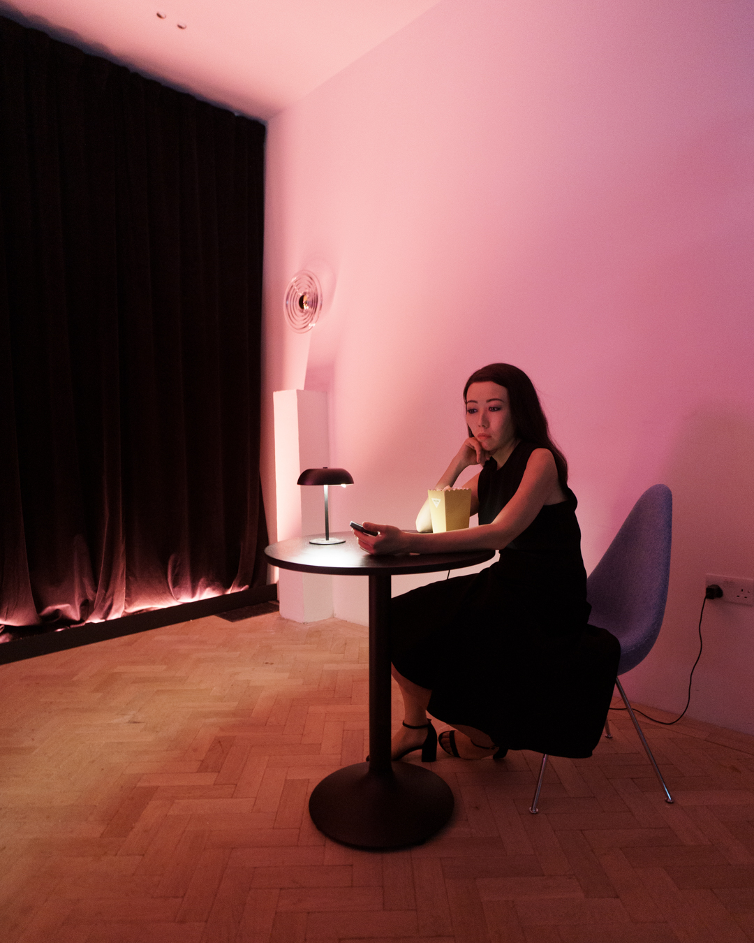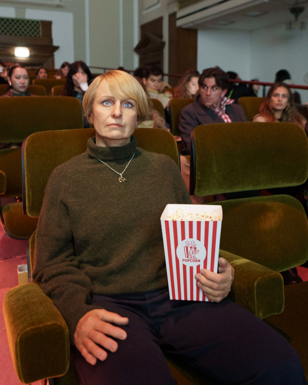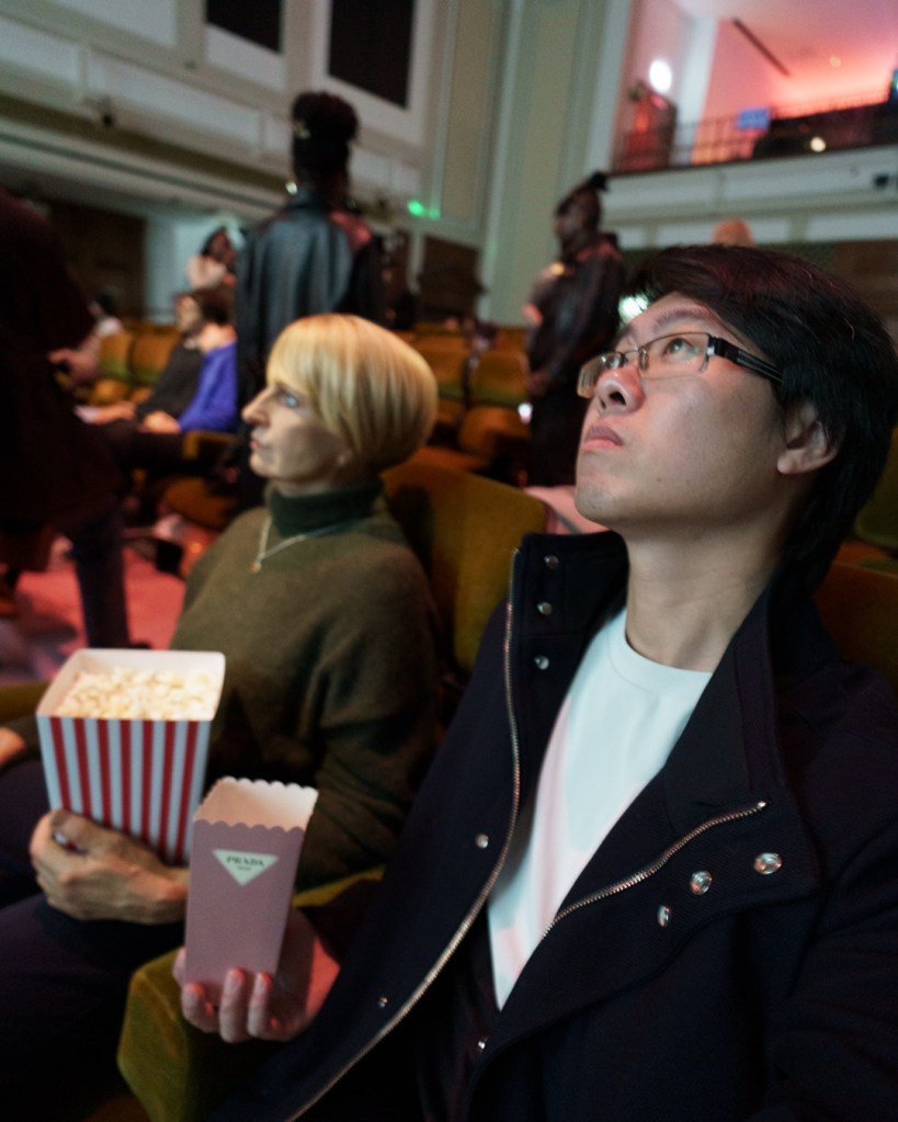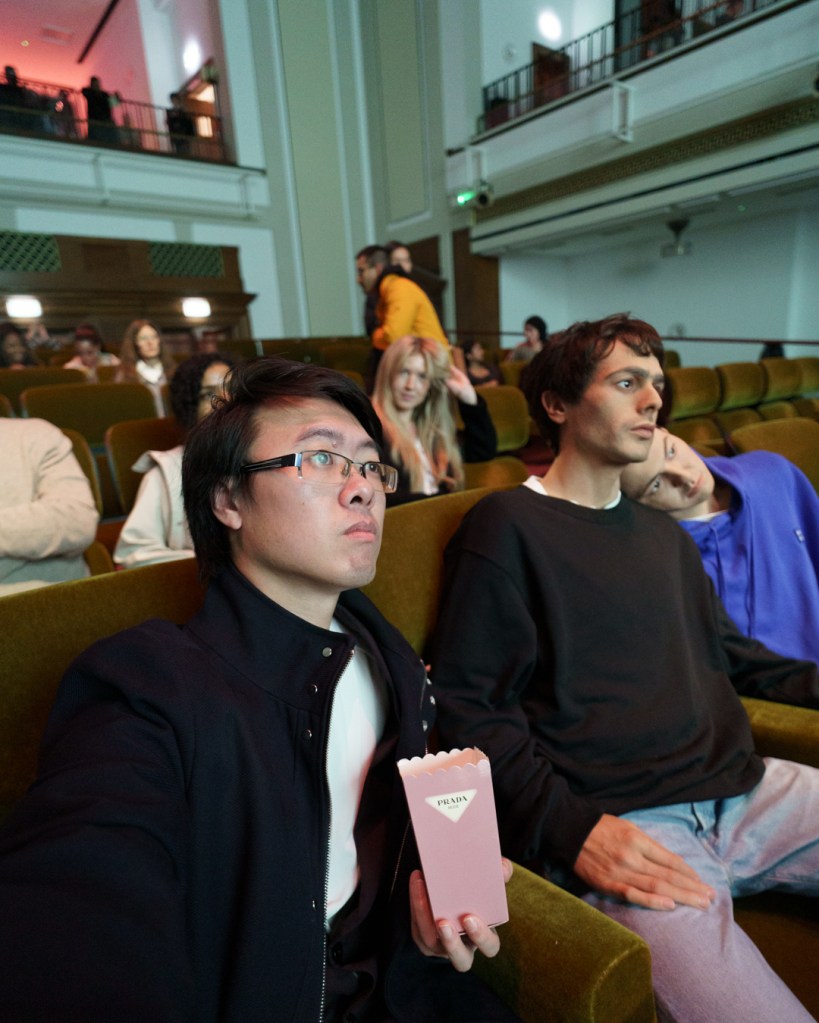 Early visitors could even grab free popcorn in branded boxes to complete the immersion. However, there were also genuine participants, sat elsewhere, watching the film, but also watching us. Overall, it’s like people-watching on steroids and social anxiety.