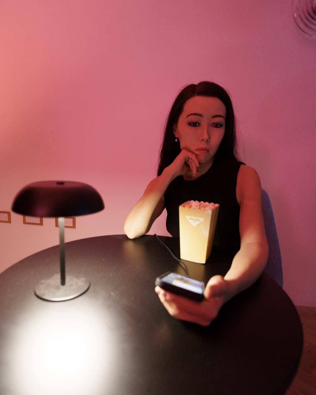 Meanwhile, at the bar on the upper mezzanine, a young woman sits alone at a table, staring into her phone. She seems to be on a FaceTime call with a companion who is talking about his recent breakup. This is The Conversation, another hyper-realistic sculpture that is unsettlingly convincing given the setting. How many of us haven’t sat alone at a bar staring into our phones? The artwork reframes our understanding of companionship and solitude in the digital era, seeking the comfort of virtual intimacy rather than pursuing connections in physical reality.