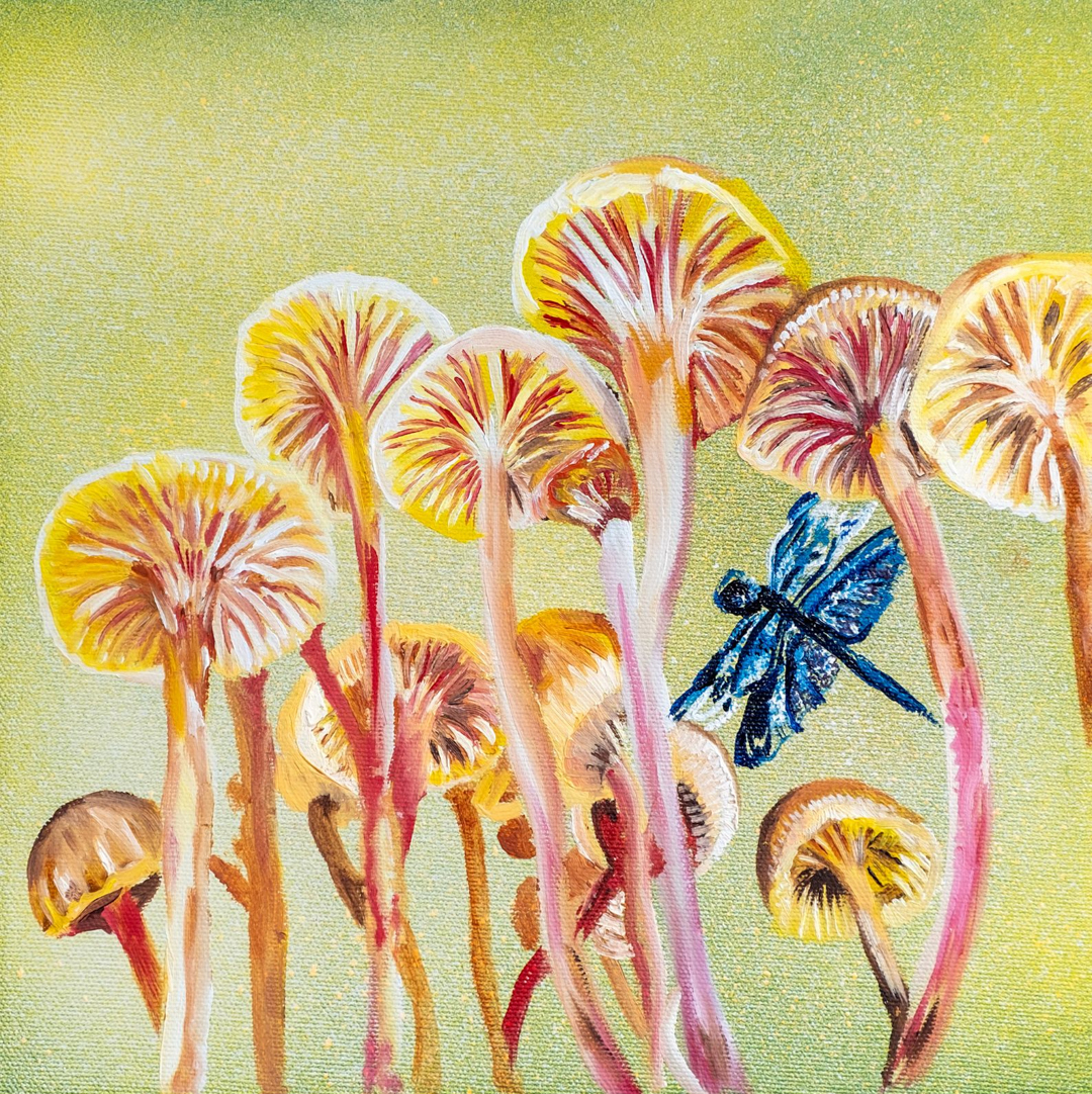However, the most unexpectedly poignant part of the Transit series happens to be Aksoy’s depictions of fungi which, depending on species, can have either healing or hallucinogenic properties. The cells of mushrooms are also highly regenerative and adaptable, making them close equivalents to stem cells in humans. This duality manifests itself as nature’s restorative agent in Aksoy’s paintings, one that shamans have exploited as ritualistic aids and to induce ascendant visions. Additionally, artists like Yayoi Kusama – whom Aksoy admires – have been known to consume hallucinogenic mushrooms as part of their creative practice.
